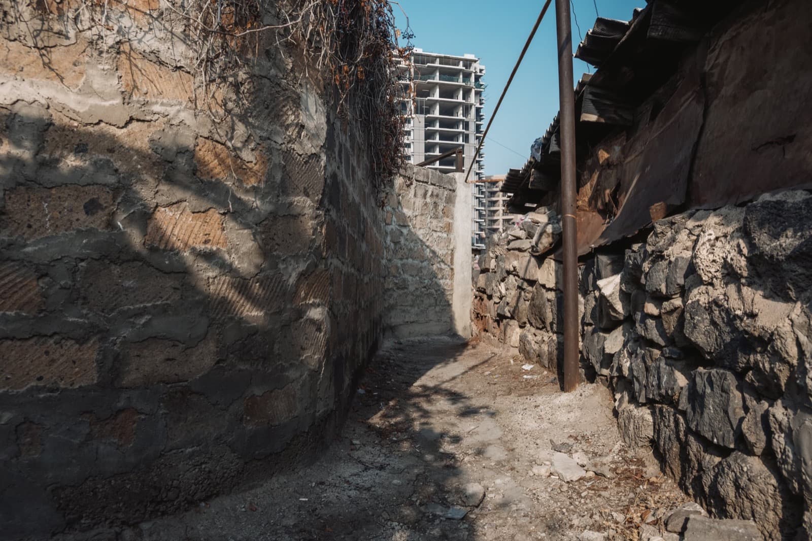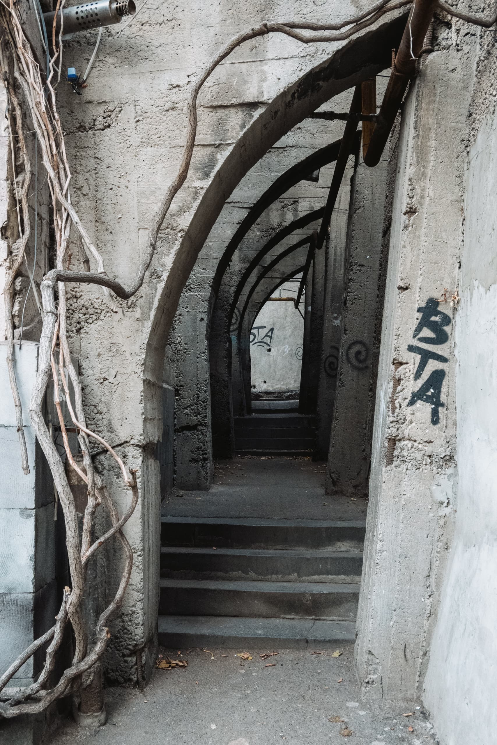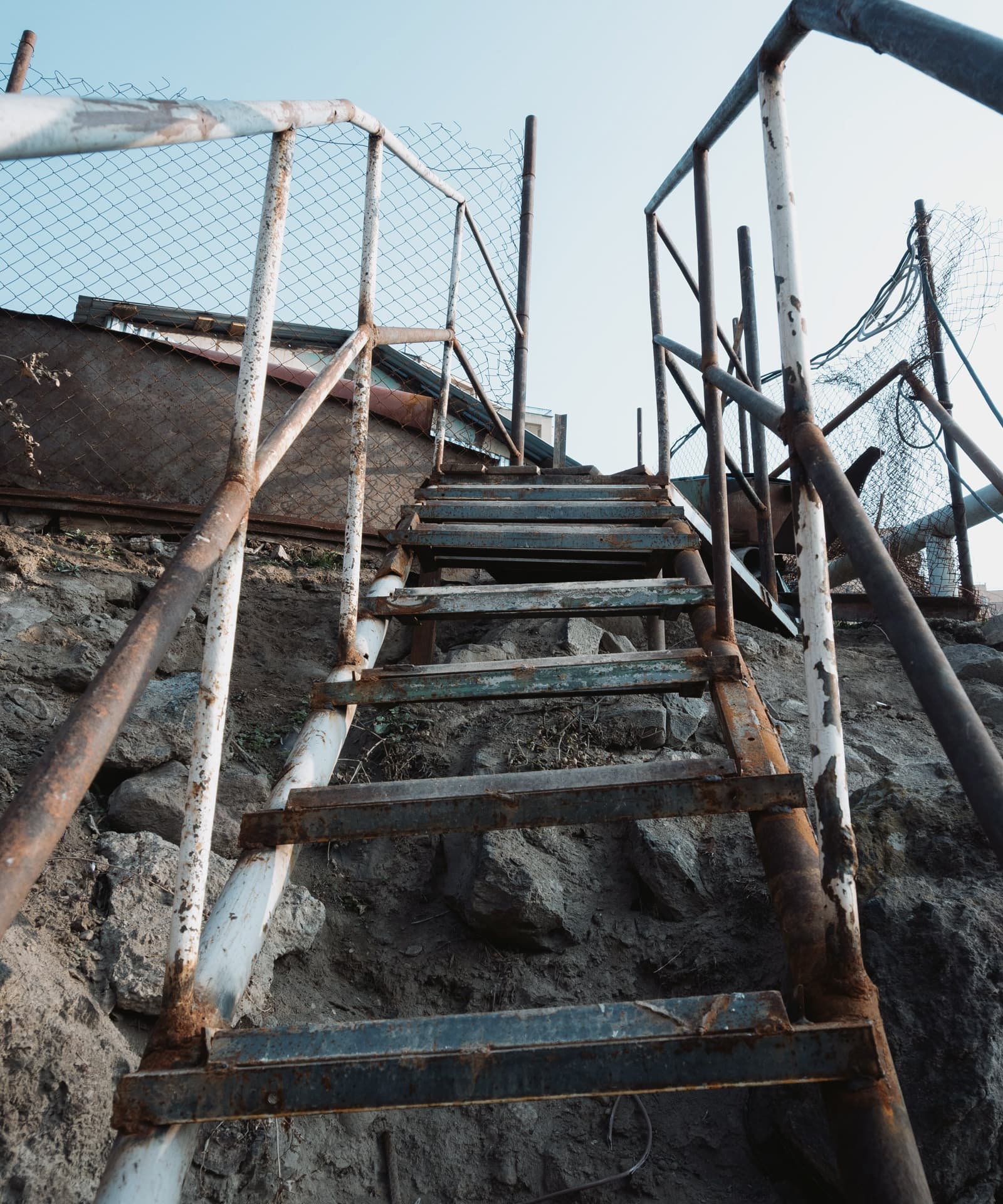 Как раз в районе акведука, карта ОСМ подсказала нам, что есть какая-то хитрая тропинка, которая может провести нас наверх. Мы поверили народной карте, пересекли Арташатский канал, разными хитрыми проходами вышли к крутой железной лестнице, которая в итоге вывела нас к стройке... Тупик. Пришлось развернуться и тем же заковыристым маршрутом вернуться на железную дорогу, чтобы найти другой способ подняться на нависающую над нами стену.