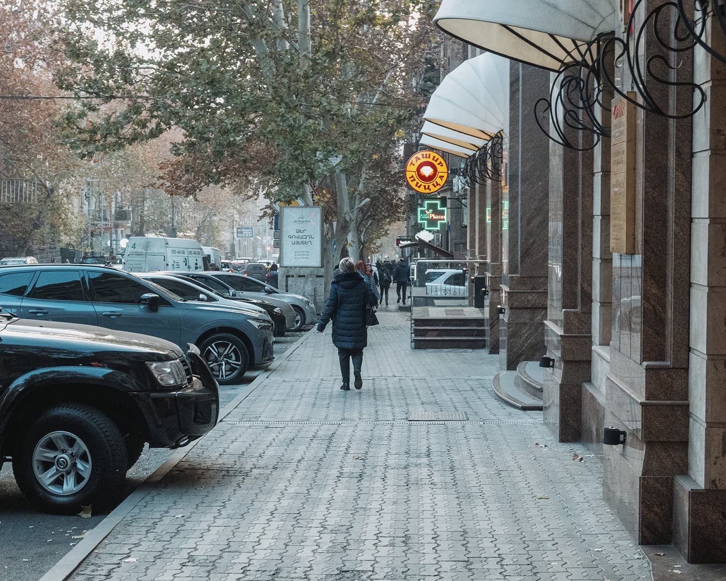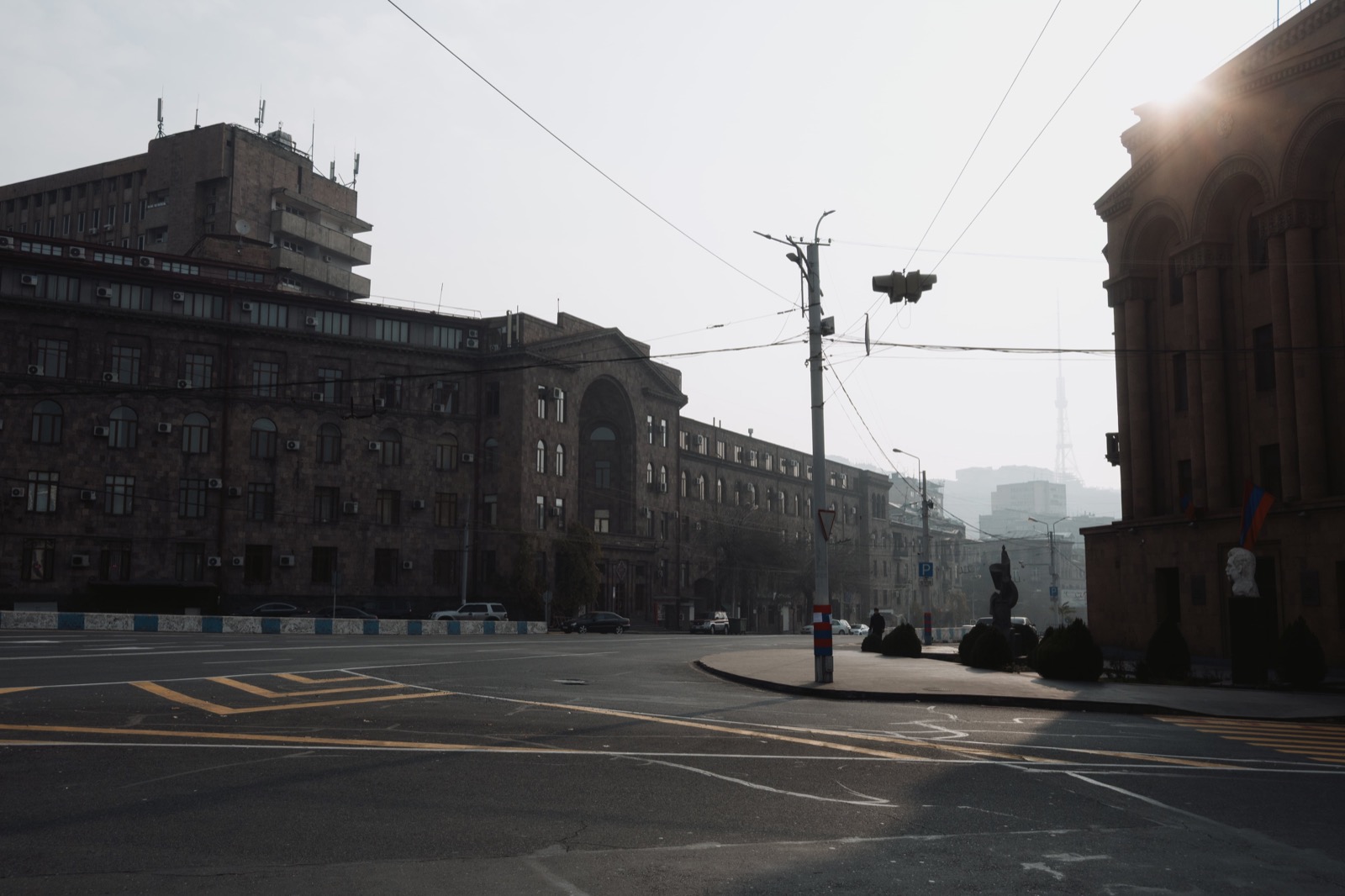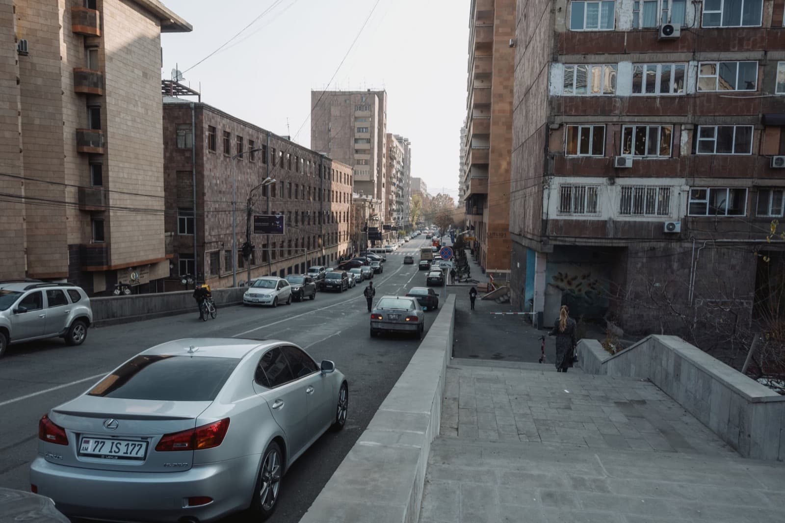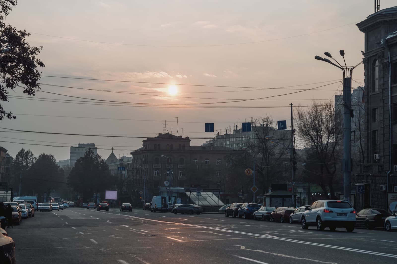 Когда вышли на улицу, солнце уже клонилось к горизонту, и перед глазами предстал типичный осенне-зимний ереванский закат. Это когда вроде бы ясно, но из-за тяжёлой дымки солнечный свет приглушён, и до стен и асфальта добираются лишь мягкие рыжеватые отблески. Получается странный эффект: будто одновременно и солнечно, и пасмурно, и два этих вайба сливаются в одно.