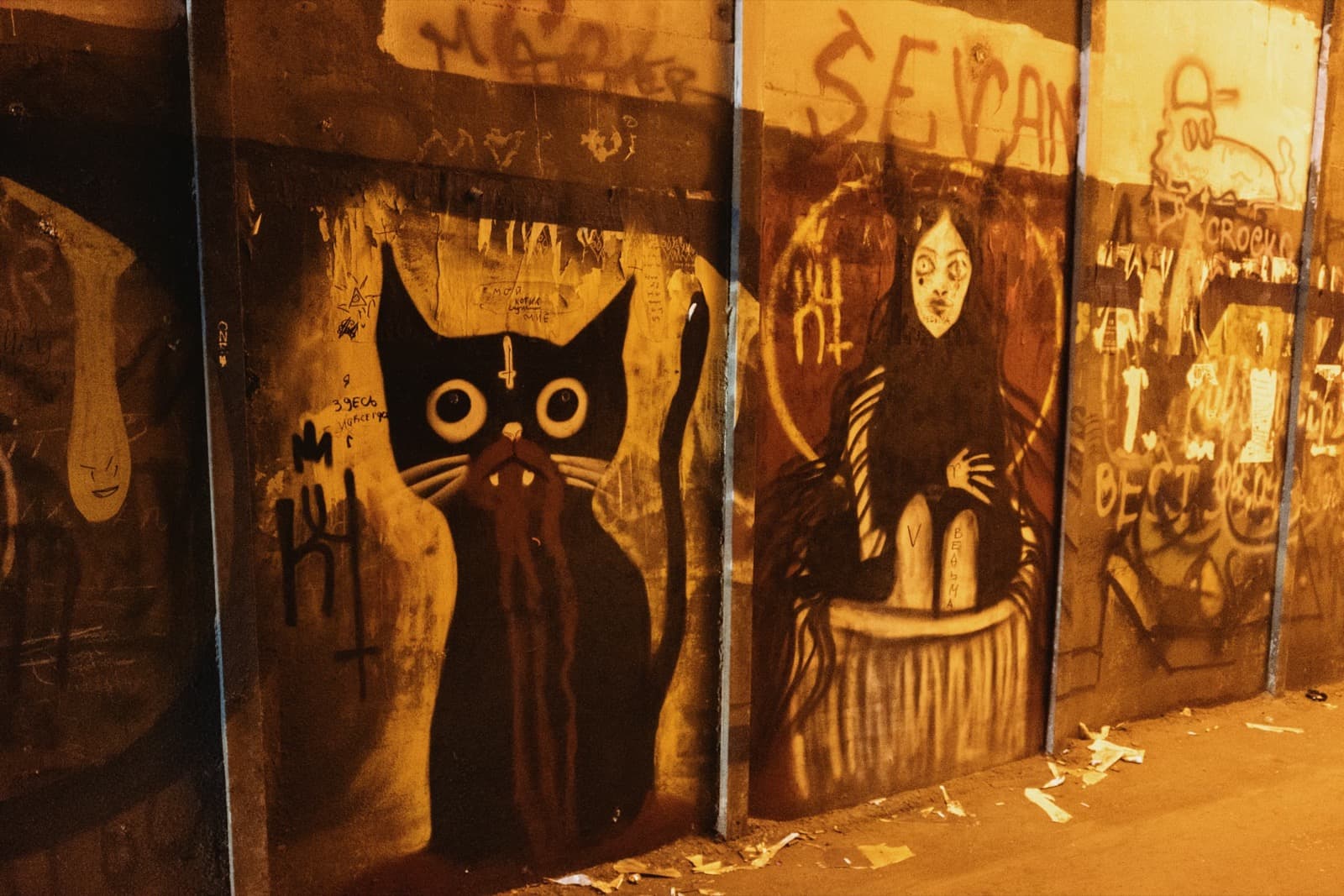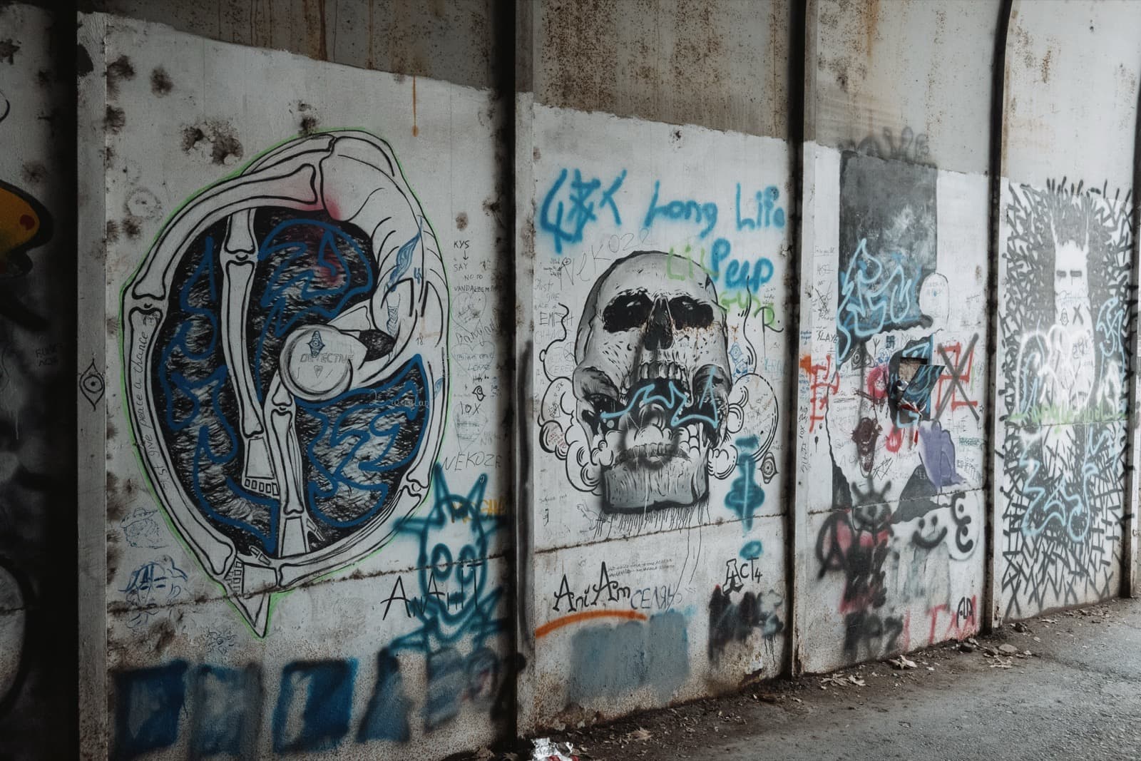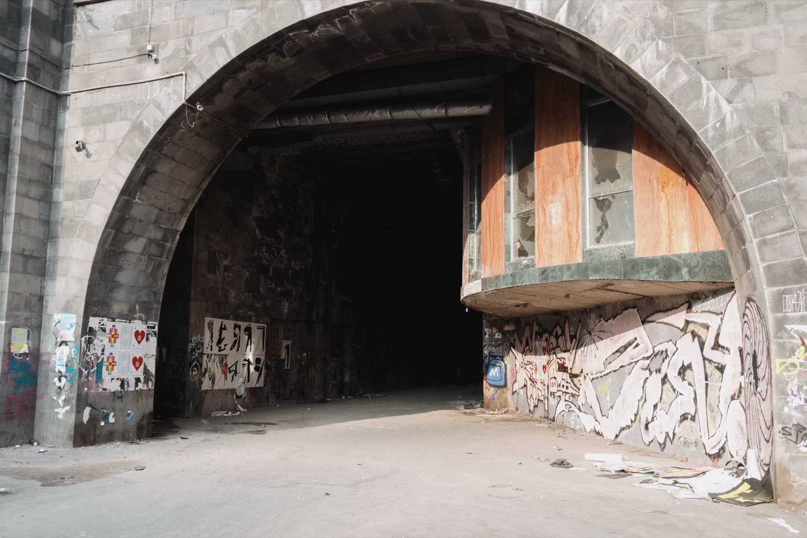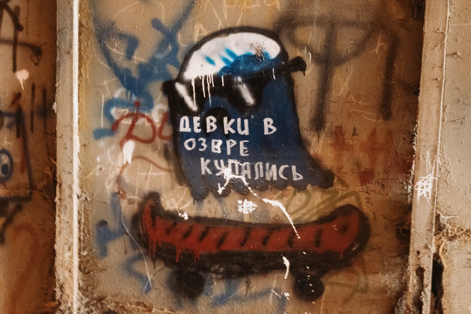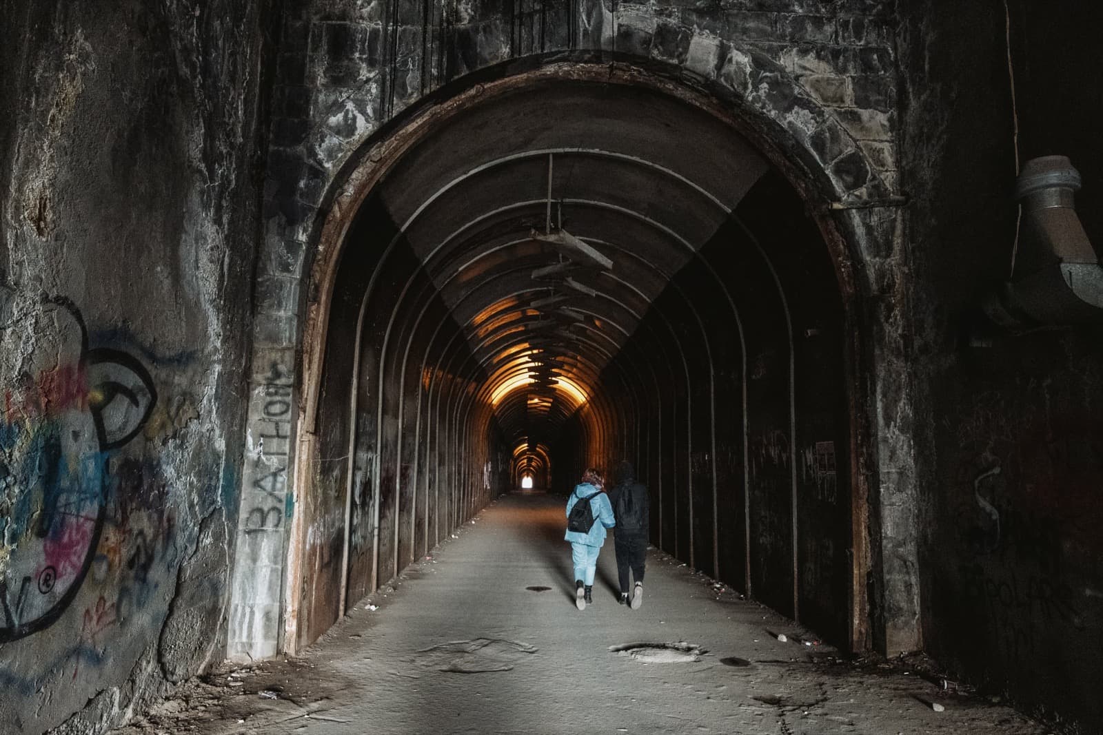 А ещё со временем тоннель превратился в своеобразную галерею стрит-арта: его стены от начала и до конца покрыты надписями, рисунками, граффити. Здесь есть всё — от банальных автографов маркером до вполне изобретательных картинок. Политические лозунги, похабщина, фантазии… Кто-то считает это вандализмом. А мне нравится: без этого графического безумия пространство выглядело бы куда скучнее. И тот надрыв, что читается во многих рисунках, здорово перекликается с состоянием самого тоннеля: он уже не строит планов, а словно смиренно ждёт, когда своды треснут и горная порода перекроет артерию.