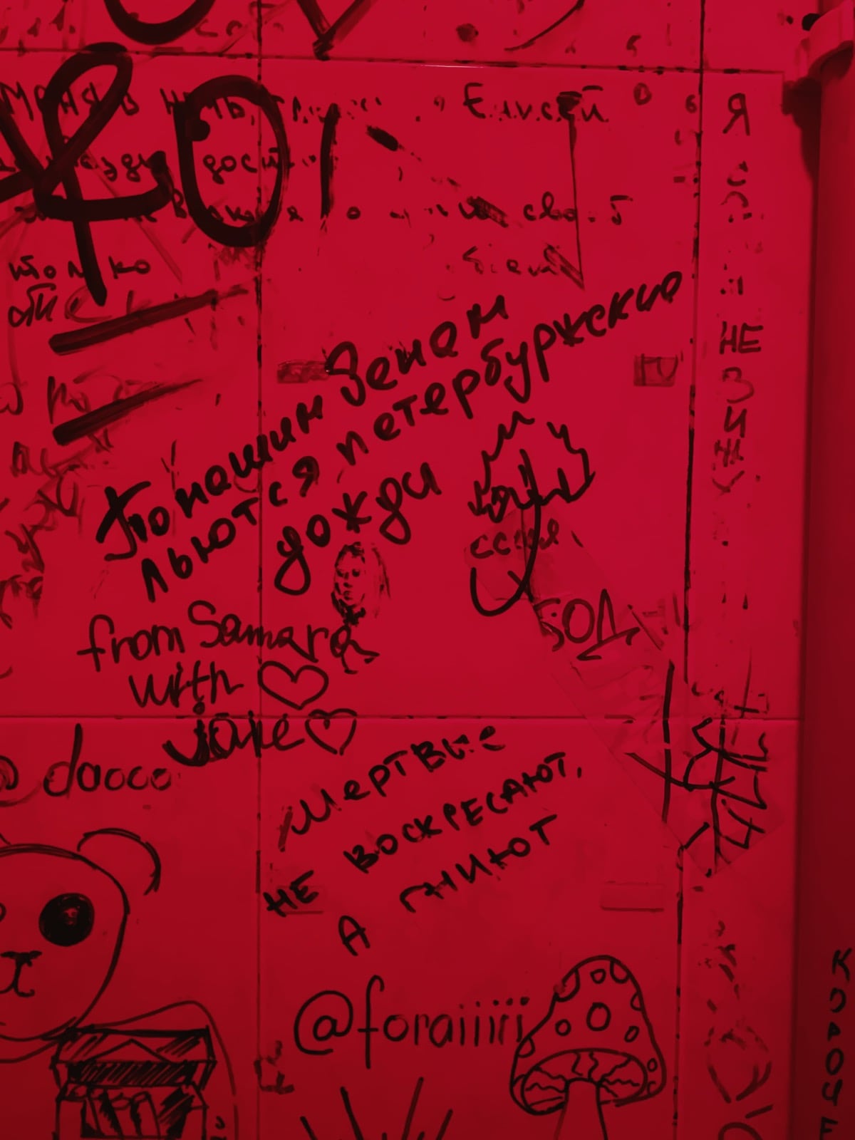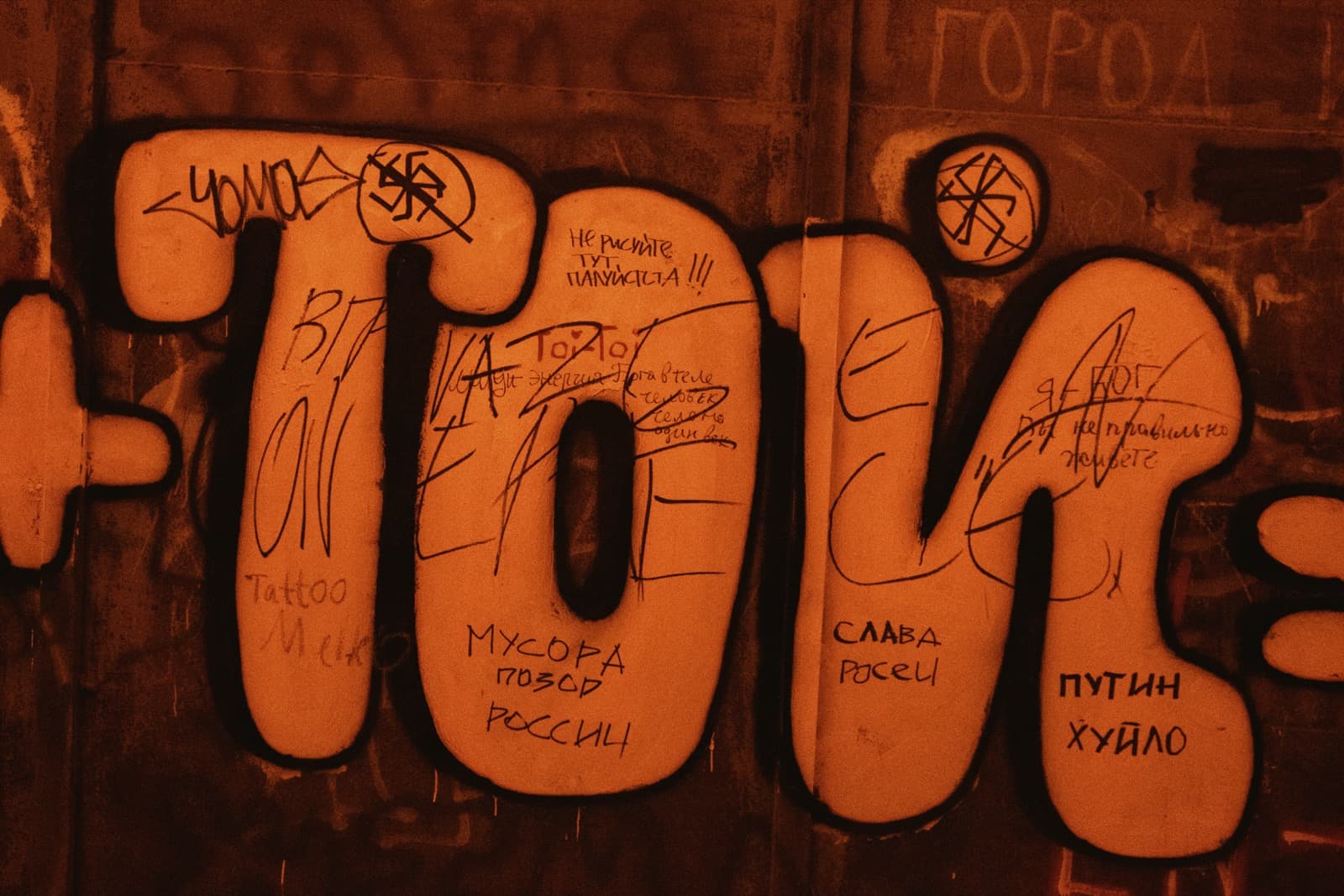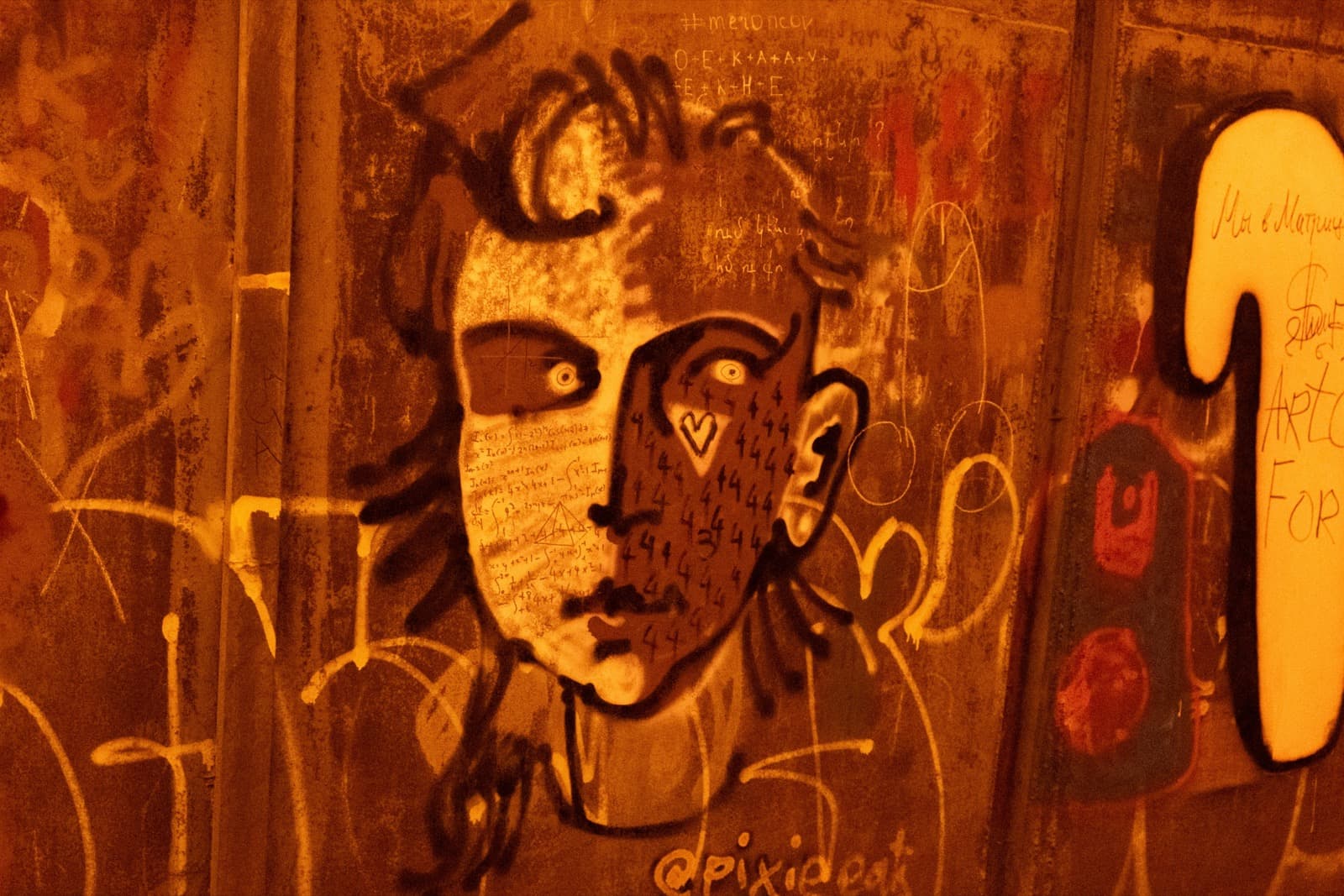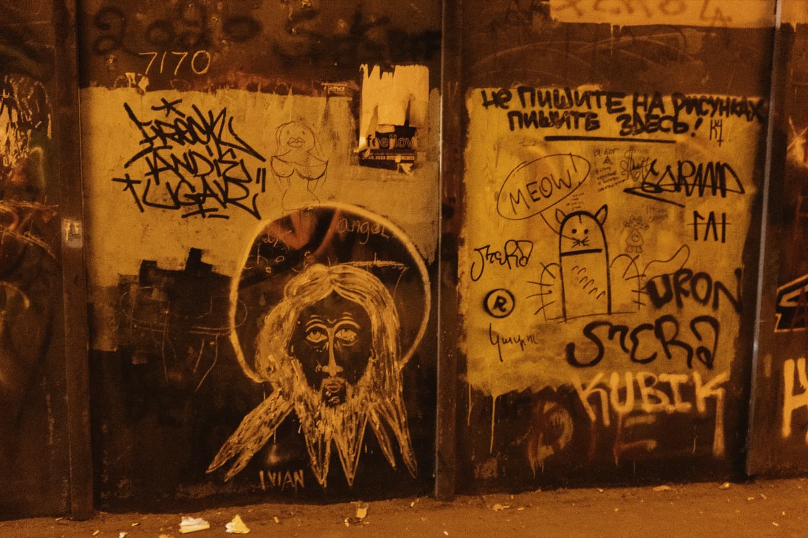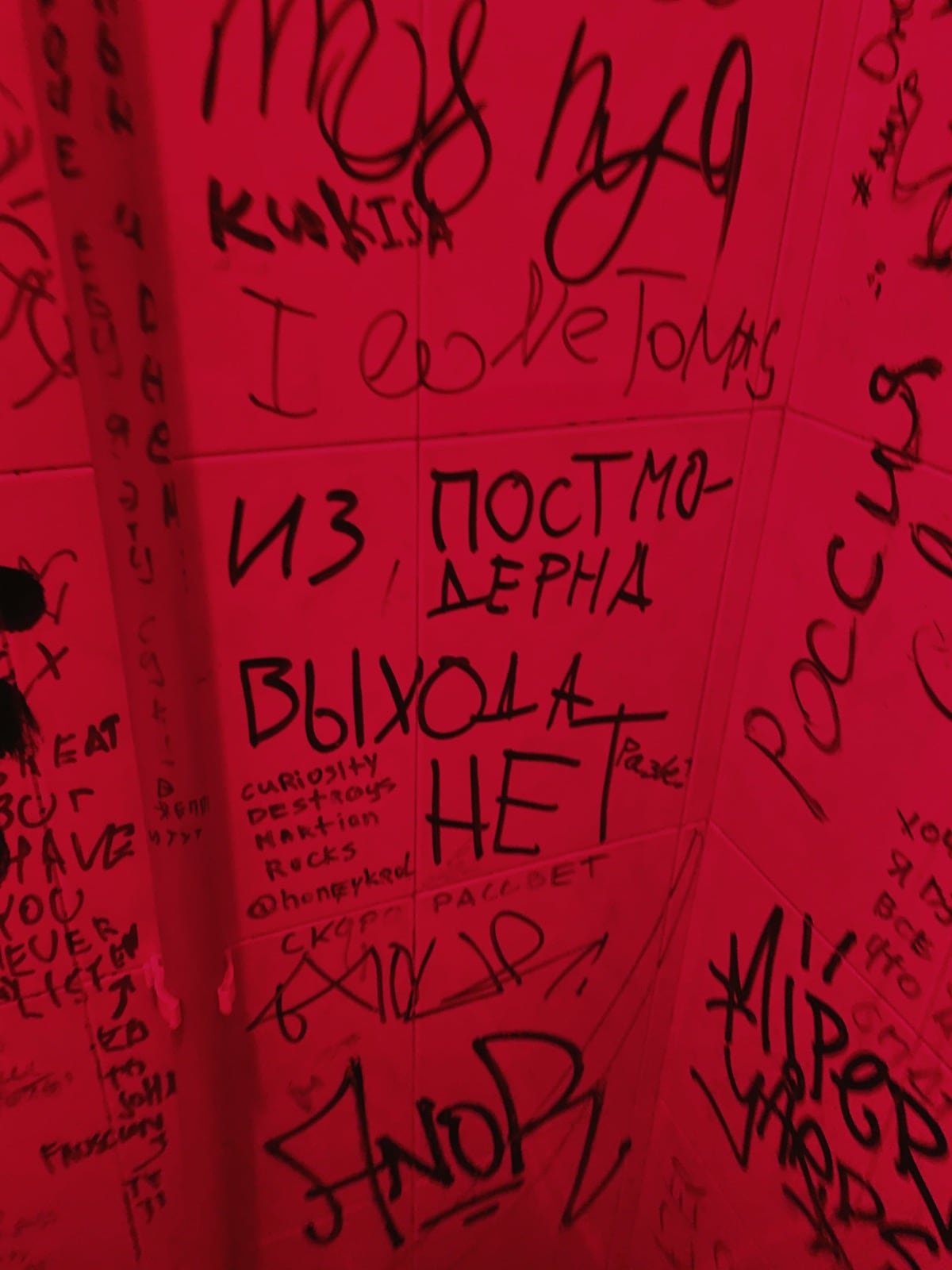 А ещё со временем тоннель превратился в своеобразную галерею стрит-арта: его стены от начала и до конца покрыты надписями, рисунками, граффити. Здесь есть всё — от банальных автографов маркером до вполне изобретательных картинок. Политические лозунги, похабщина, фантазии… Кто-то считает это вандализмом. А мне нравится: без этого графического безумия пространство выглядело бы куда скучнее. И тот надрыв, что читается во многих рисунках, здорово перекликается с состоянием самого тоннеля: он уже не строит планов, а словно смиренно ждёт, когда своды треснут и горная порода перекроет артерию.