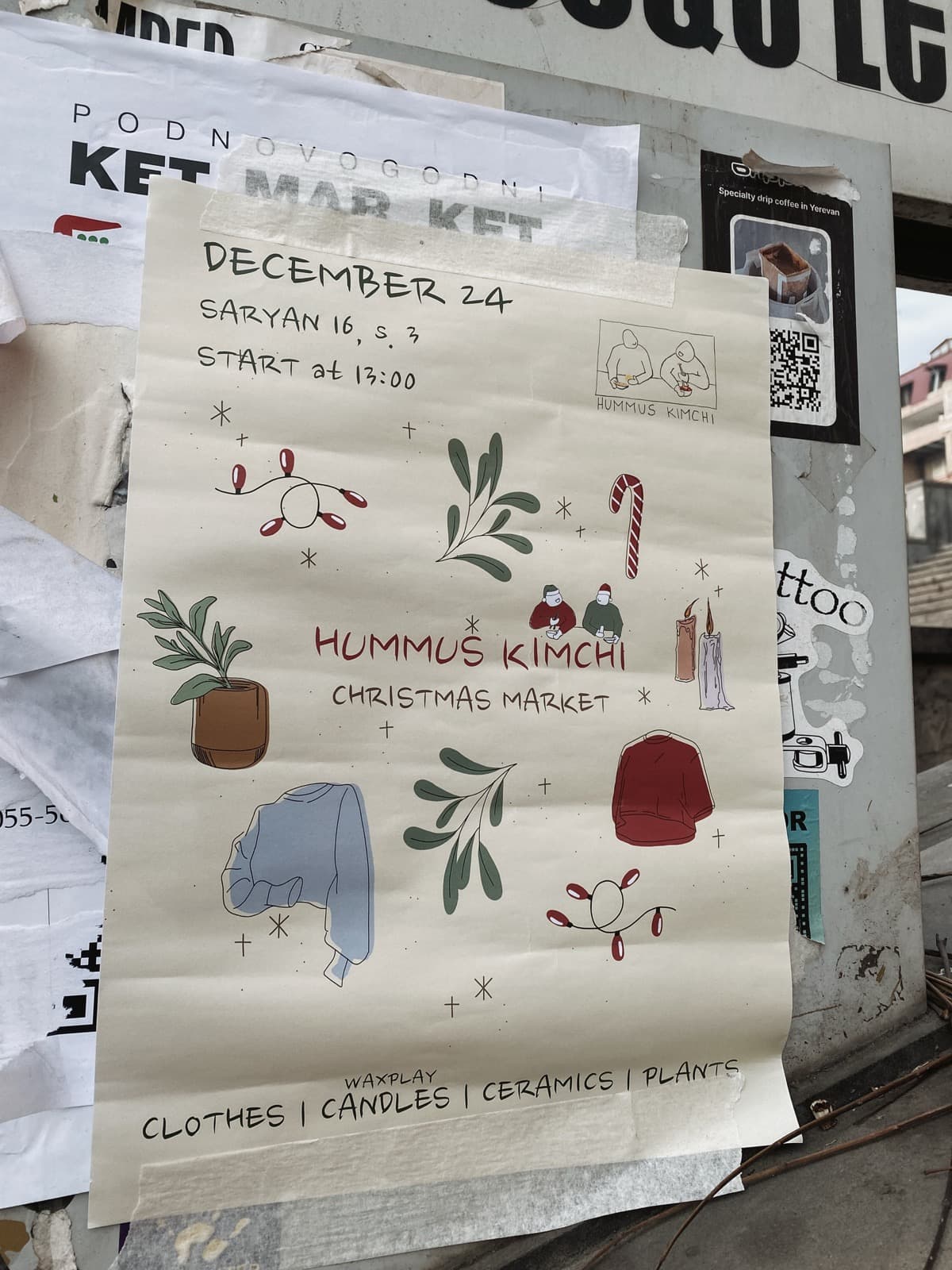 Помимо украшений, привлекали внимание многочисленные плакаты. Одни из них активно зазывали на рождественско-новогодние мероприятия. Другие же плакаты и стикеры пытались напомнить, что в эти самые дни под боком разворачивалась страшная гуманитарная катастрофа, которая через девять месяцев приведёт к исходу десятков тысяч человек из своих родных домов...