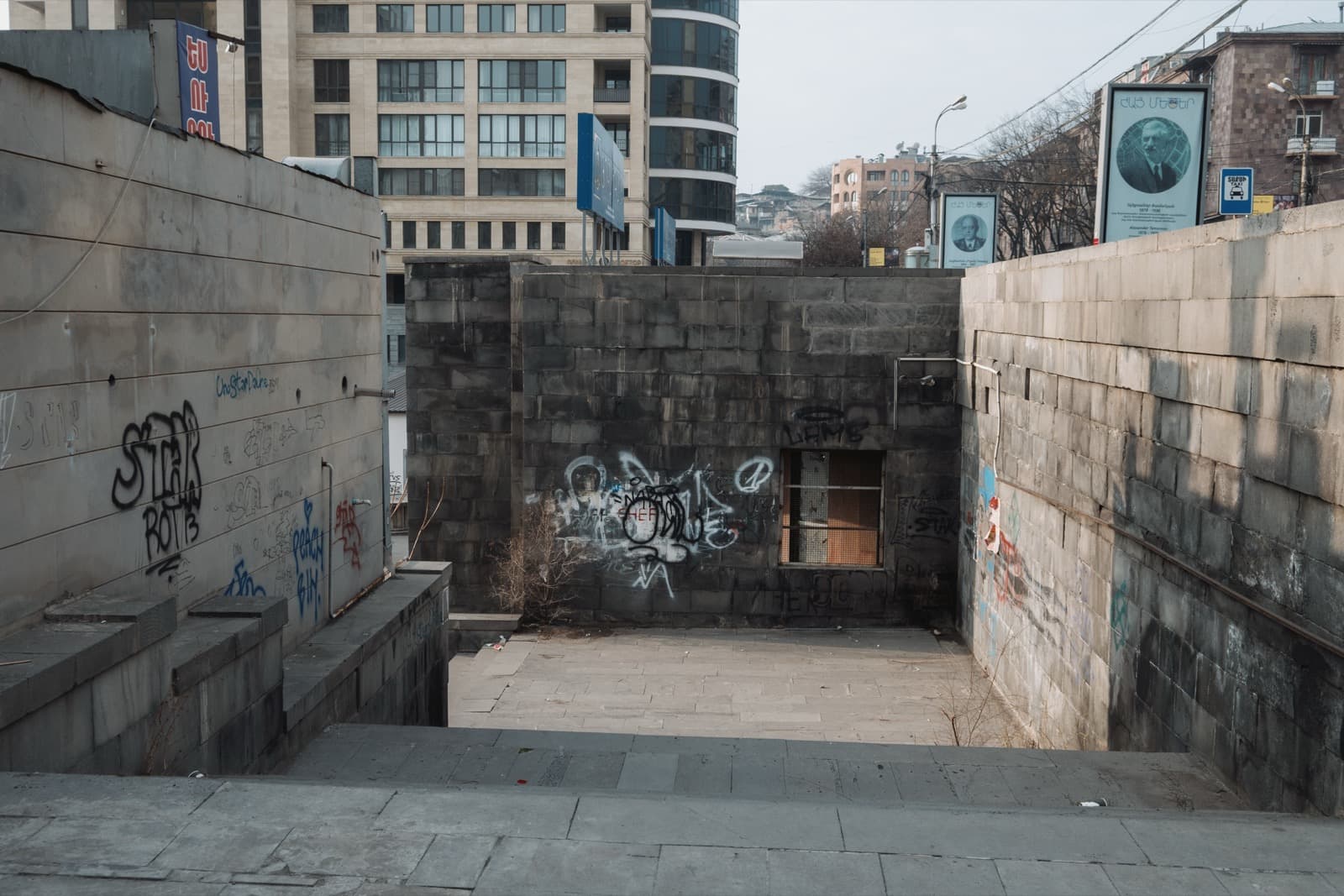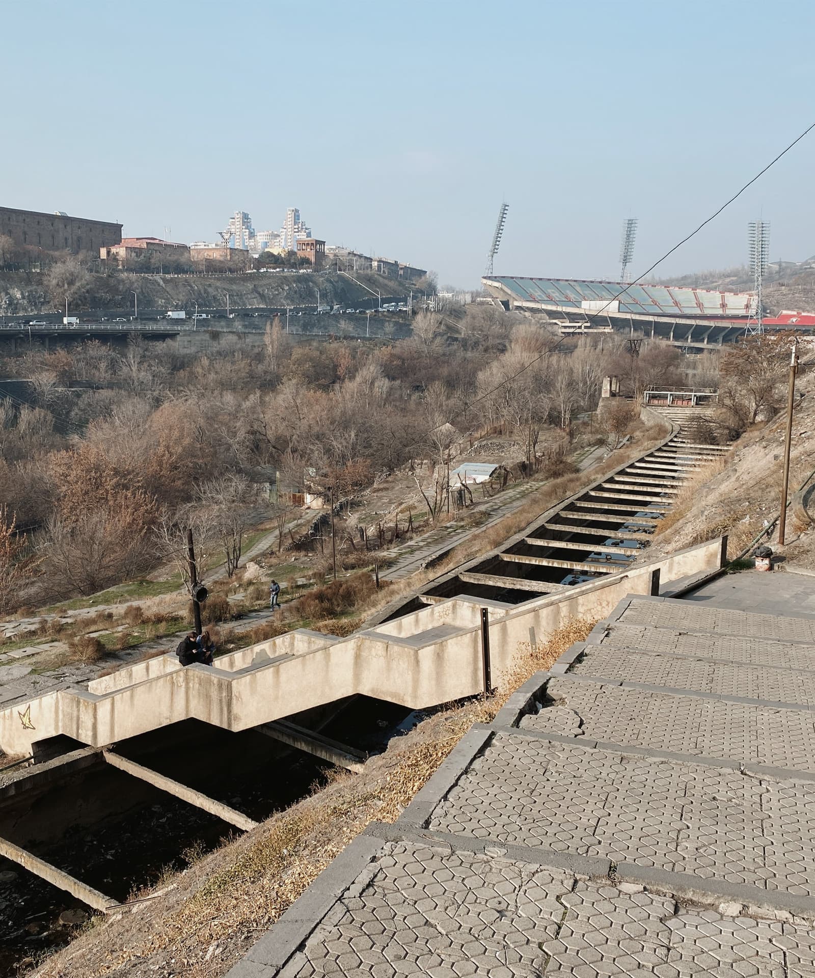 Этим способом оказалась широченная лестница, которая уже без всяких сомнений готова была увести нас со дна Разданского ущелья. По ней мы снова пересекли канал, в этом месте он был укрыт частоколом бетонных перекладин, и поднялись к подножию пересечения проспекта Месропа Маштоца с улицей Пароняна. Снизу-сбоку миновали гигантский перекрёсток после чего вернулись на привычные уличные тротуары.