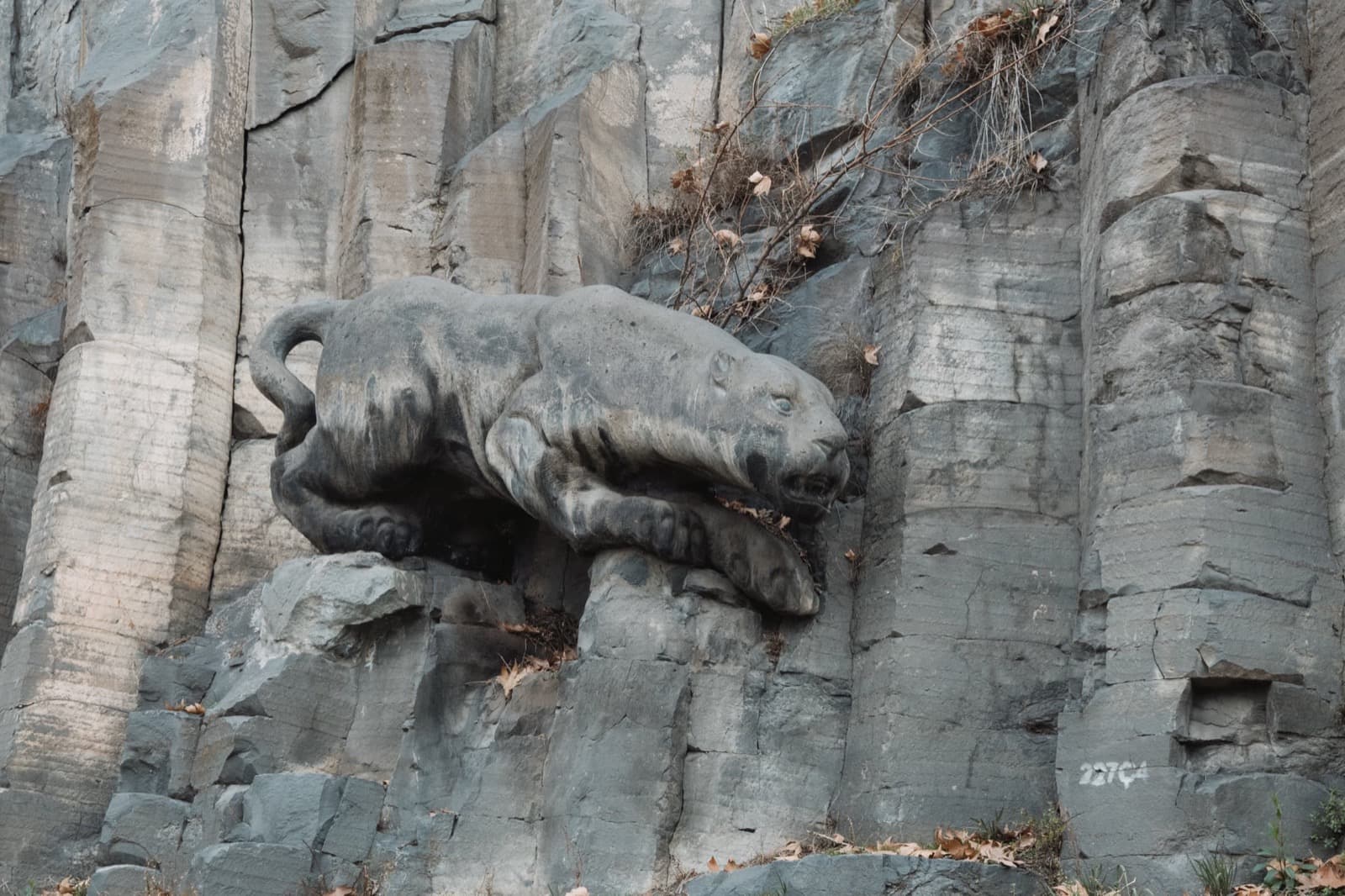 Здесь стоит обратить внимание на две вещи: во-первых, на столбчатую отдельность базальта — такую же самую, что в куда большем масштабе можно увидеть в «Симфонии камней». А во-вторых, на «Ереванского кота», притаившегося среди камней.
