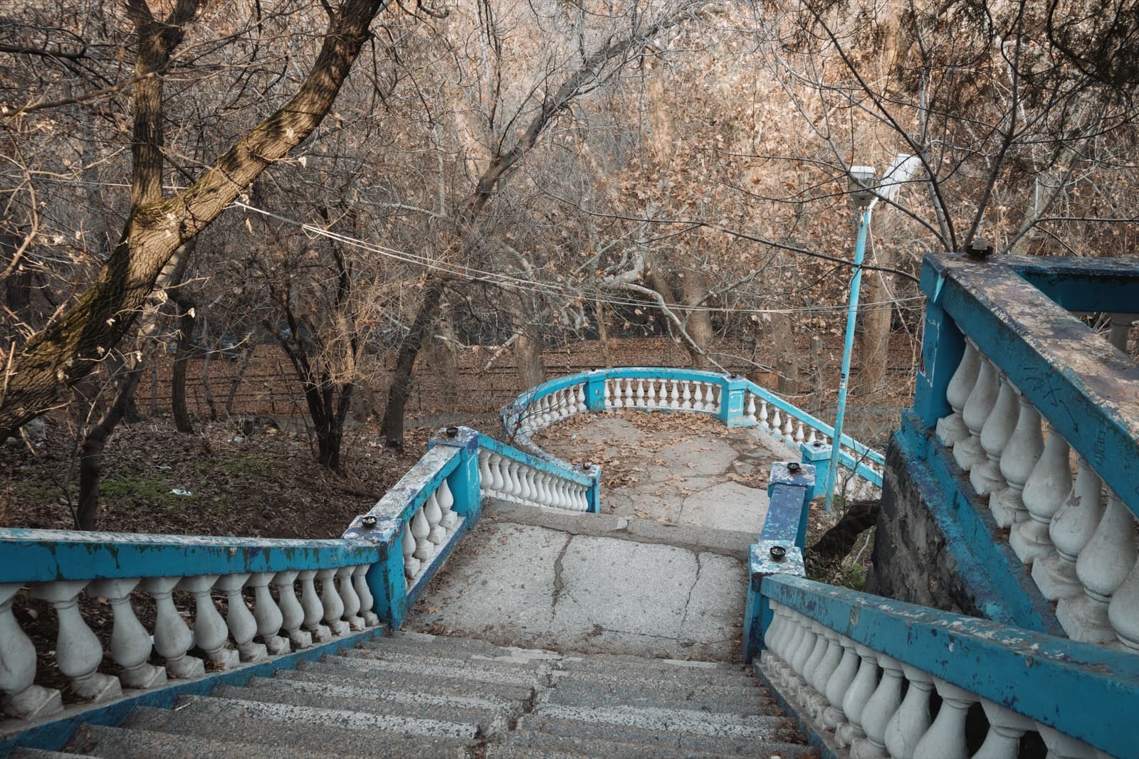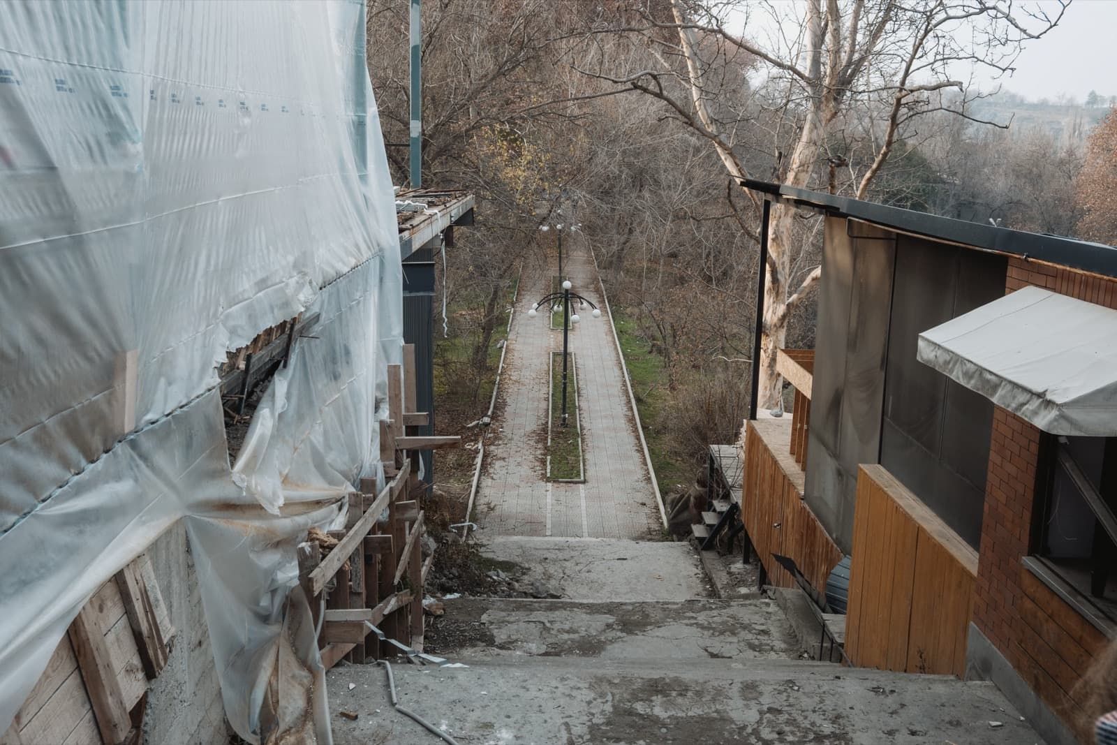Туннель остался за спиной, мы пересекли улицу Разданское ущелье, спустились по лестнице к небольшой аллее и она вывела нас к лестнице, что ведёт на дно Разданского ущелья, к главной станции дороги.