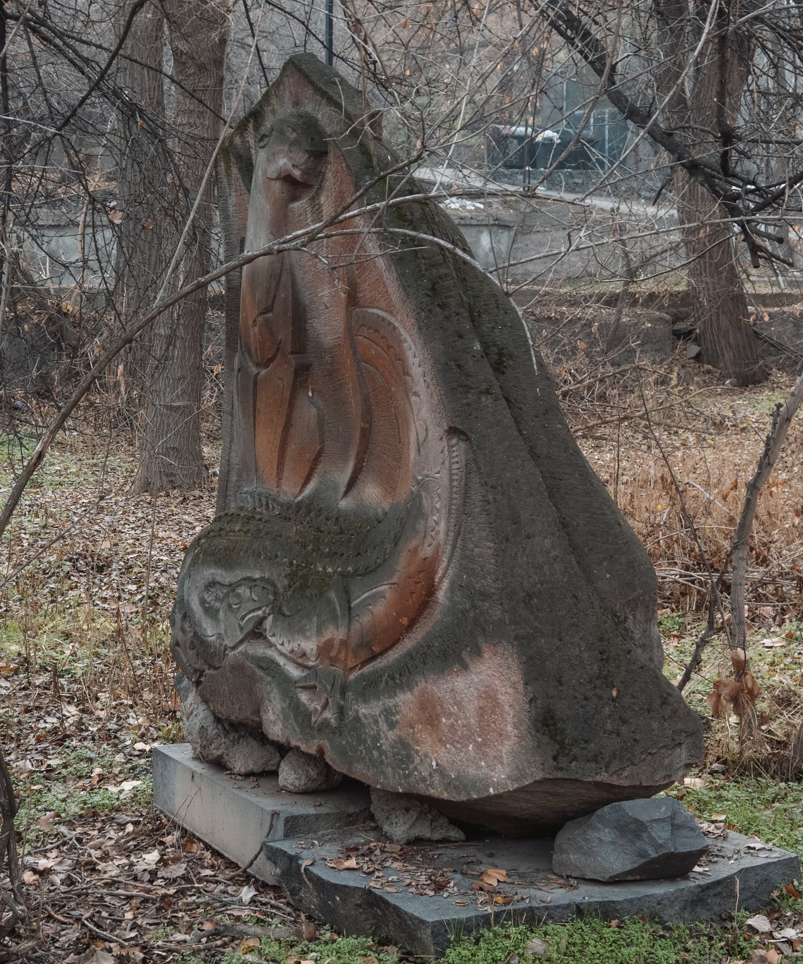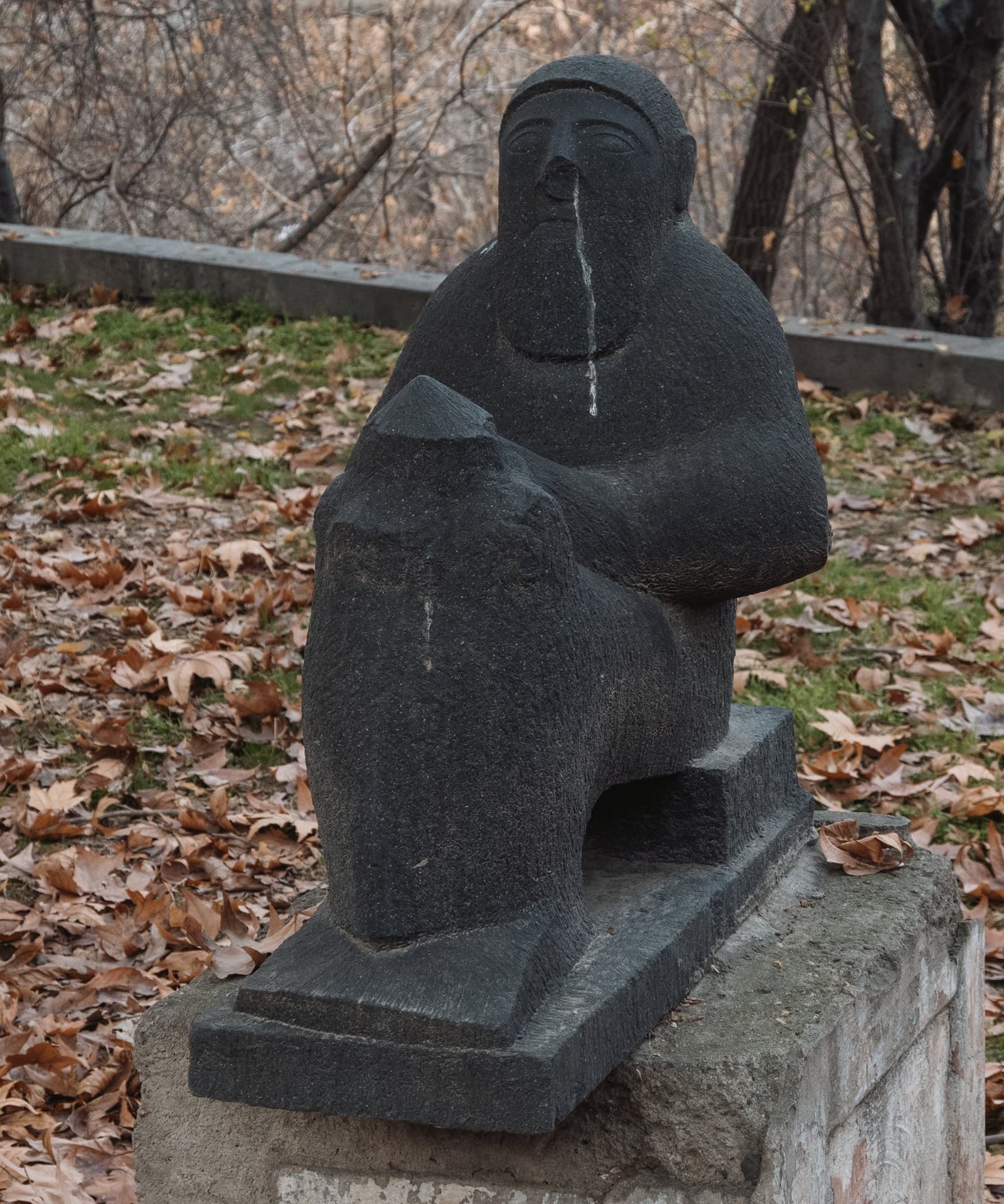 Но прежде чем мы спустимся в этом рассказе, я покажу ещё несколько фото разных каменных скульптур, установленных вдоль аллеи. Думаю, несложно догадаться, что сова в кроне сказочного дерева — мой явный фаворит среди увиденных там статуй.