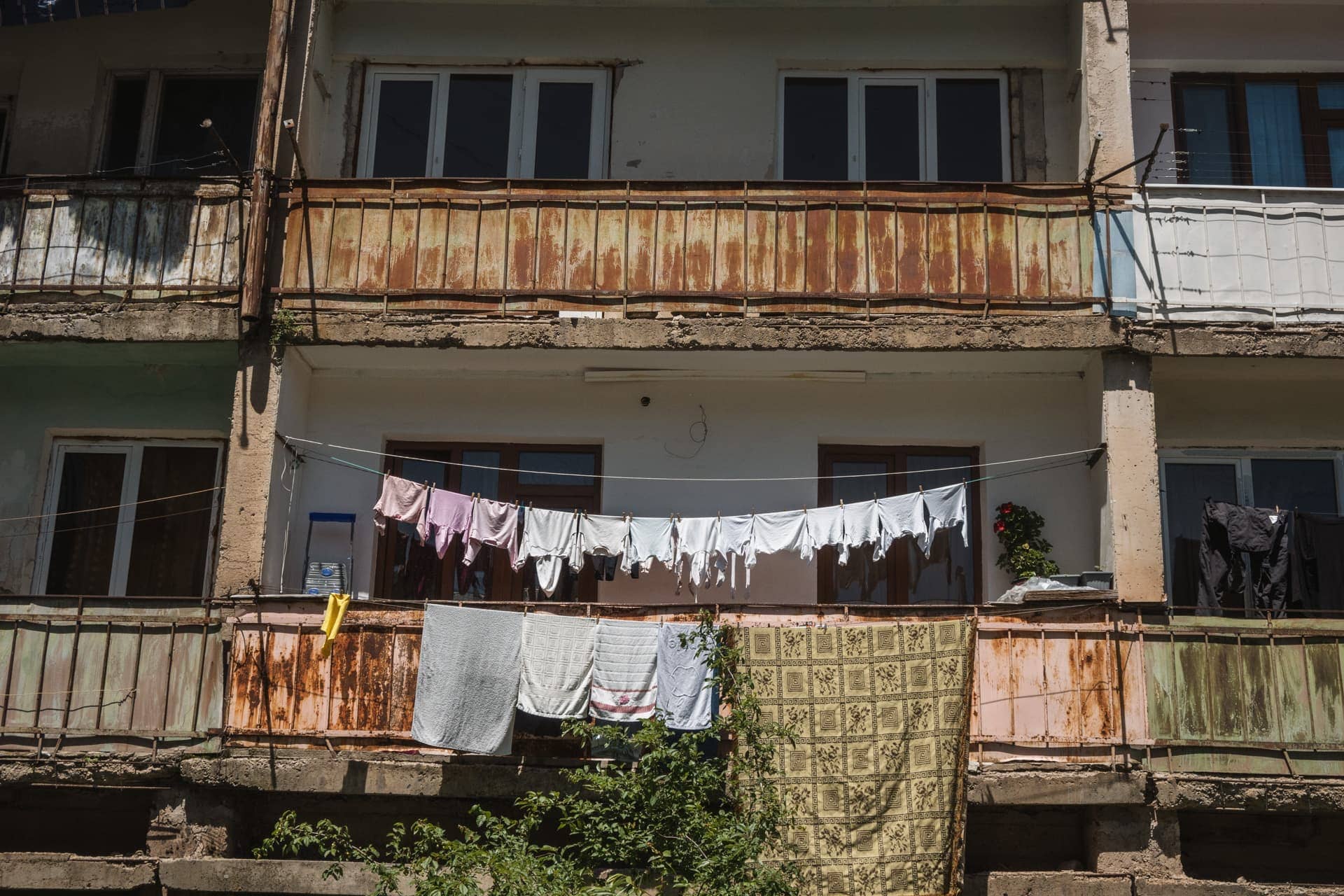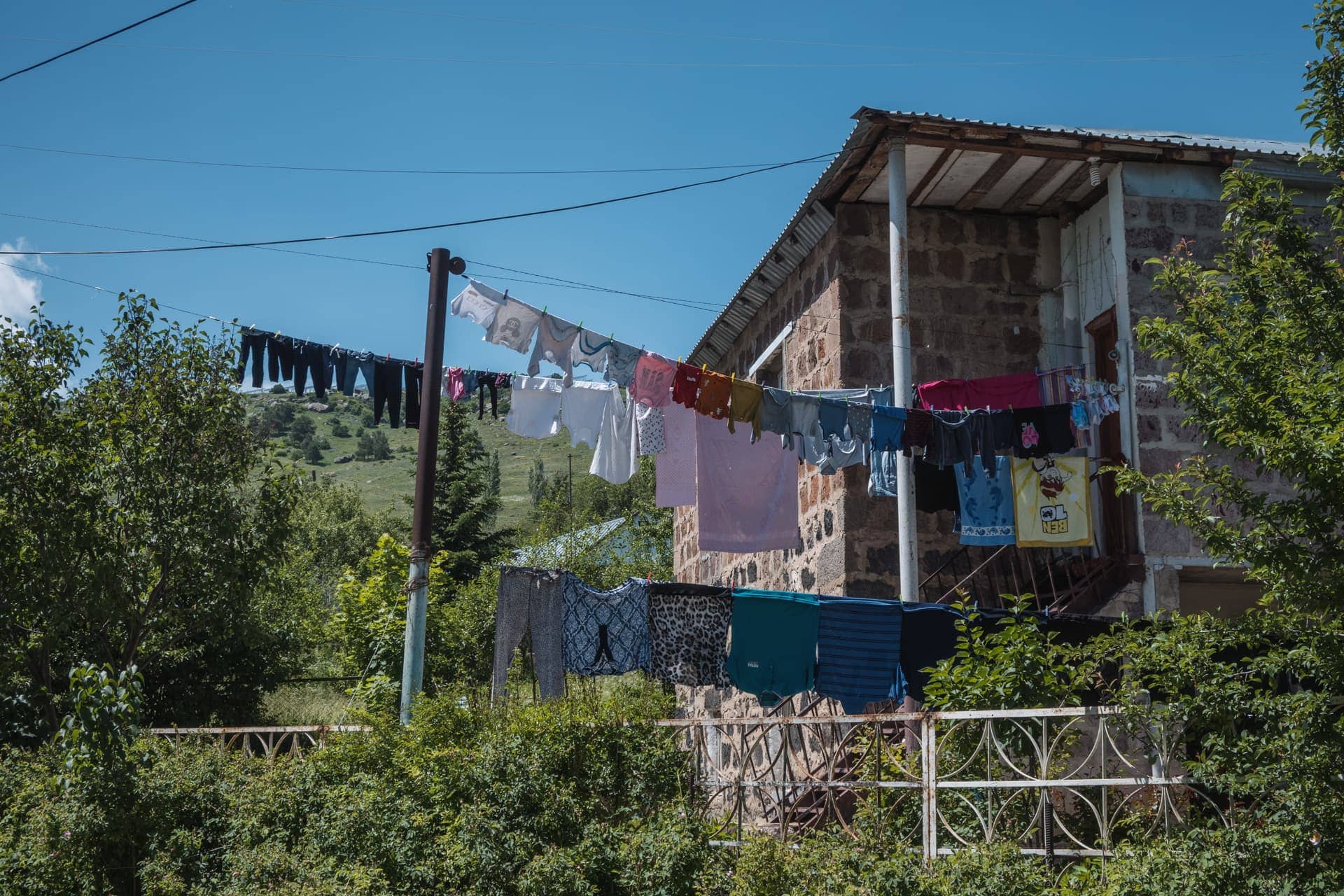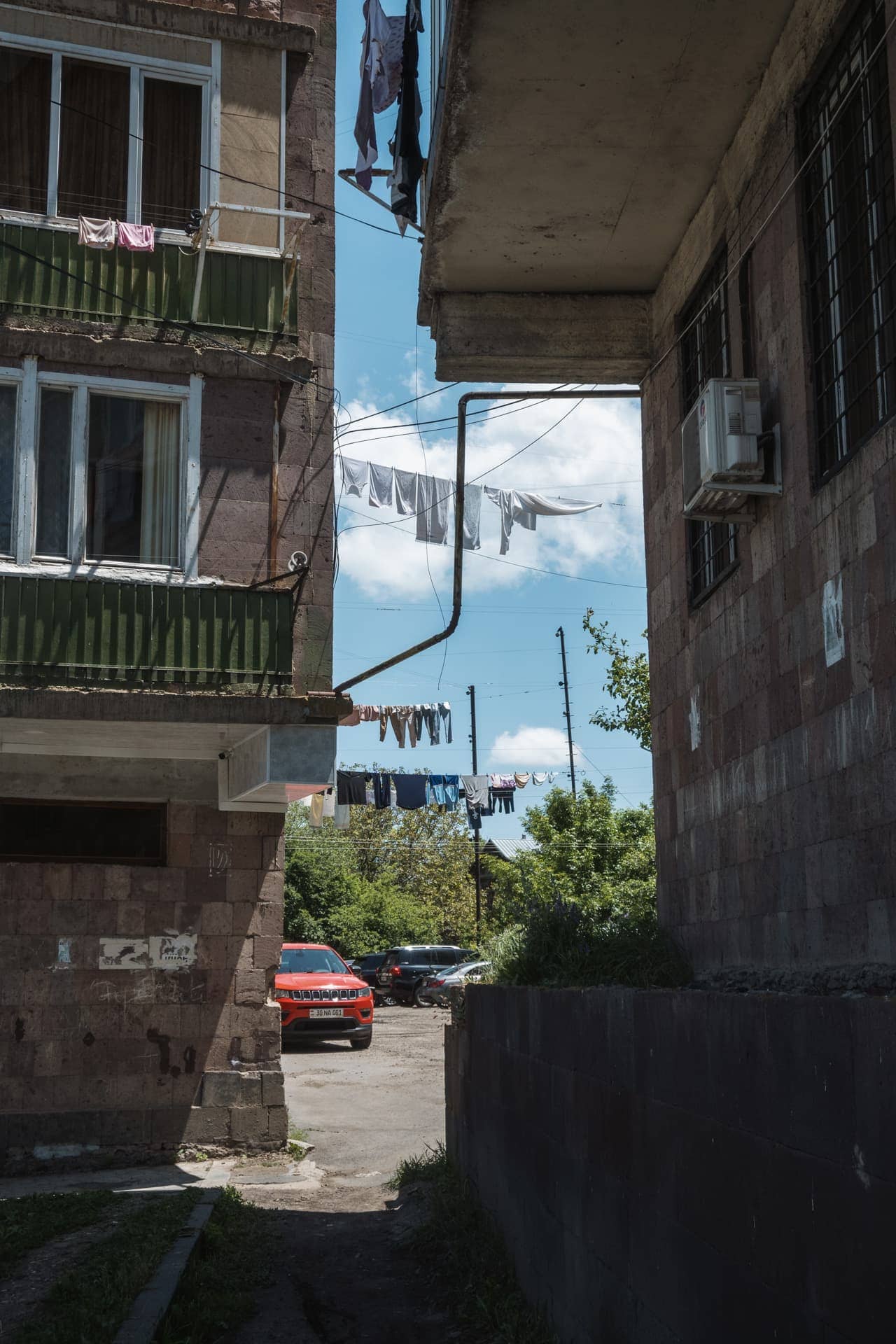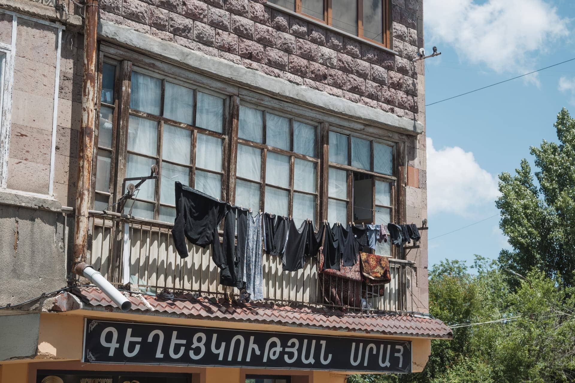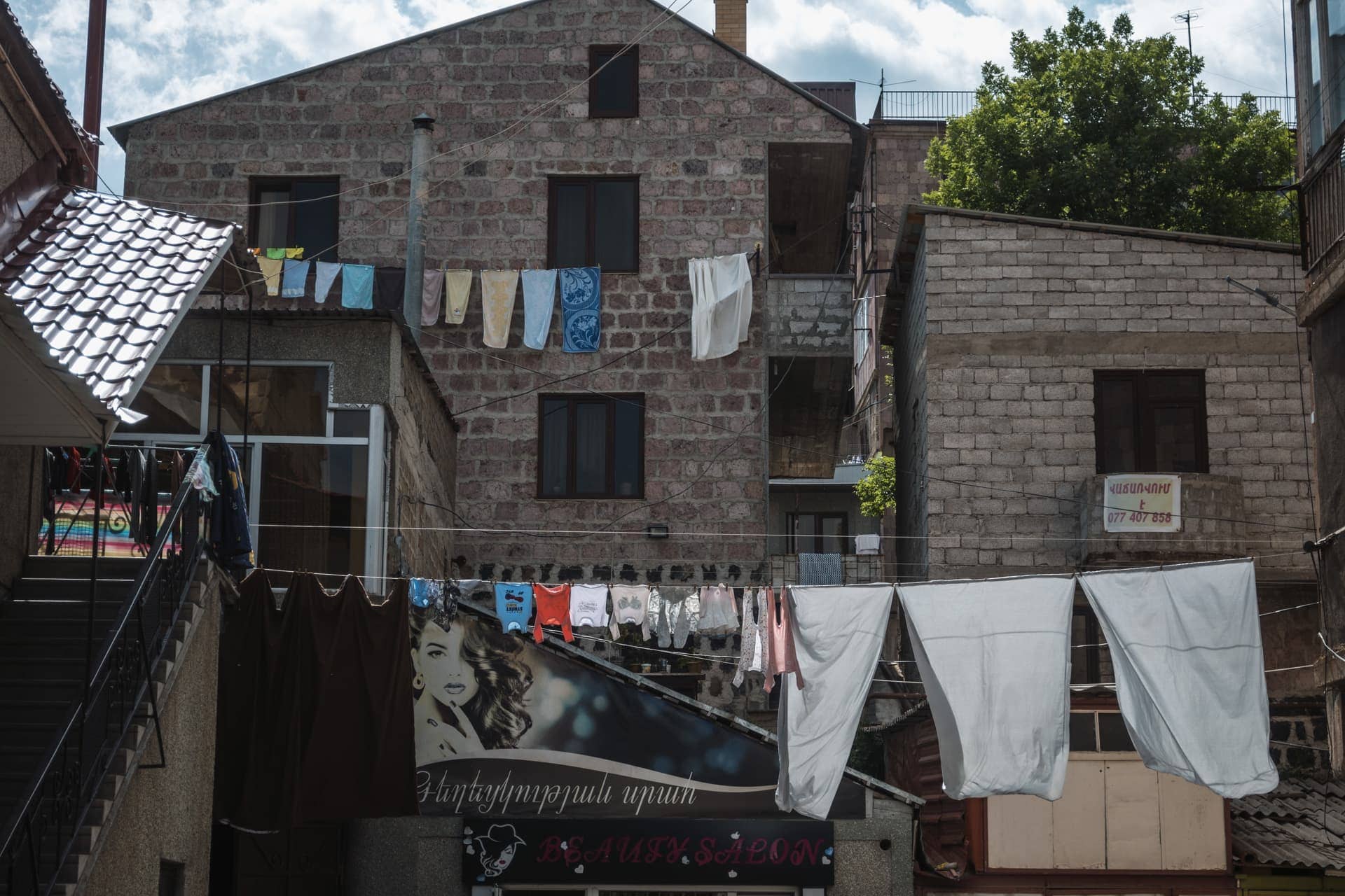 А вот тут же простой жилой дом из необлицованного туфа и сияющее в лучах солнца бельё.