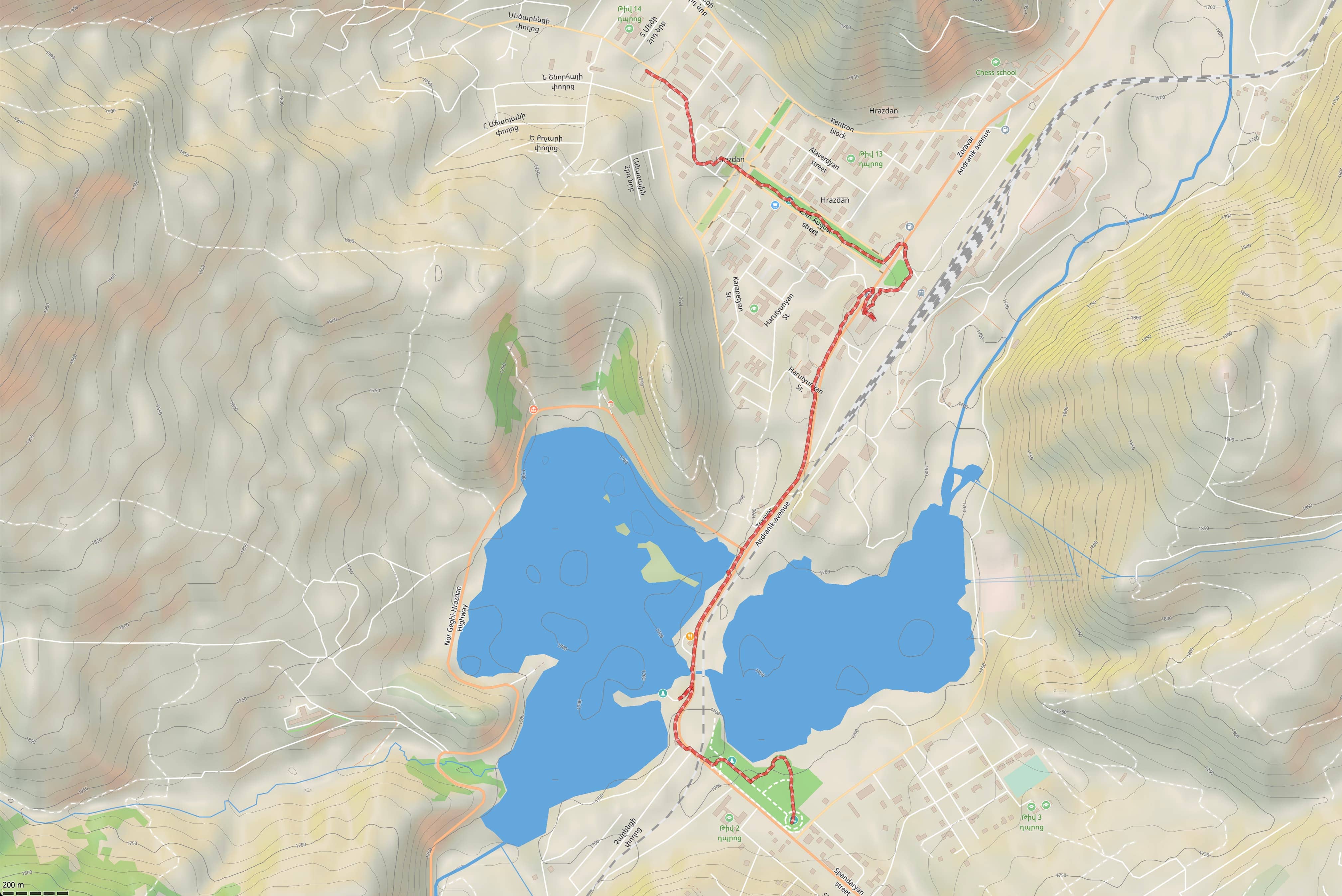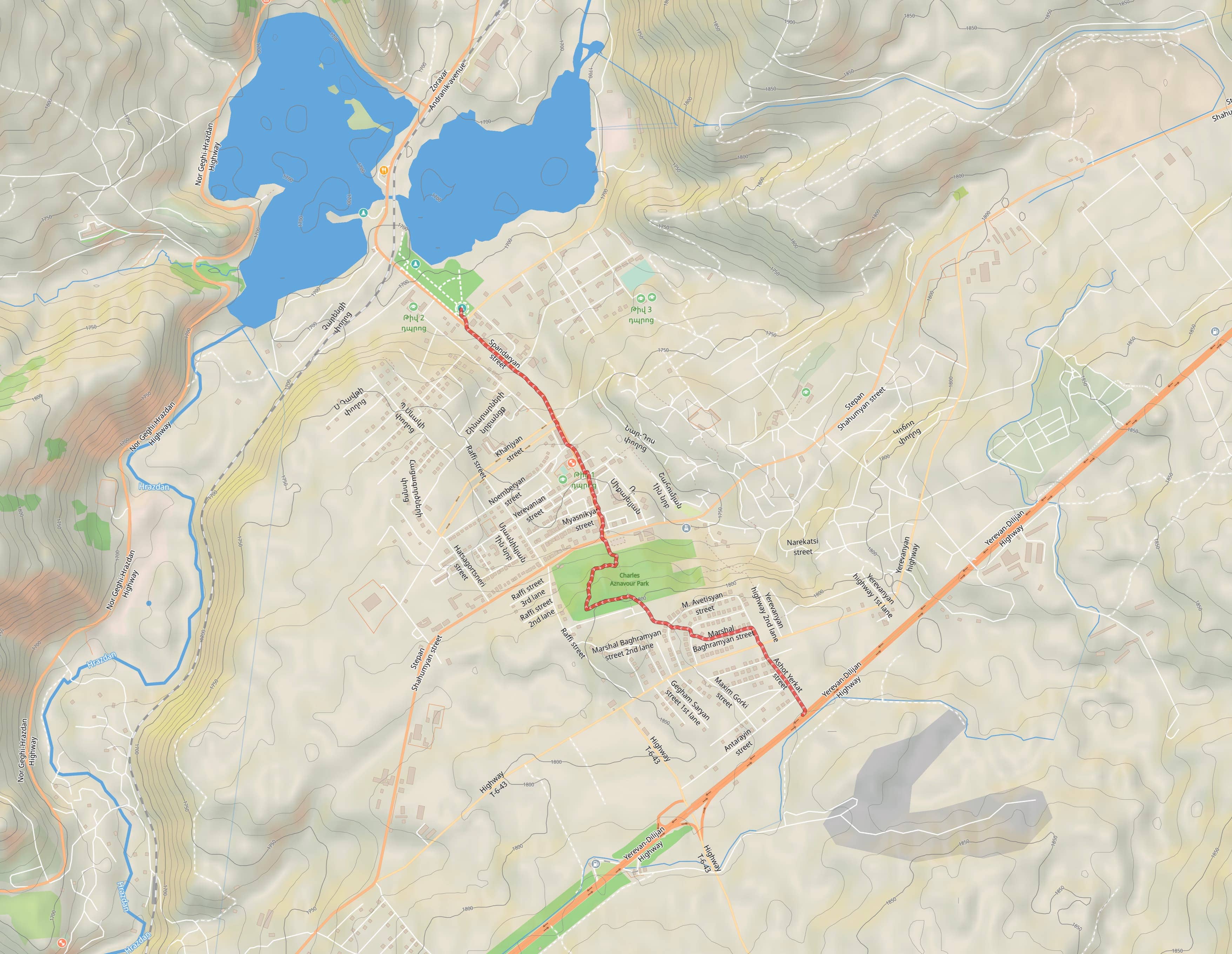 Технически весь перешеек между озёрами (вместе с мостом через Раздан) — это всё ещё улица Спандаряна, та самая, что начинается у северного края парка Шарля Азнавура.
