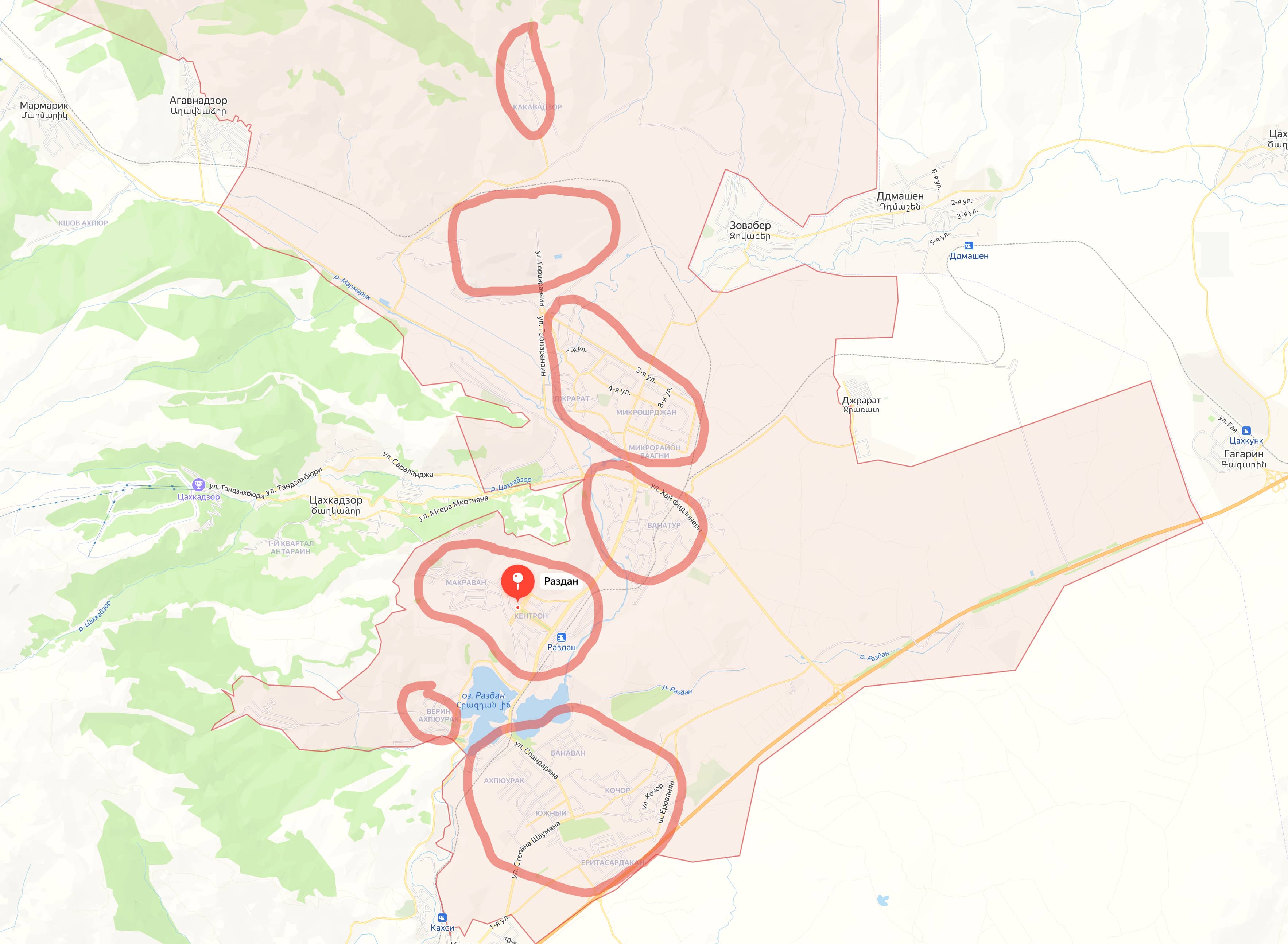 Здесь самое время немного рассказать об устройстве Раздана. Административно, город огромен. Он простирается с севера на юг почти на двадцать километров. Но по факту город намного меньше. Просто он разделён на группы районов, стоящих на удалении друг от друга.