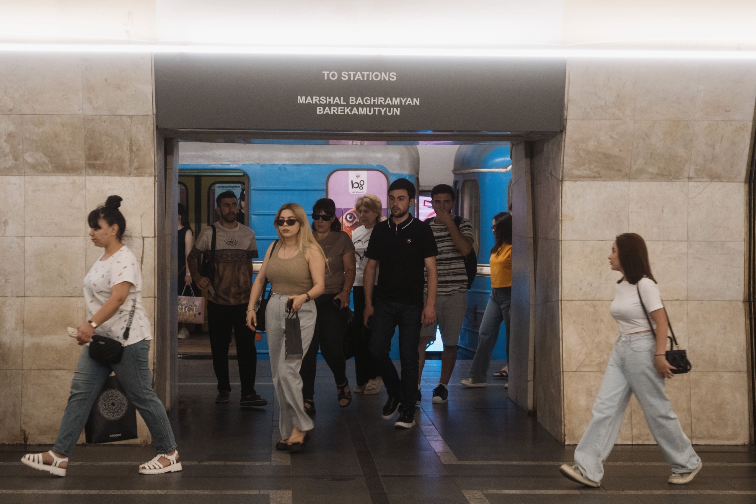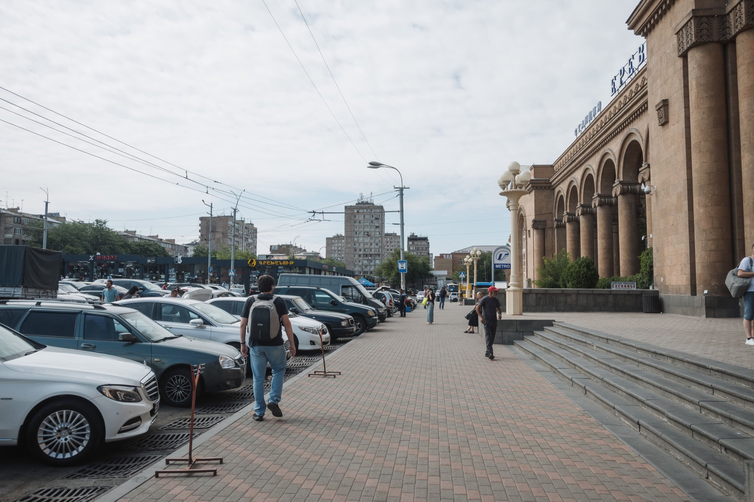 Из интересных штук, встретившихся по пути можно отметить вид на железную дорогу и наземный участок метро с путепровода на улице Гарегина Нжде. Ещё любопытным показался подземный пешеходный переход под проспектом Аршакуняц. Там вход в него хитро спрятан в стене дома — сразу не поймёшь, что вот этот скромный дверной проём и есть вход в переход. Всё же я привык к широким порталам, уводящим под землю, а не к дверке в стене.