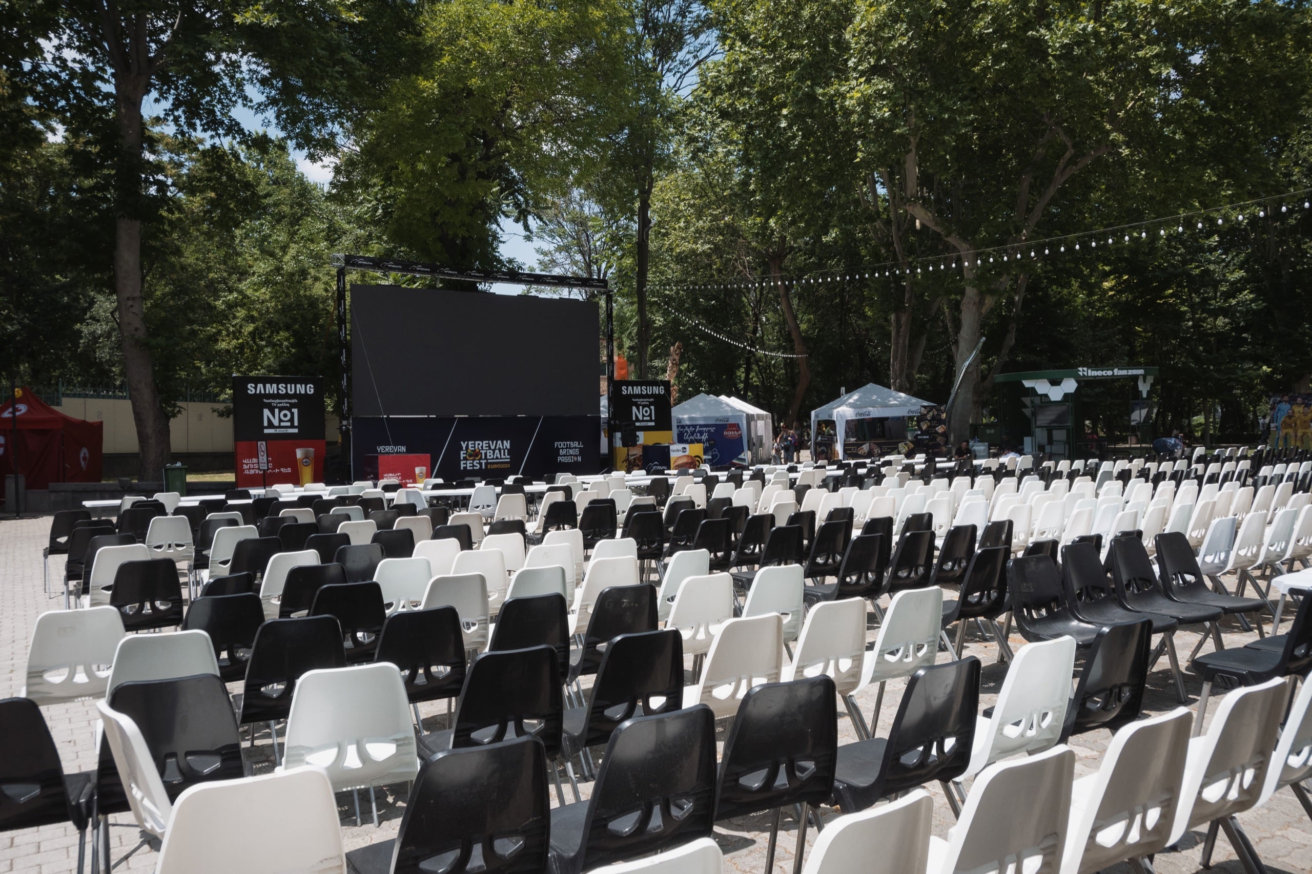 Ещё из особенностей Еревана в эти дни. Только на нашем, не таком уж большом маршруте встретили две зоны для просмотра футбола. Большие экраны, расставленные перед ними пластиковые сиденья, палатки с пивом и снеками вокруг. Я не фанат ногомяча, но вот такая возможность провести время на свежем воздухе, предоставленная городом (а может и каким бизнесом, не знаю) — это очень круто. И, как обычно, никаких рамок, заборов и прочего охранительства, свойственного многим публичным местам в России.