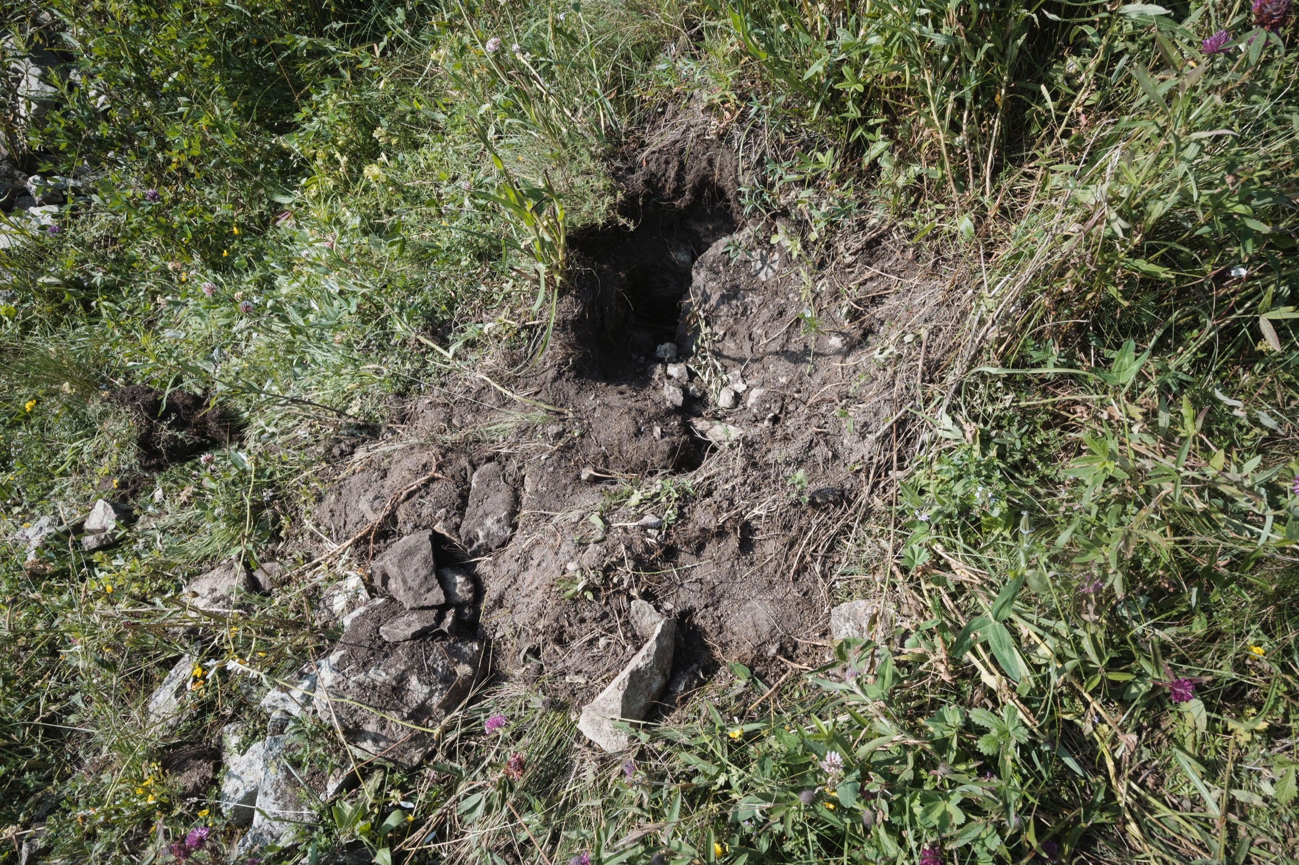 Наверху встретили толпу ребятишек, которых тренер водил на вершину. Дядька обратил моё внимание на свежую ямку у дороги и след возле неё — там недавно был мишка. Судя по размеру следа, небольшой, но самый настоящий медведь!
