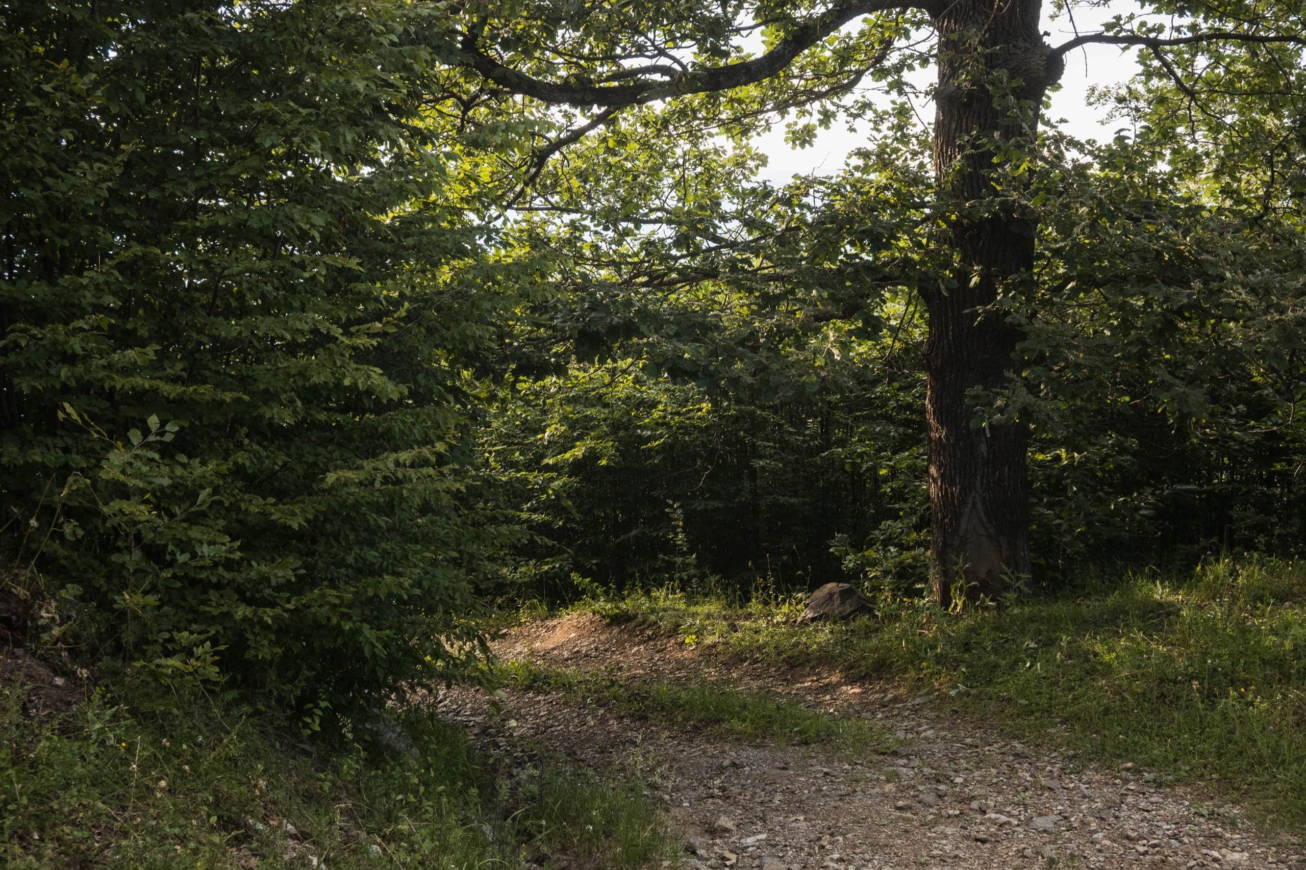 Сперва мы спускались той же дорогой, что шли наверх. Но примерно на полпути к Тахте, свернули на развилке влево, надеясь выйти к «Пьяному лесу». Но вскоре дорогу преградил забор с табличкой, известившей о том что далее лес находится на восстановлении и ходить через него нельзя. Пришлось вернуться на хоженный трек и снова свернуть влево уже гораздо ниже.
