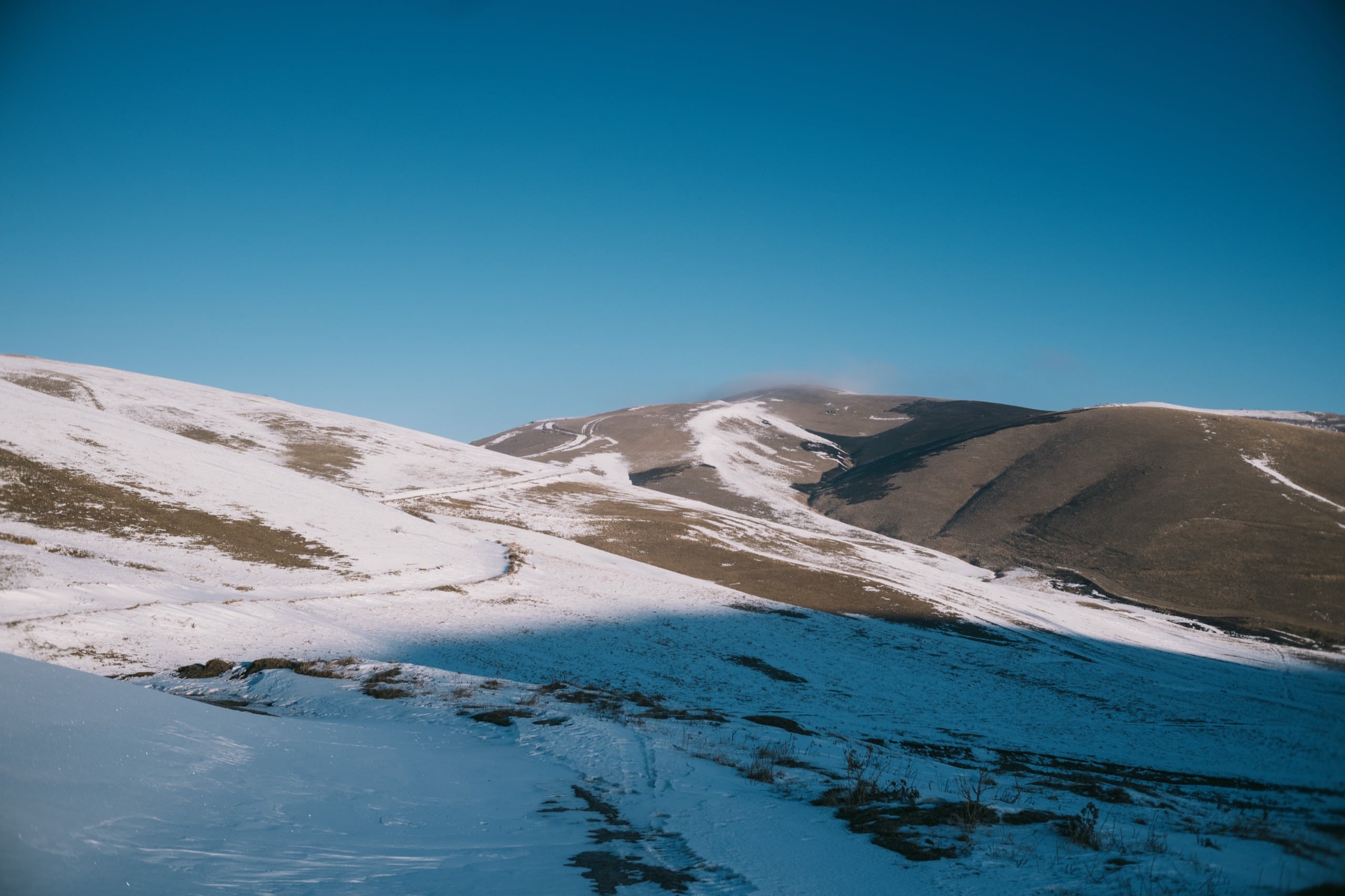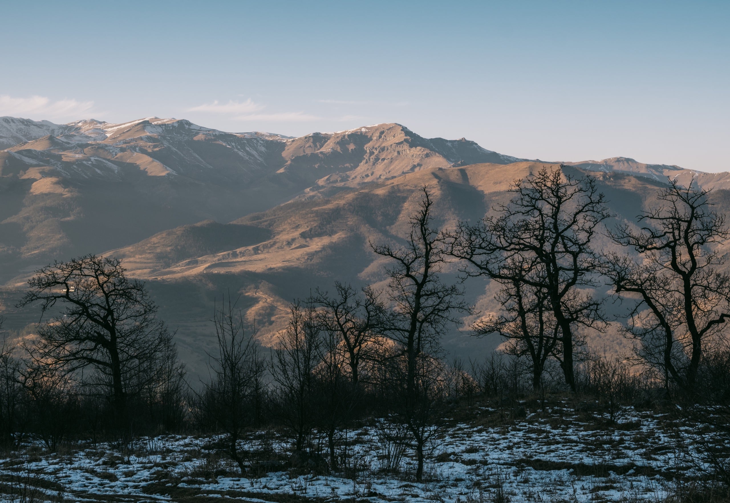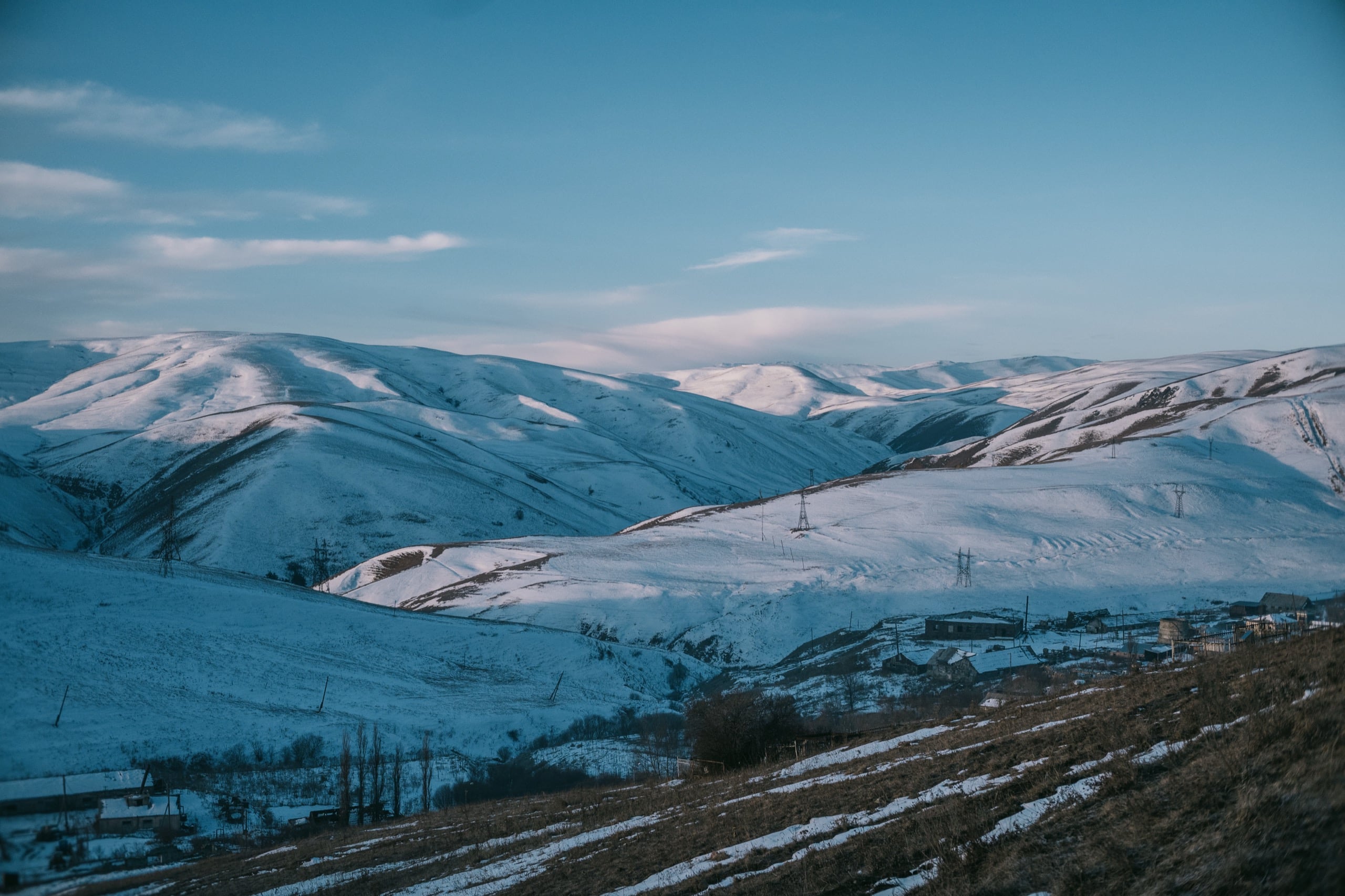 Высоты там сильно больше двух тысяч метров, от того холмы стояли по большей части белые, с редкими рыжими проплешинами. Солнце только взошло и по склонам разливался нежный розовый свет — красота!