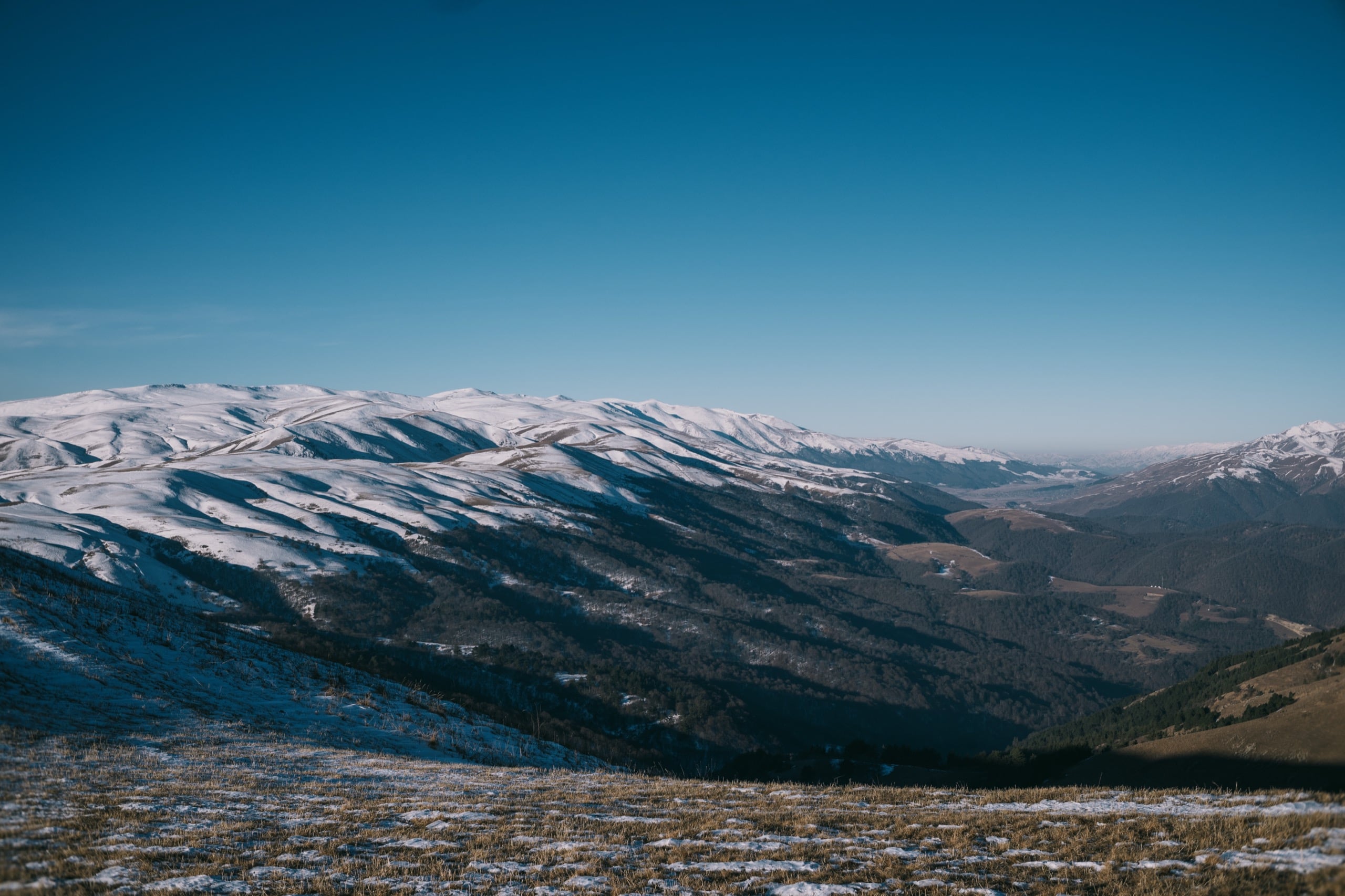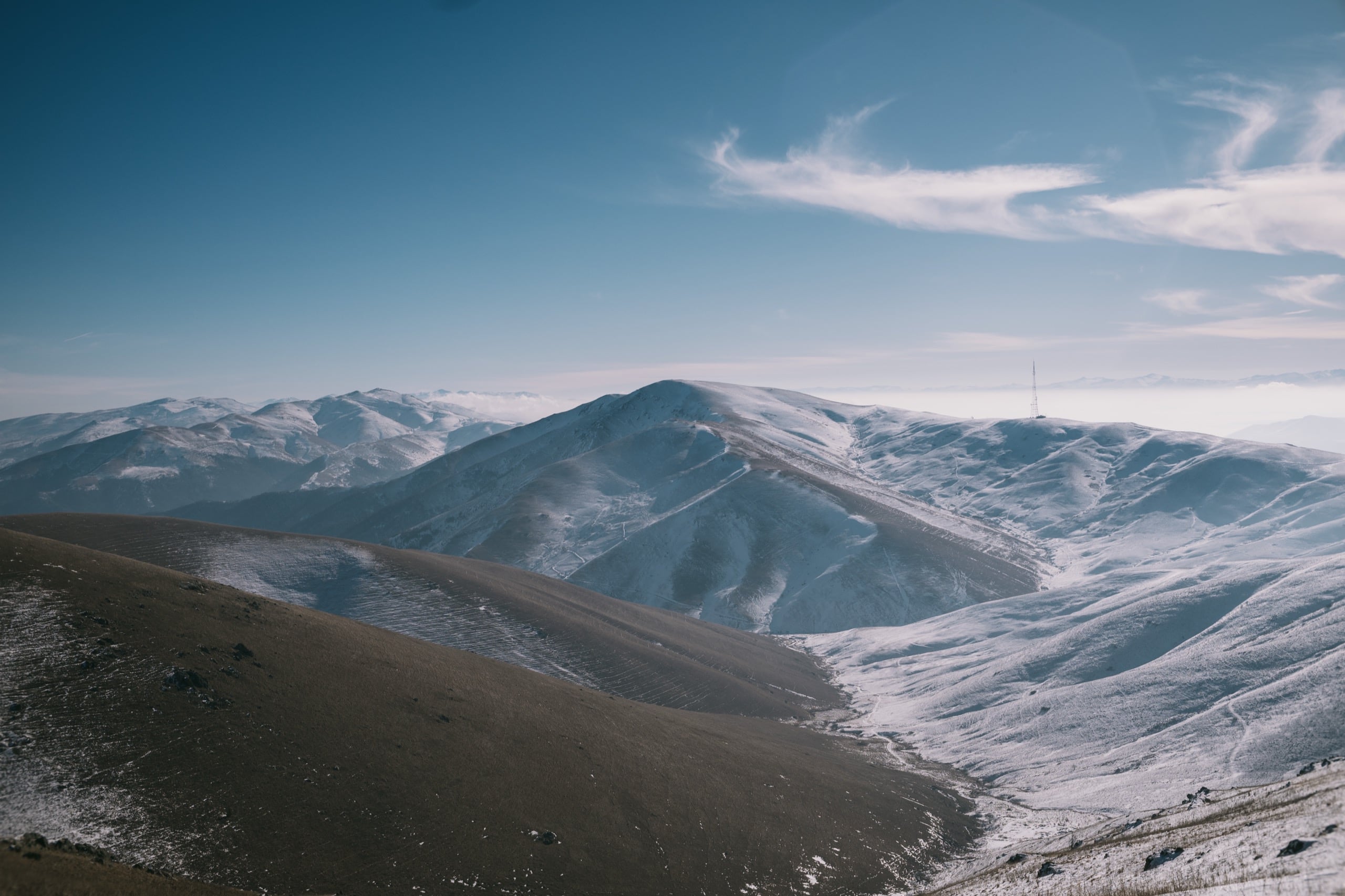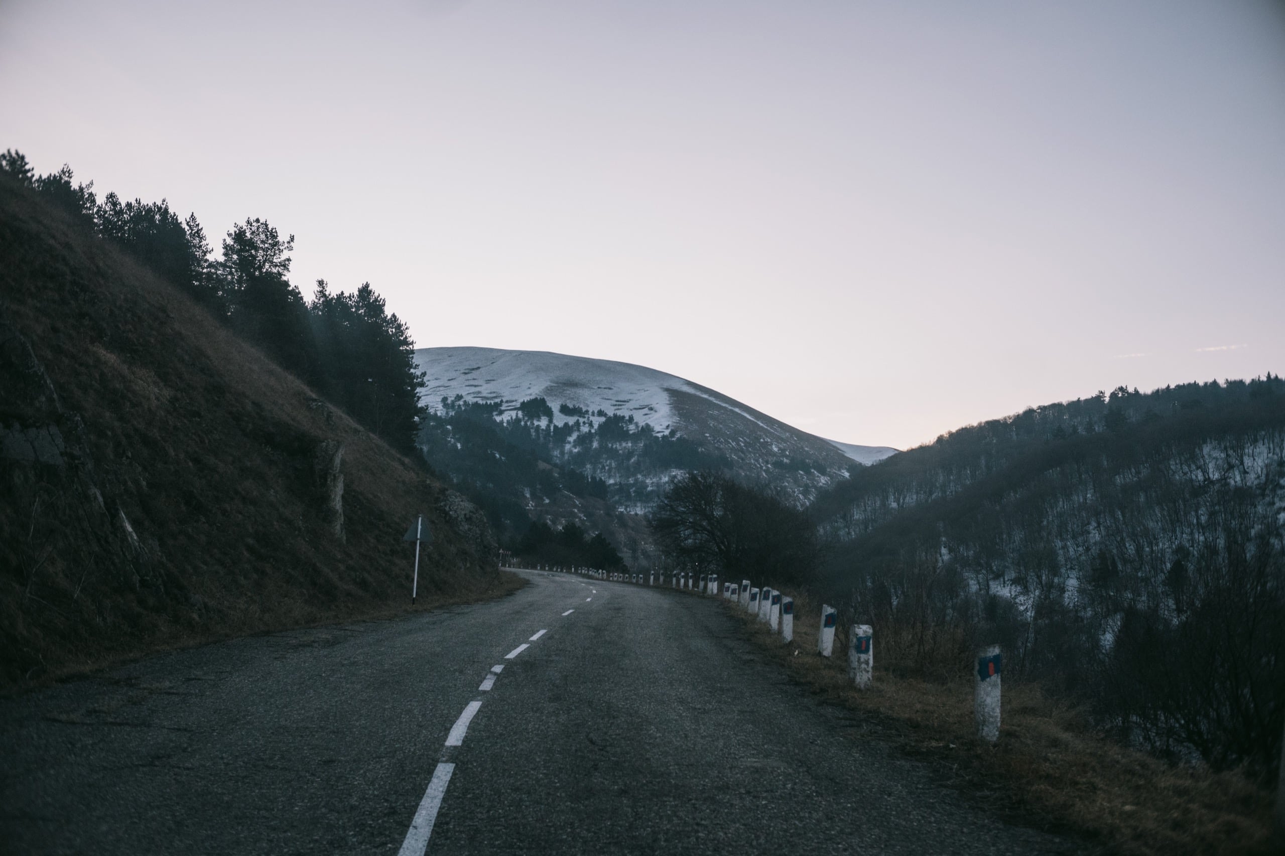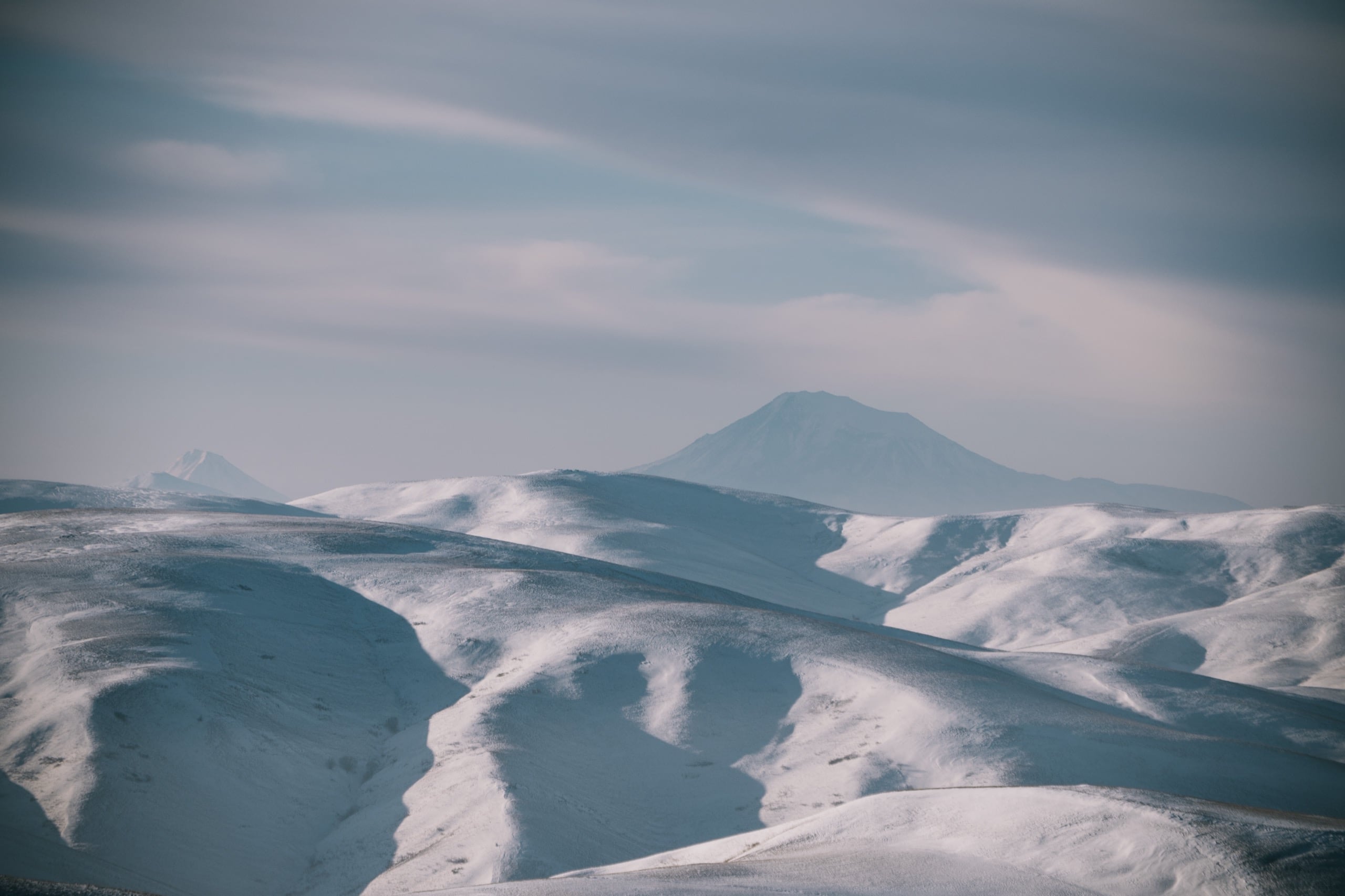 Высоты там сильно больше двух тысяч метров, от того холмы стояли по большей части белые, с редкими рыжими проплешинами. Солнце только взошло и по склонам разливался нежный розовый свет — красота!