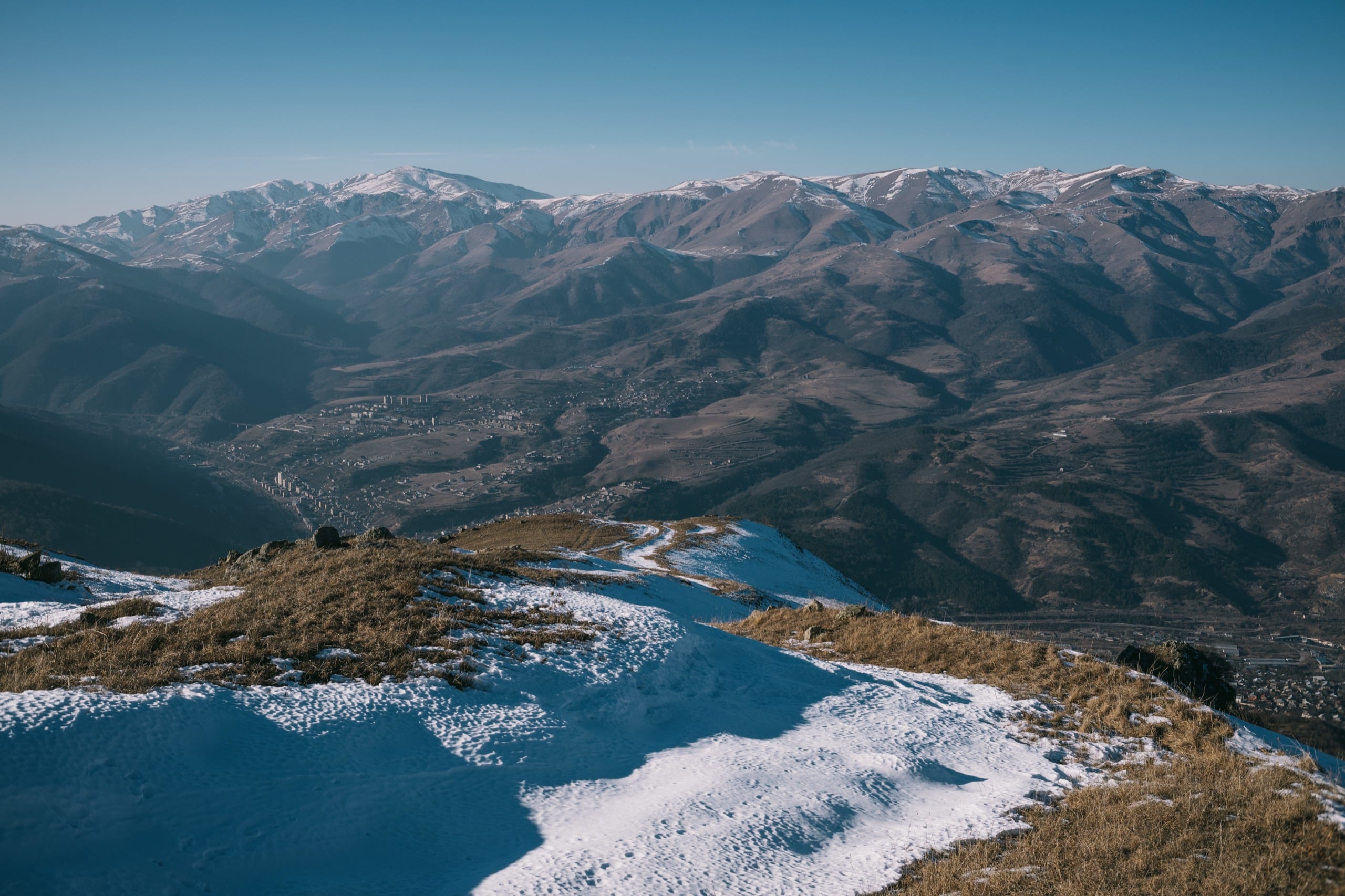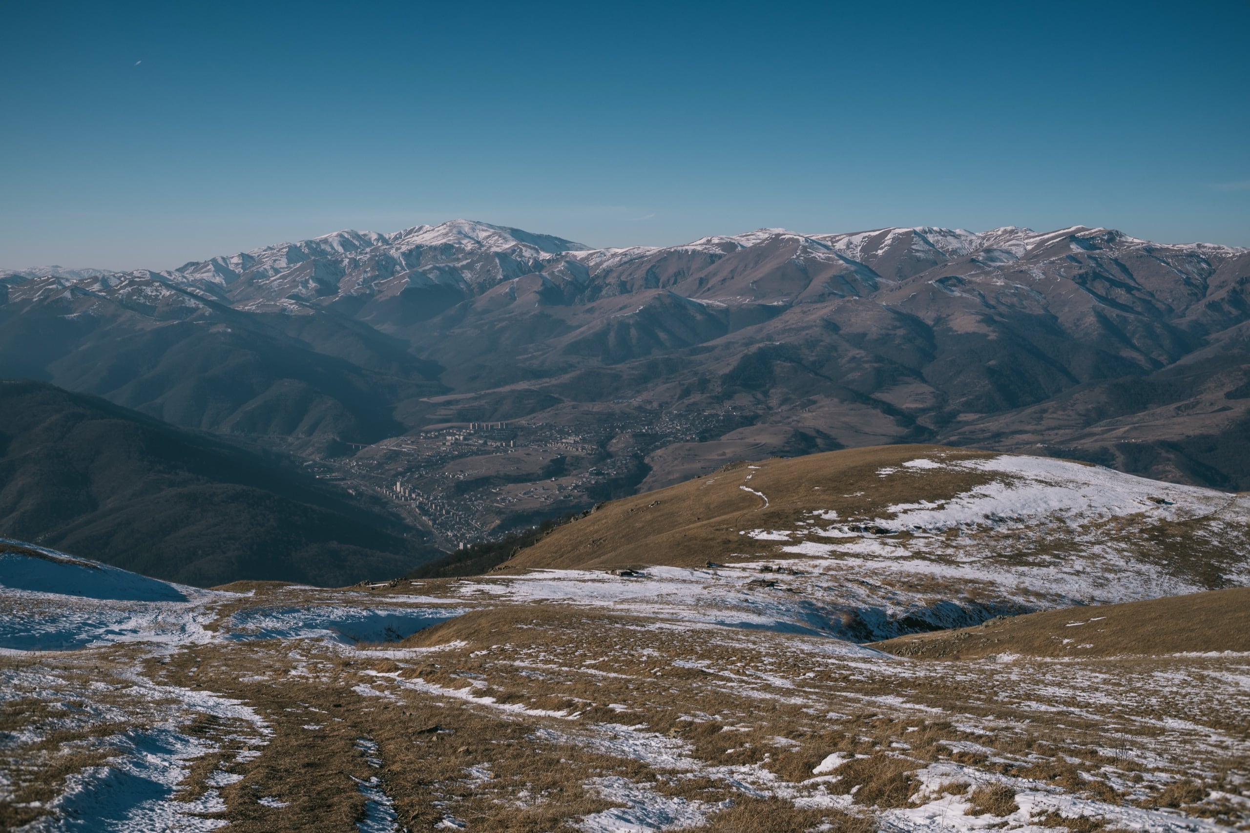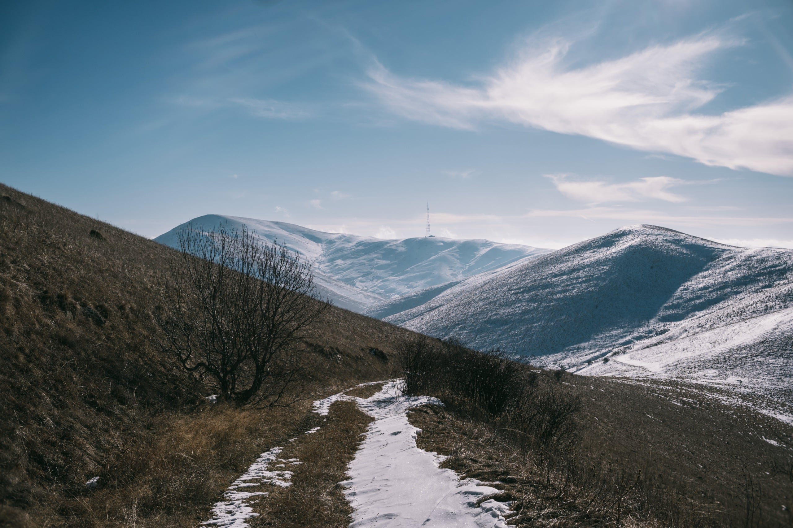 Фото 19. Взгляд назад с одного из малоснежных участков пути. Хорошо видна вышка сотовой связи, стоящая на горе между Семёновкой и Цовагюхом, слева от неё гора Егнасар, высотой в 2599 м.
