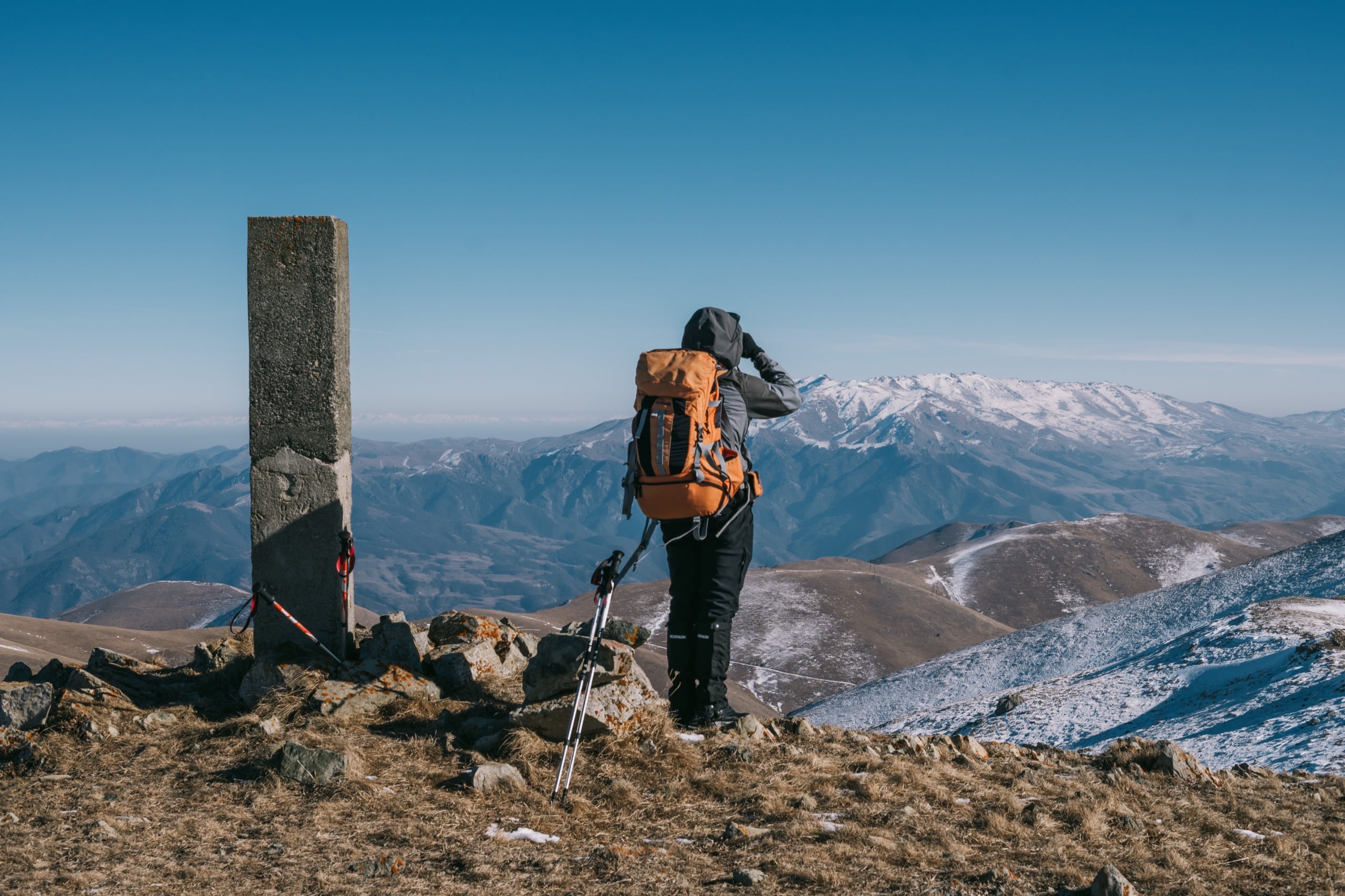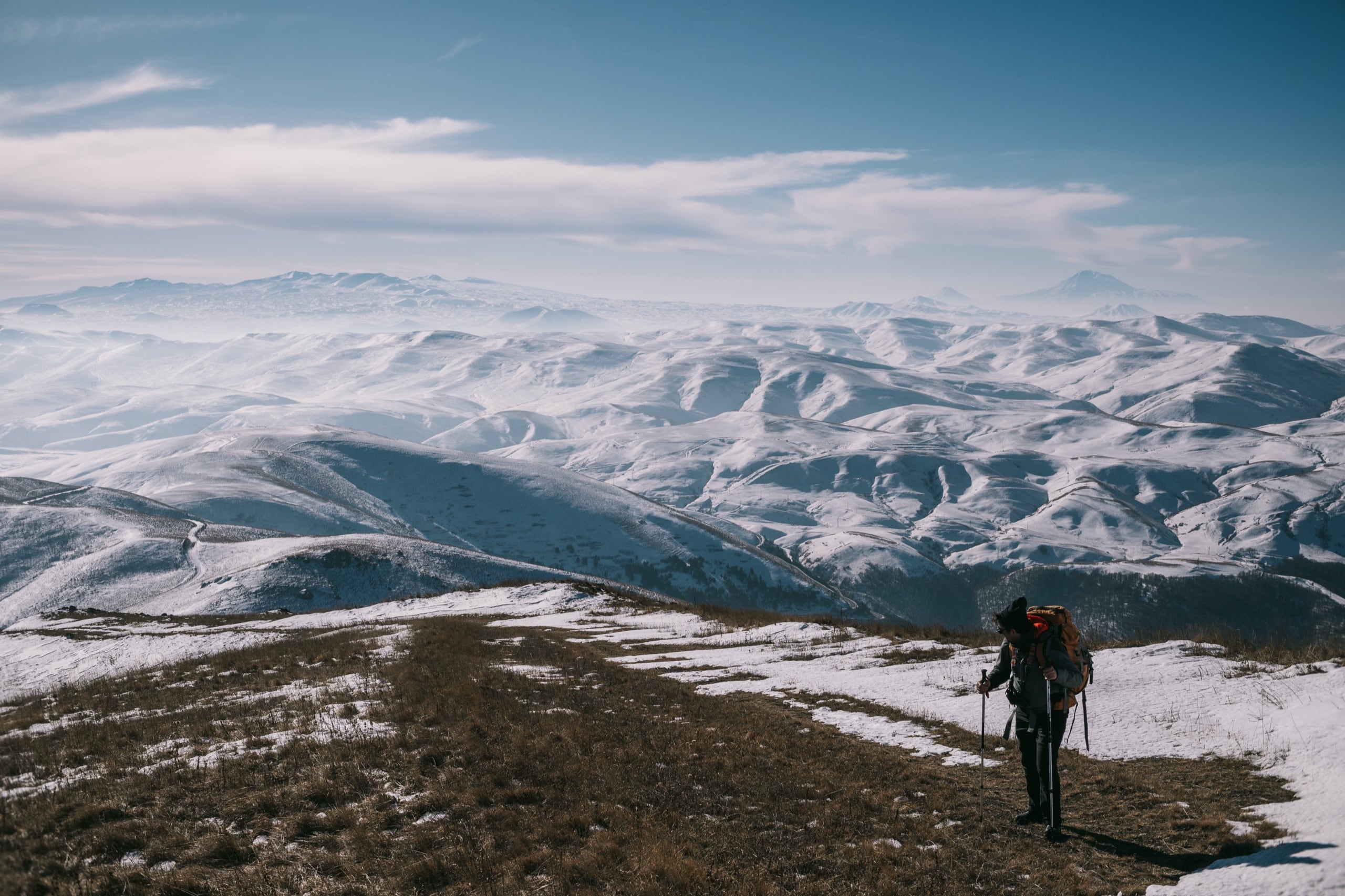 Фото 20. Жека осматривает открывающиеся на юге виды. Слева вдали хорошо просматривается вулкан Аждаак и окружающие его горы, справа Арарат, ближе Гутанасар, Цахкунийские горы и совсем близко Памбакский хребет.