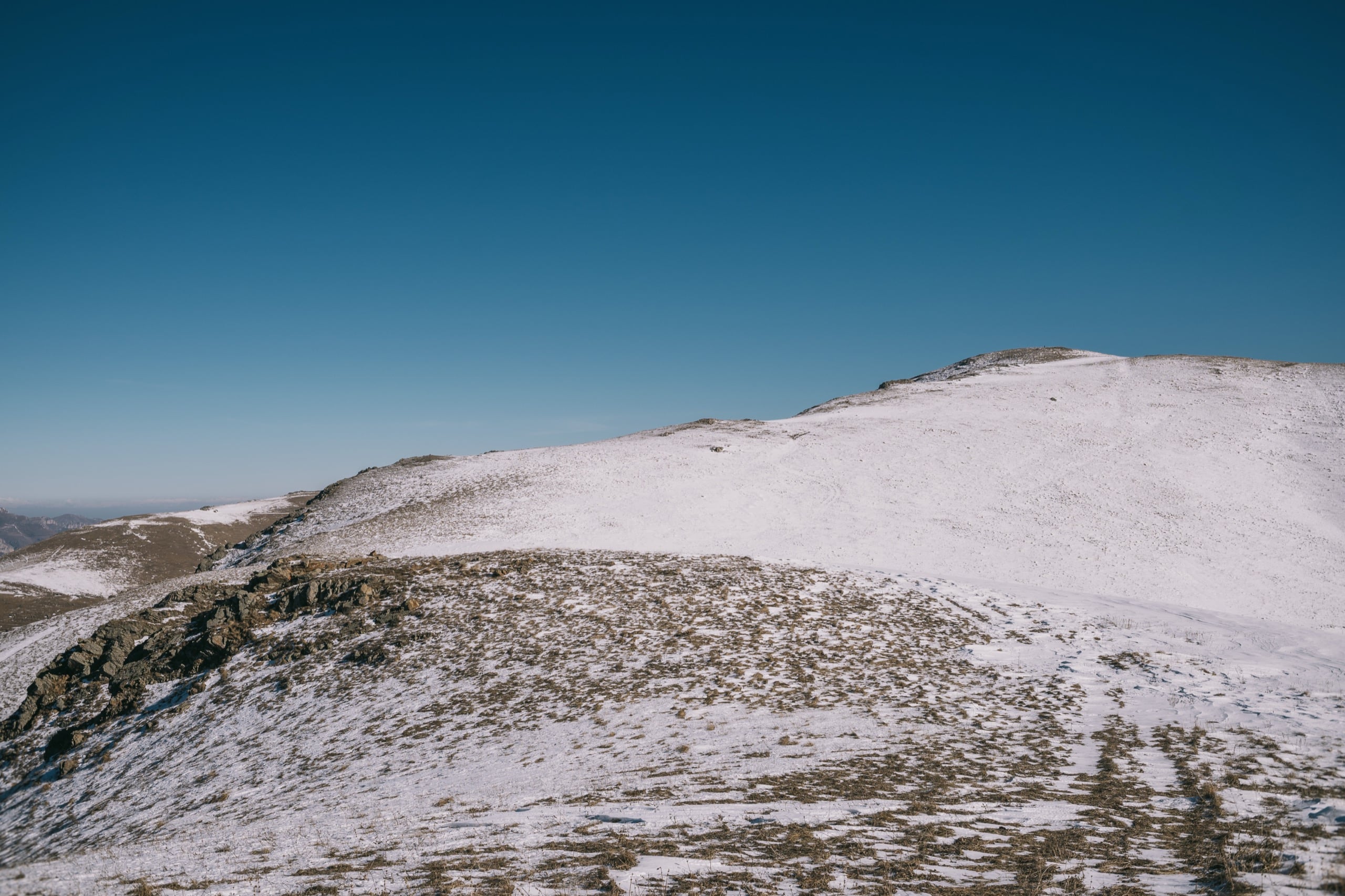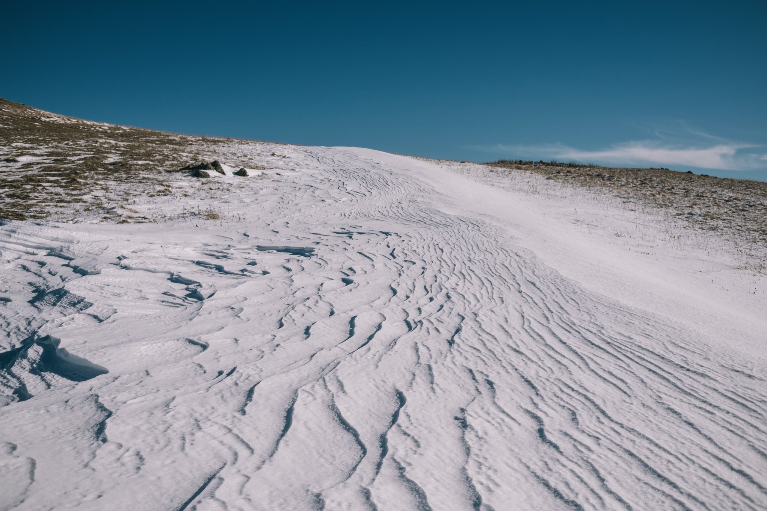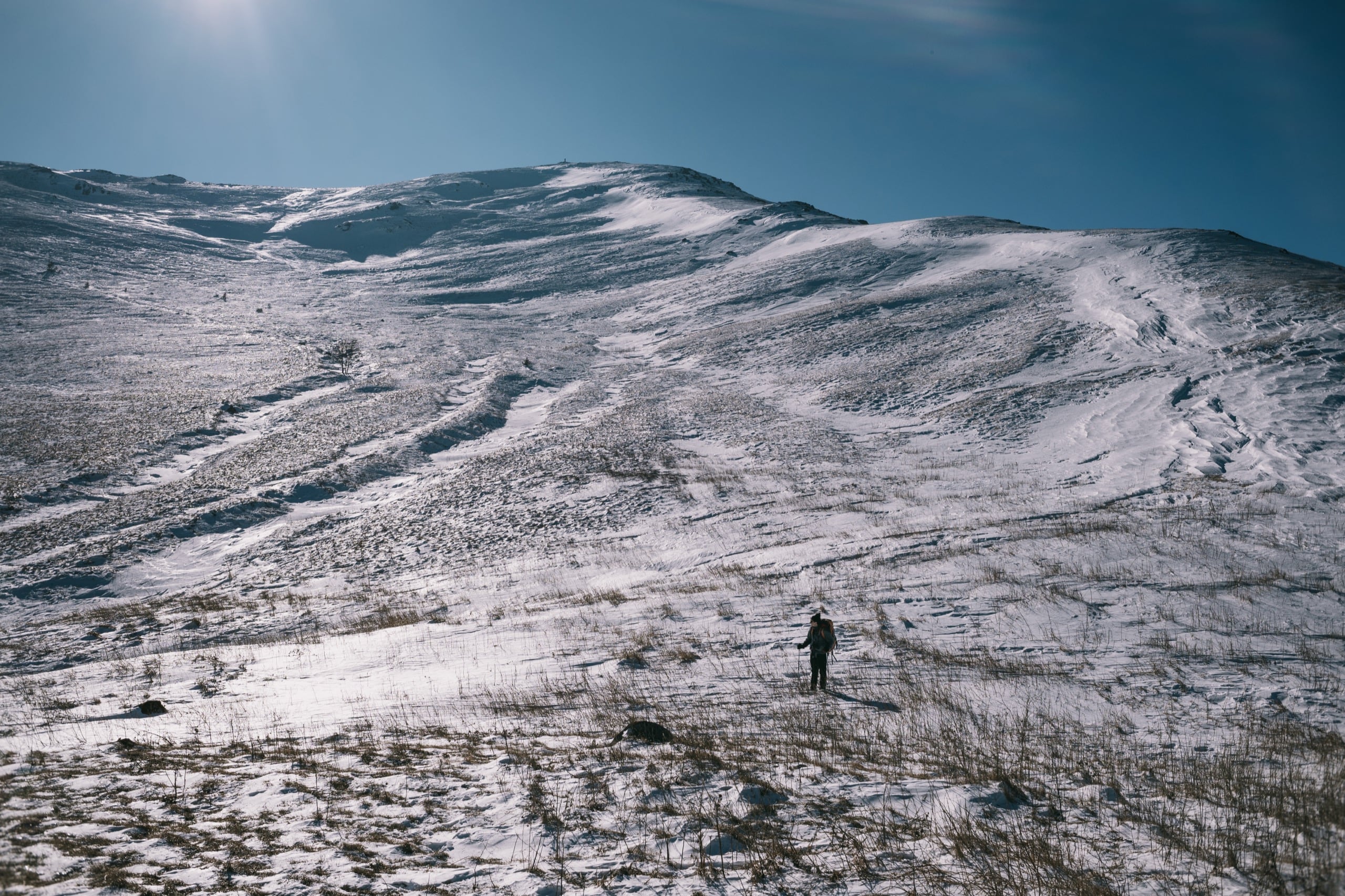 До неё оставалось чуть больше километра пути с набором высоты в сотню метров. Идти нужно было по преимущественно белой широкой площади вершинного гребня. И хоть бурая рябь высохшей травы подсказывала, что в основном снег не глубок, я решил всё-таки одеть гамаши и не прогадал.