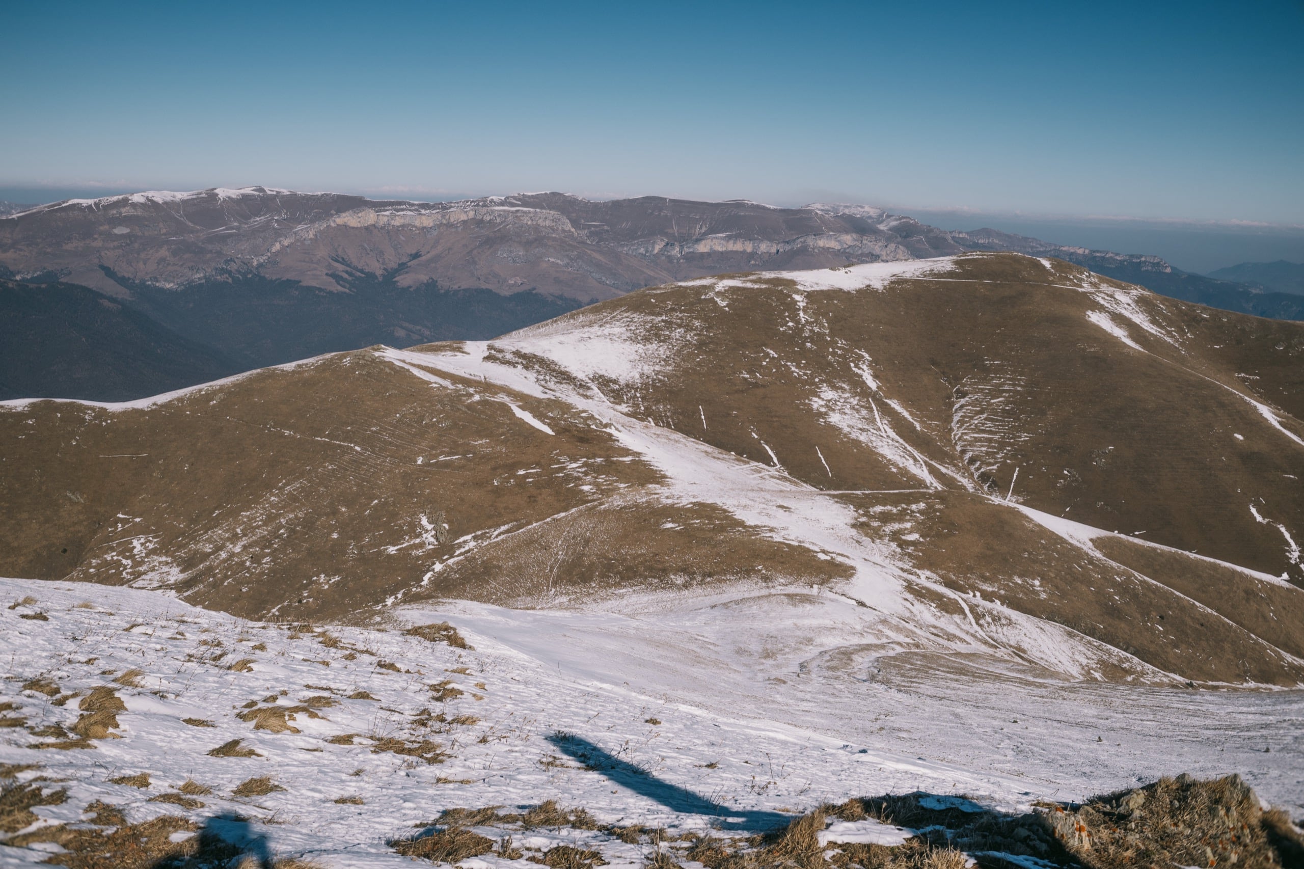 Сперва нам надо было спуститься с вершины Мец Маймеха на отрог, соединяющий гору с соседним Егджервасаром. И лежал он ниже, очень сильно ниже нас, а вёл к нему крутой заснеженный склон. И на нём хватало полностью белых, без рыжих пестрин участков. А это значит, что снега там прилично навалило.