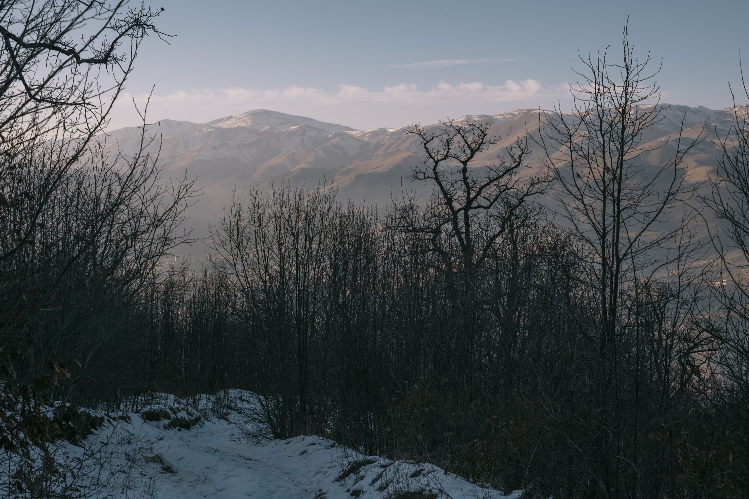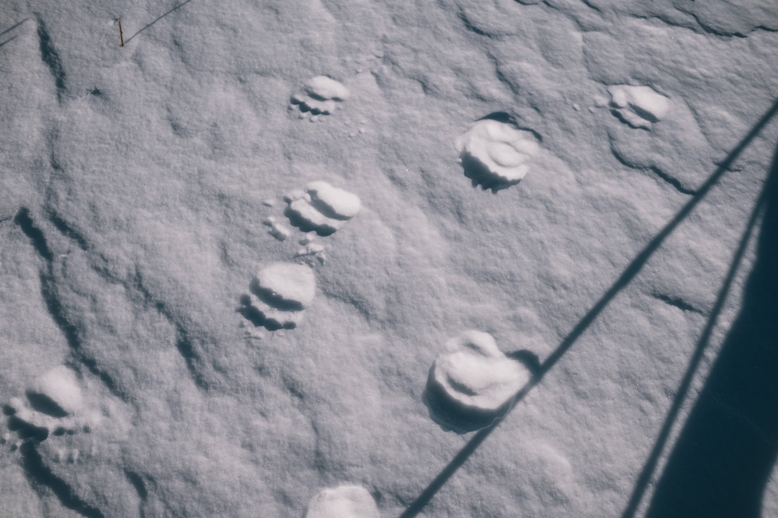Ещё по пути встречалось много следов. Летом сложно понять насколько активна дикая жизнь в этих горах, а зимой всё перед глазами: волчьи, лисьи, шакальи следы. Тонкие строчки мышиных перебежек — снег всё помнит. Обычных собачьих следов тоже хватало — бегают из деревень дворняги искать в горах приключений.