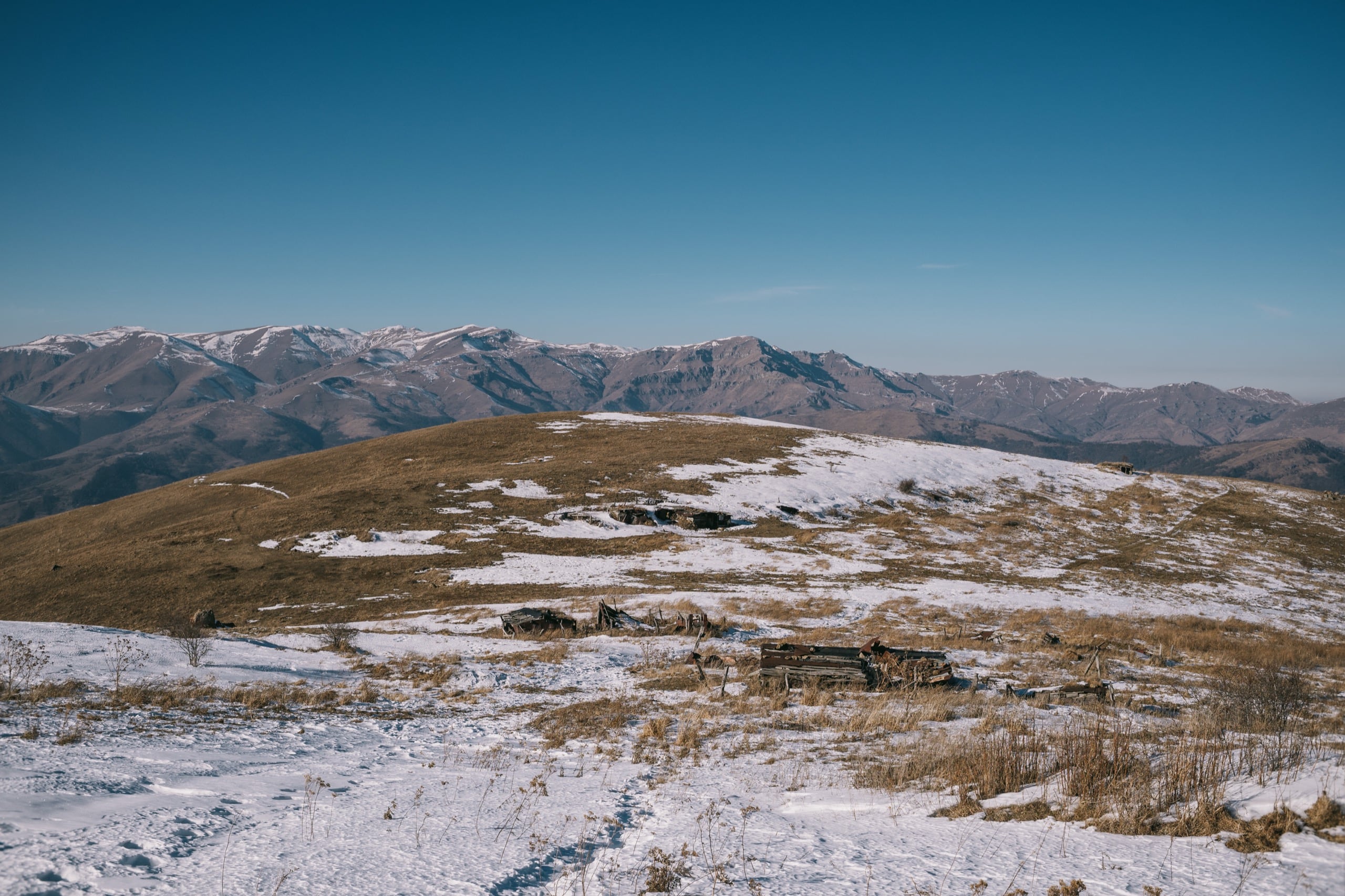 Этим склонам солнечных лучей хватало сполна, поэтому снега под ногами осталось не много, от этого темп спуска резко увеличился. Следующий километр мы преодолели за полчаса, сбросив по ходу дела ещё двести пятьдесят метров. И пришли в место, которое на гугл-картах значится как «Заброшенная деревня».