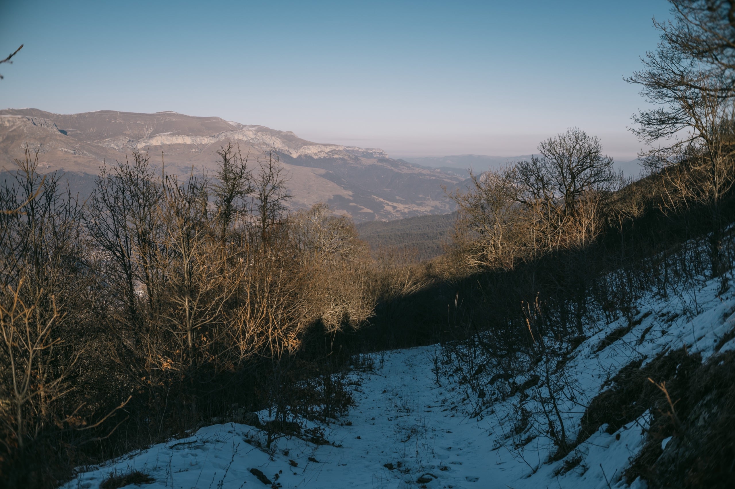 Пошли по заснеженной просёлочной дороге, что побежала в горы от перекрёстка у трассы. Большая часть подъёма на Мец Маймех прошла по ней. Заблудиться там сложно. Только в самом начале пути есть переплетение направлений, на котором можно сбиться с пути.