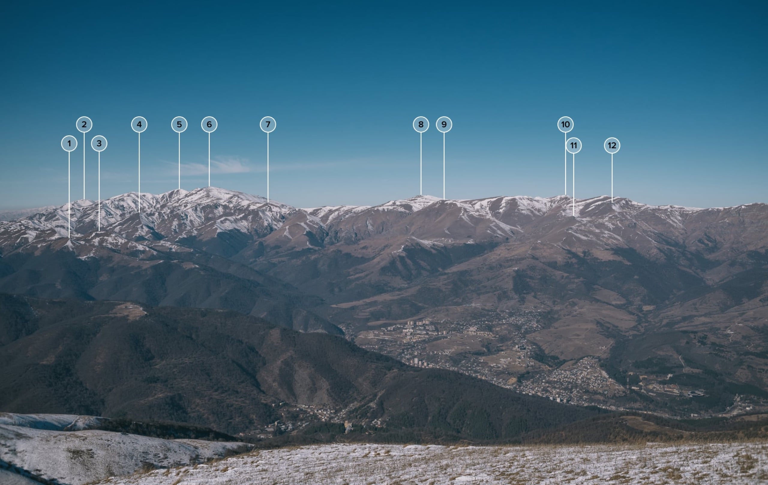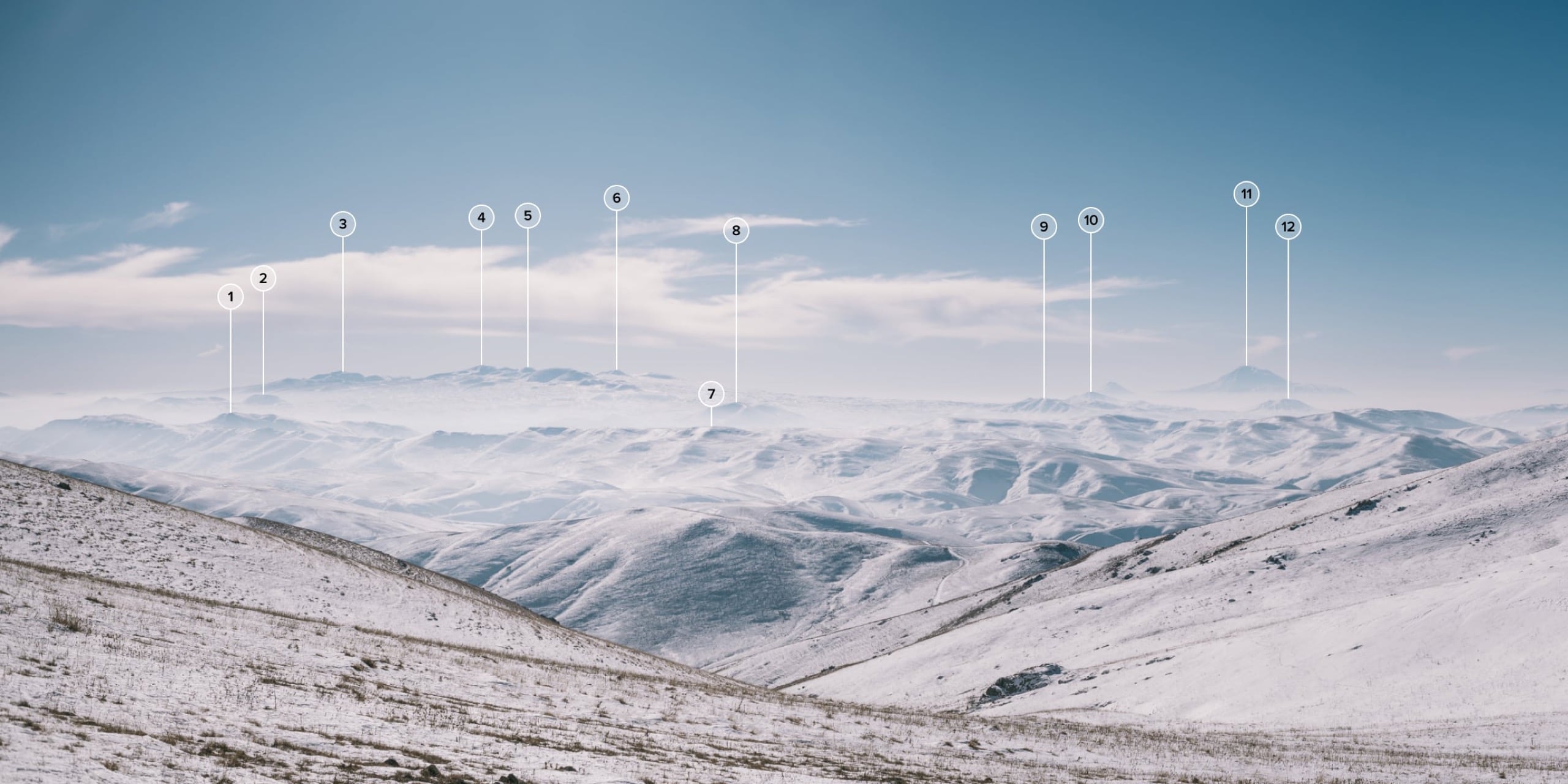 Схема 2. 1) г. Арджаноц, 2385; 2) г. Джанасар, 2328; 3) г. Бол. Спитакасар, 3560; 4) г. Аждаак, 3597; 5) г. Зап. Агусар, 3458; 6) г. Гехмаган, 3319; 7) г. Юхакар, 2381; 8) г. Бол. Лчасар, 2393; 9) г. Менаксар, 2399; 10) г. Хатис, 2521; 11) г. Арарат, 5165; 12) г. Гутанасар, 2300.