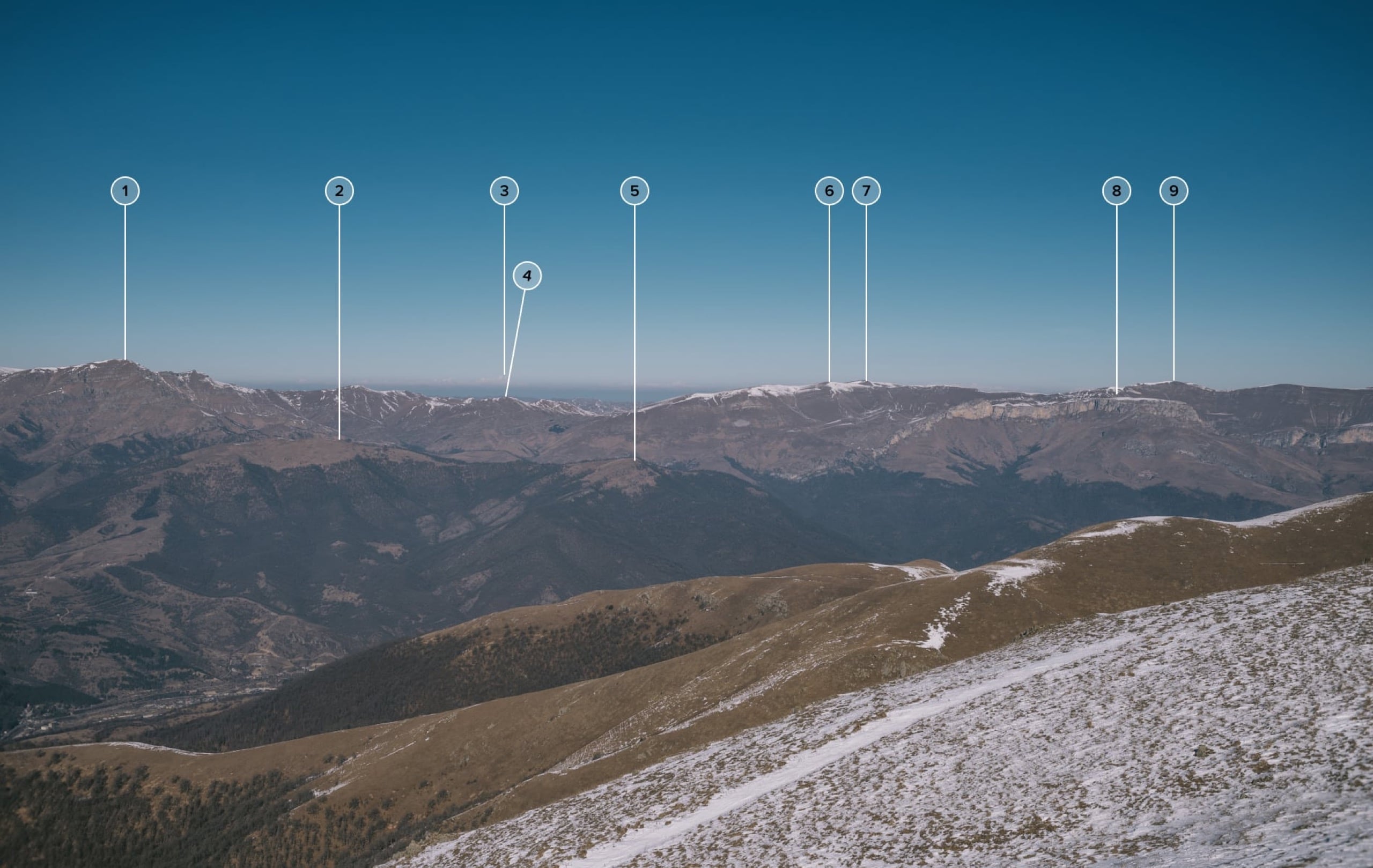 Схема 5. 1) г. Кхуир, 2638; 2) г. Агарцин, 2093; 3) г. Казбеги, 5054; 4) г. Кустакан, 2291; 5) г. Тклорсар, 1991; 6) г. Арос, 2491; 7) г. Иджеван, 2502; 8) г. Димац, 2378; 9) г. Сартсапат, 2532.