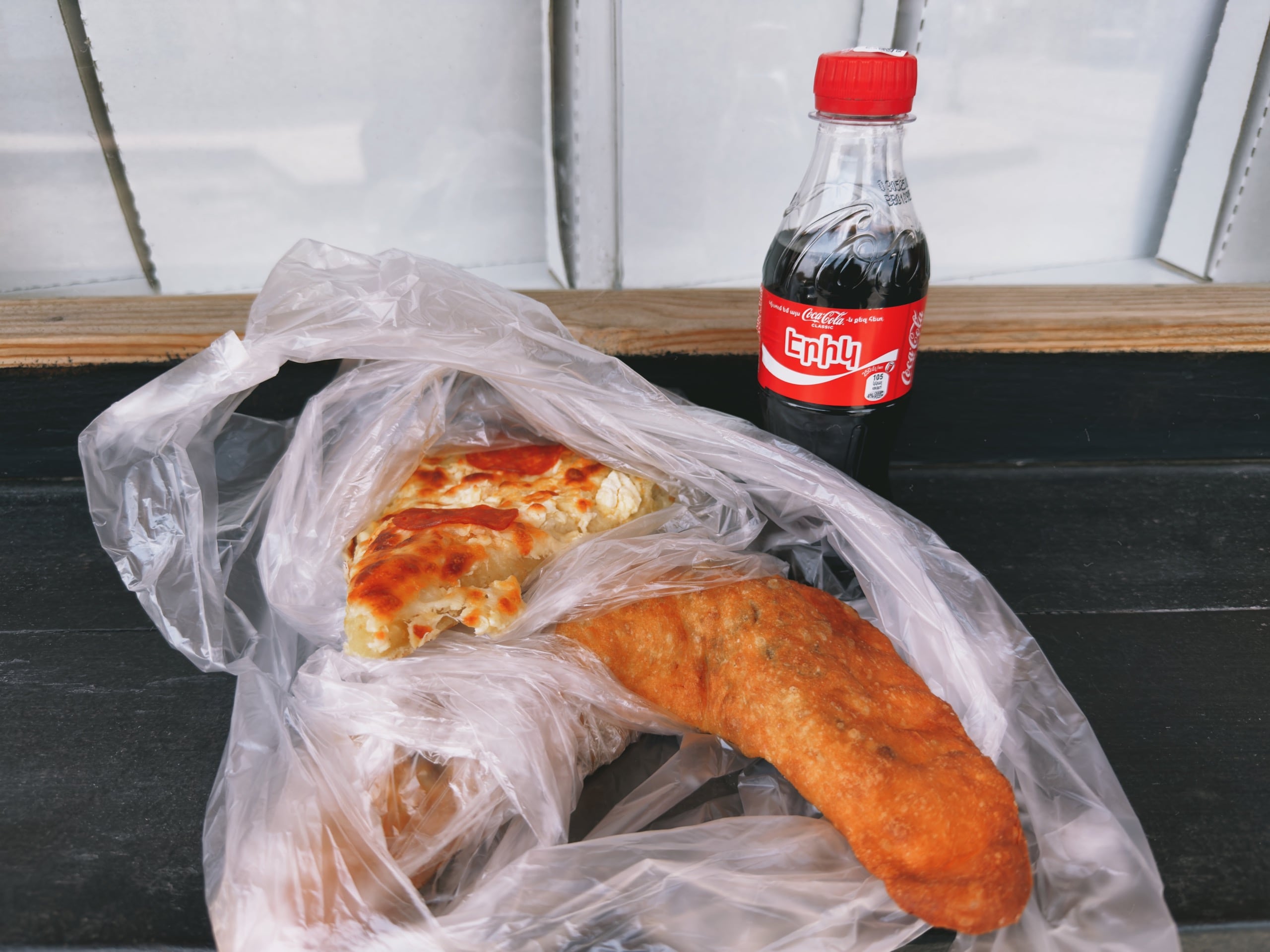 За кусочек пиццы я заплатил 350 драм (73 ₽ / $0,91), пирожок стоил 250 драм (52 ₽ / $0,65), а бутылочка «Кока-колы» объёмом 250 мл обошлась в 200 драм (42 ₽ / $0,53).