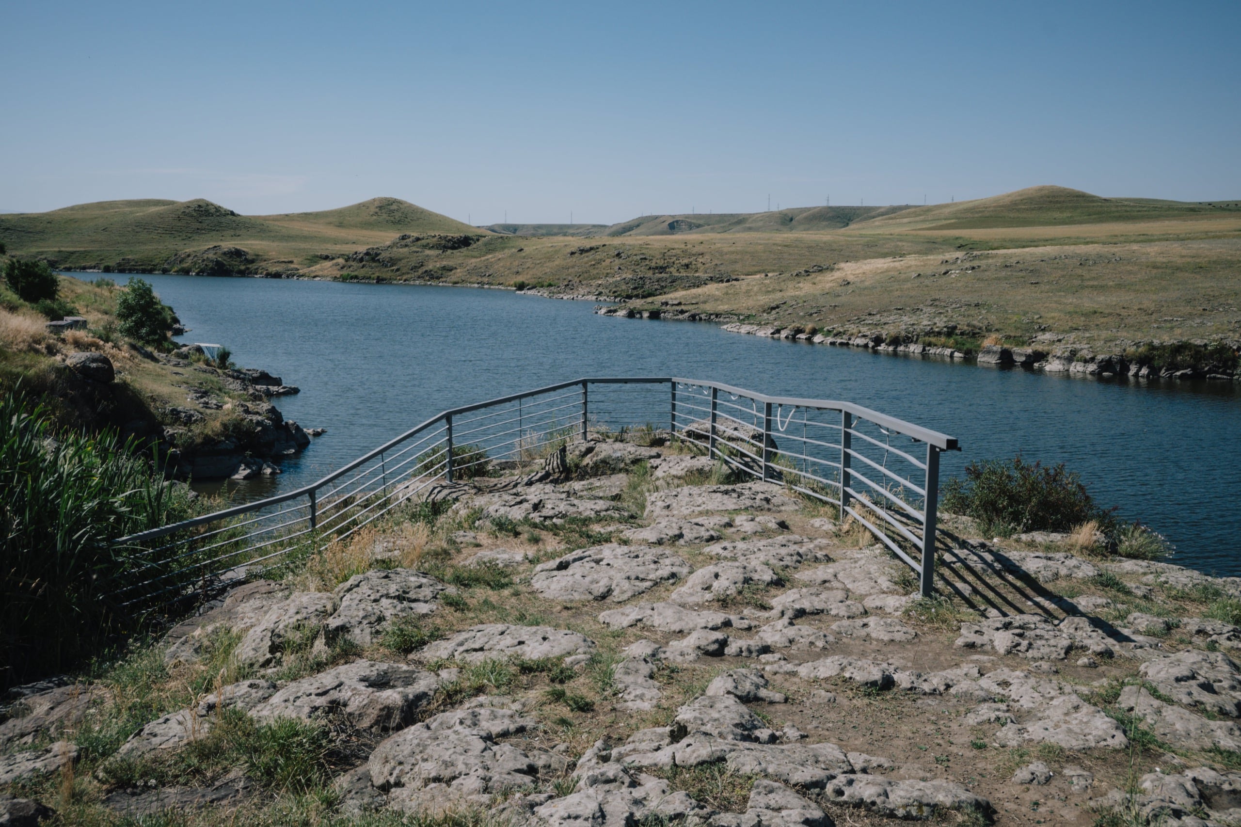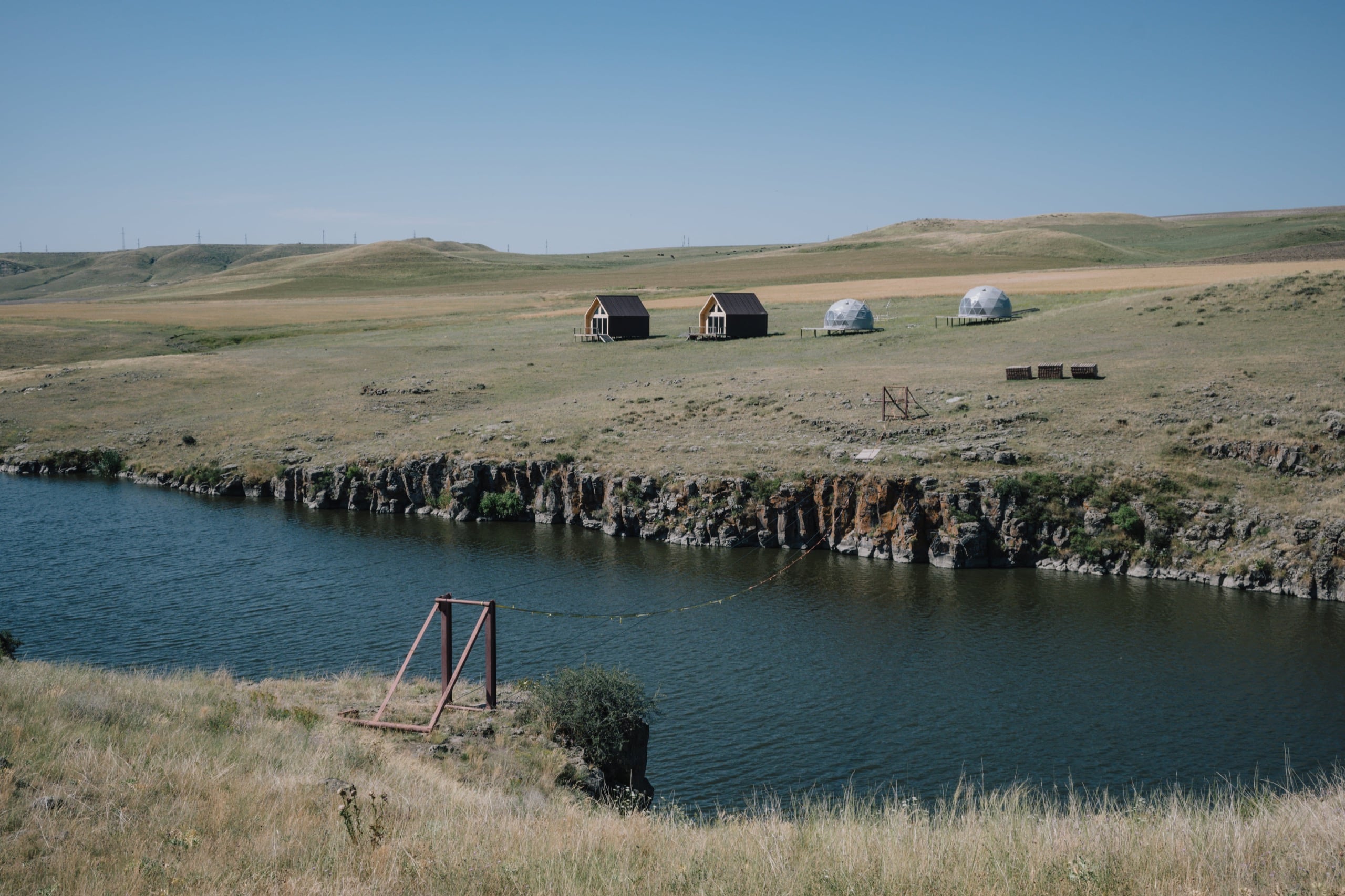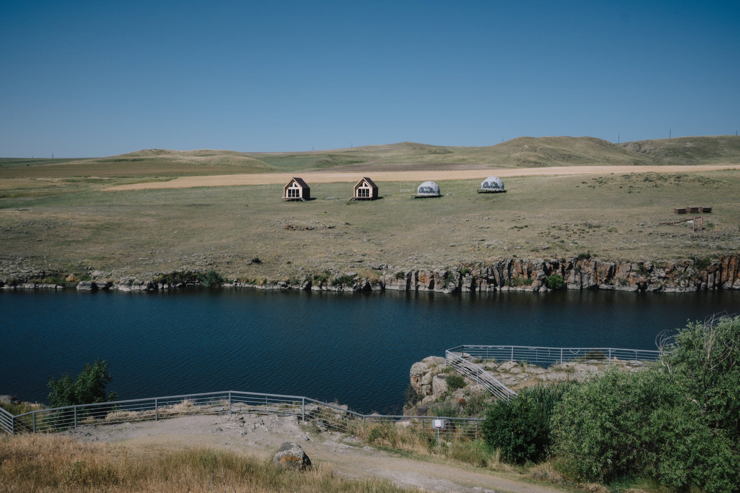 На фото выше можно заметить глэмпинг, который вырос на противоположном берегу. К нему тянут подвесной мост.