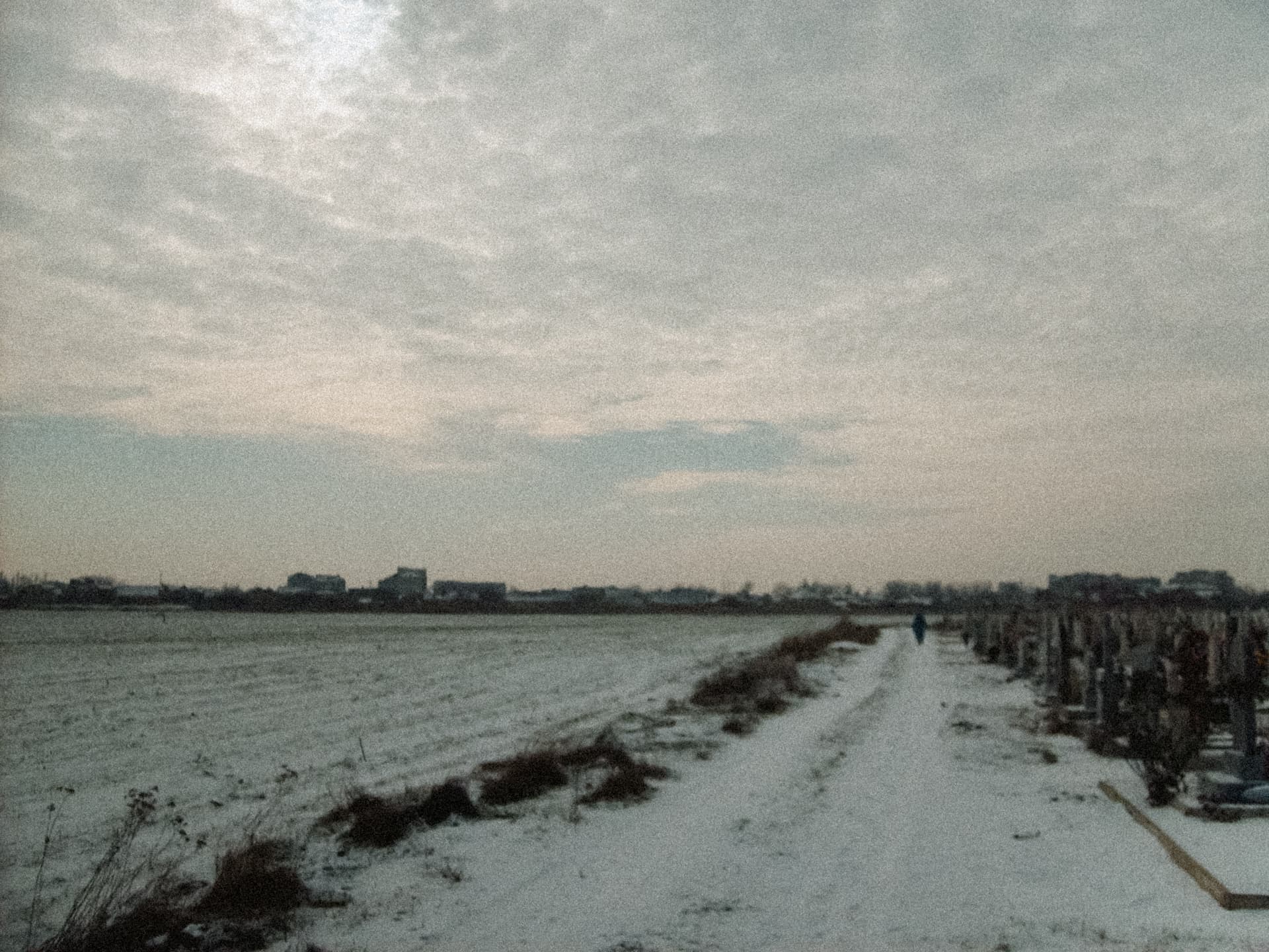 Собственно, окраина кладбища. Справа могилы, слева поле, далеко впереди вперемешку городские кварталы и какие-то аэродромные постройки.