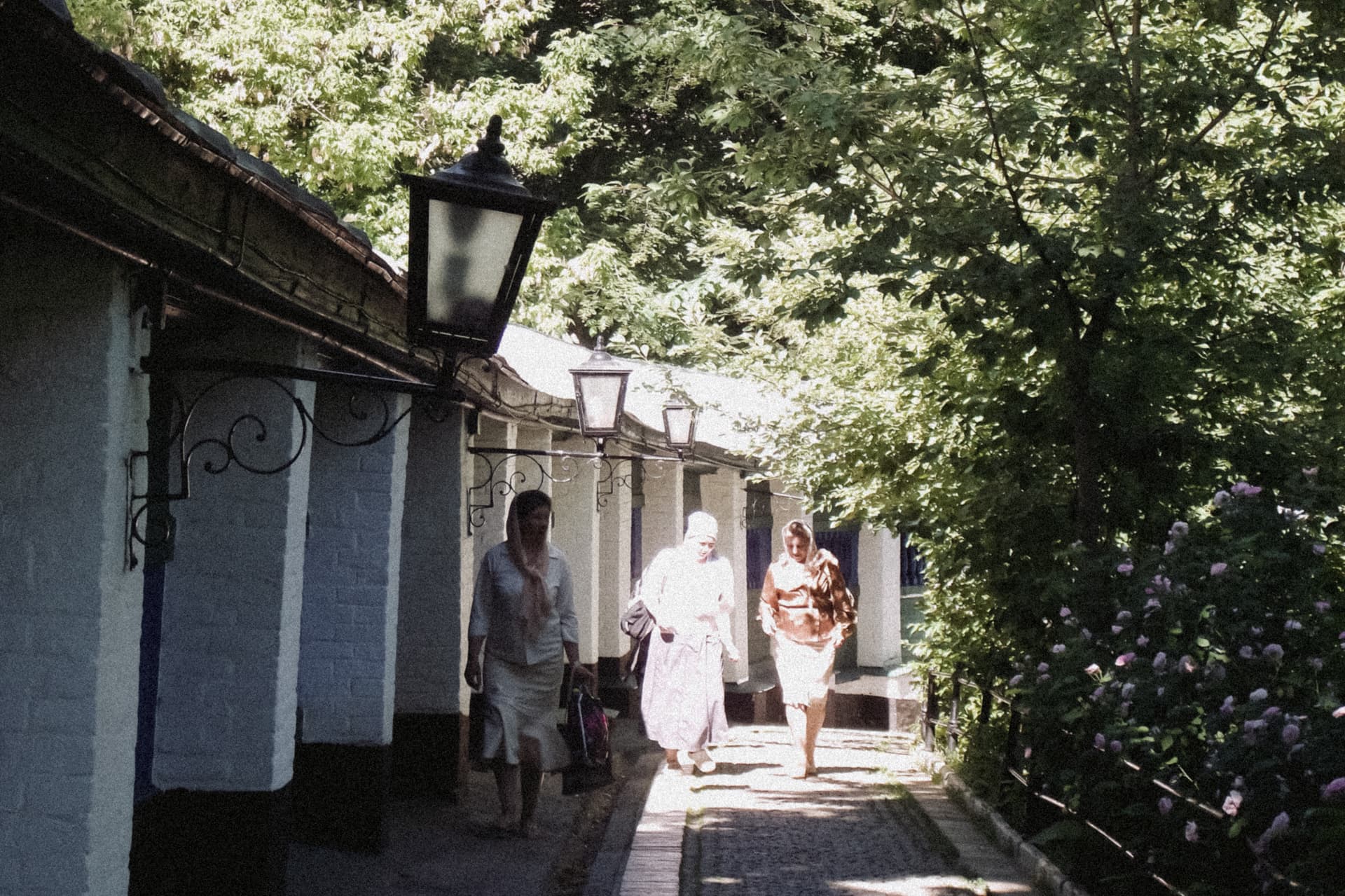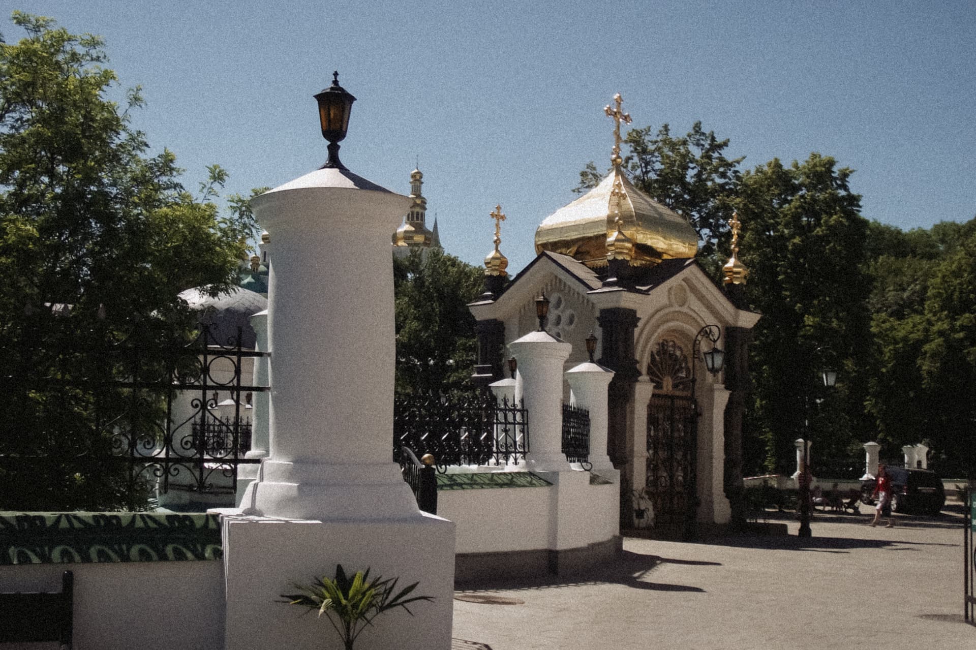 Вид от главных ворот на Церковь Зачатия Анны на Дальних Пещерах и Церковь Рождества Богородицы.