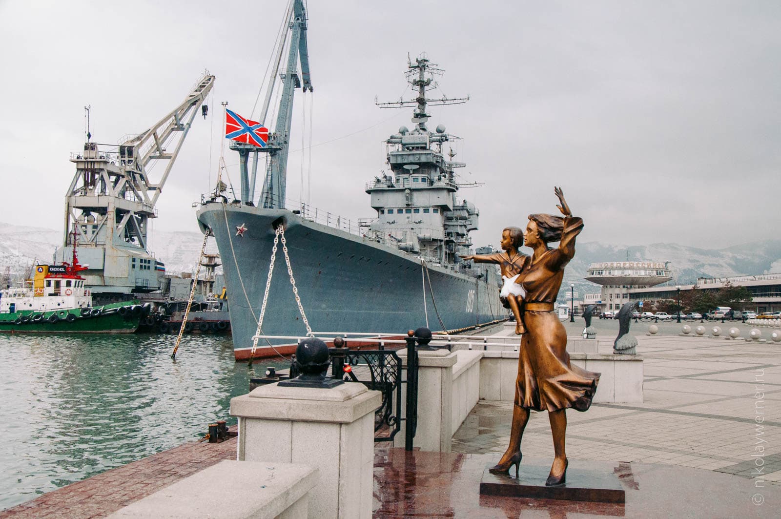 Дальше путь лежал на центральную набережную. На вечном приколе стоит махина крейсера «Михаил Кутузов». Говорят, что его огневой мощи хватит чтобы за 3 часа сровнять с землей весь Новороссийск.