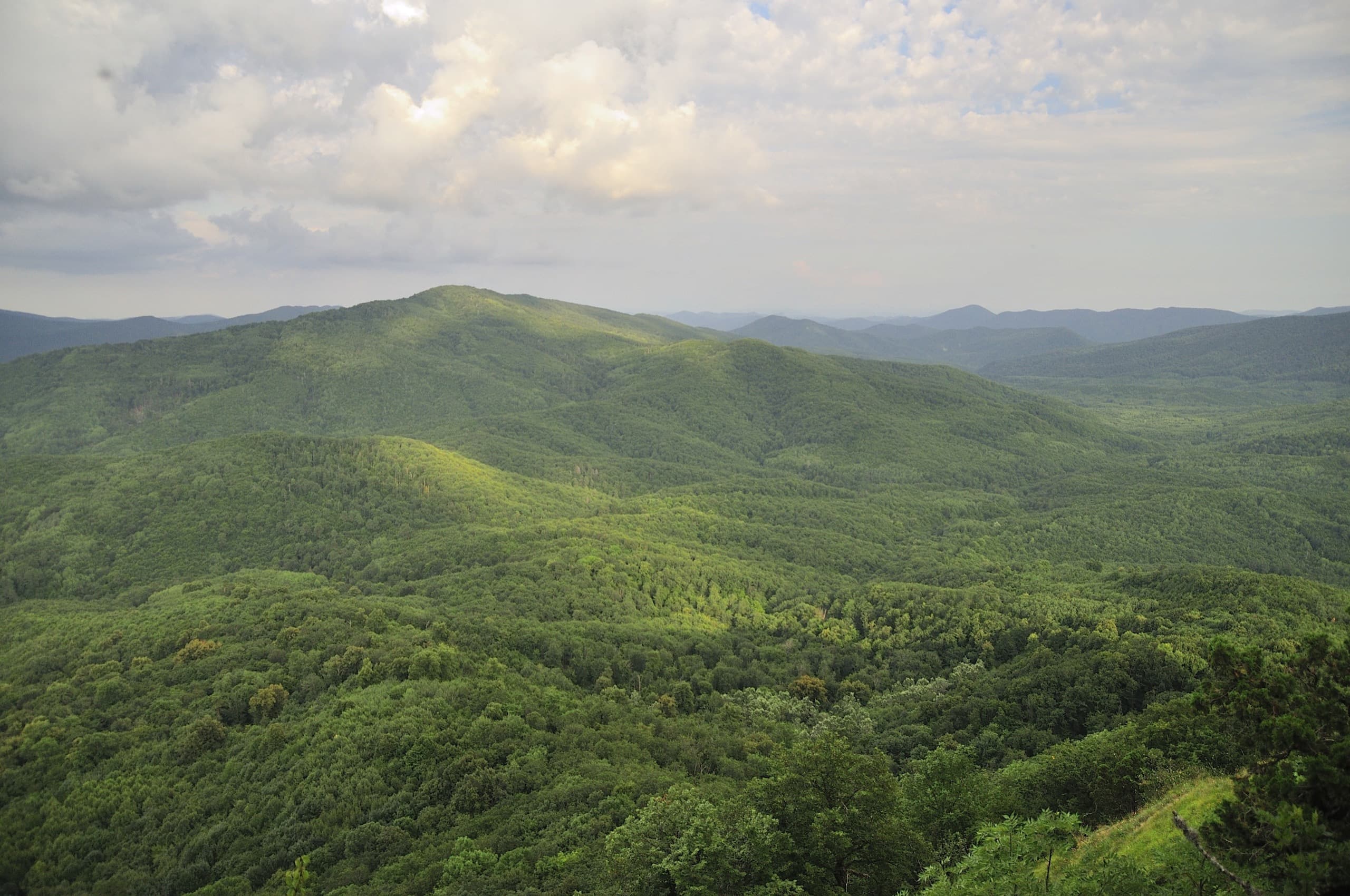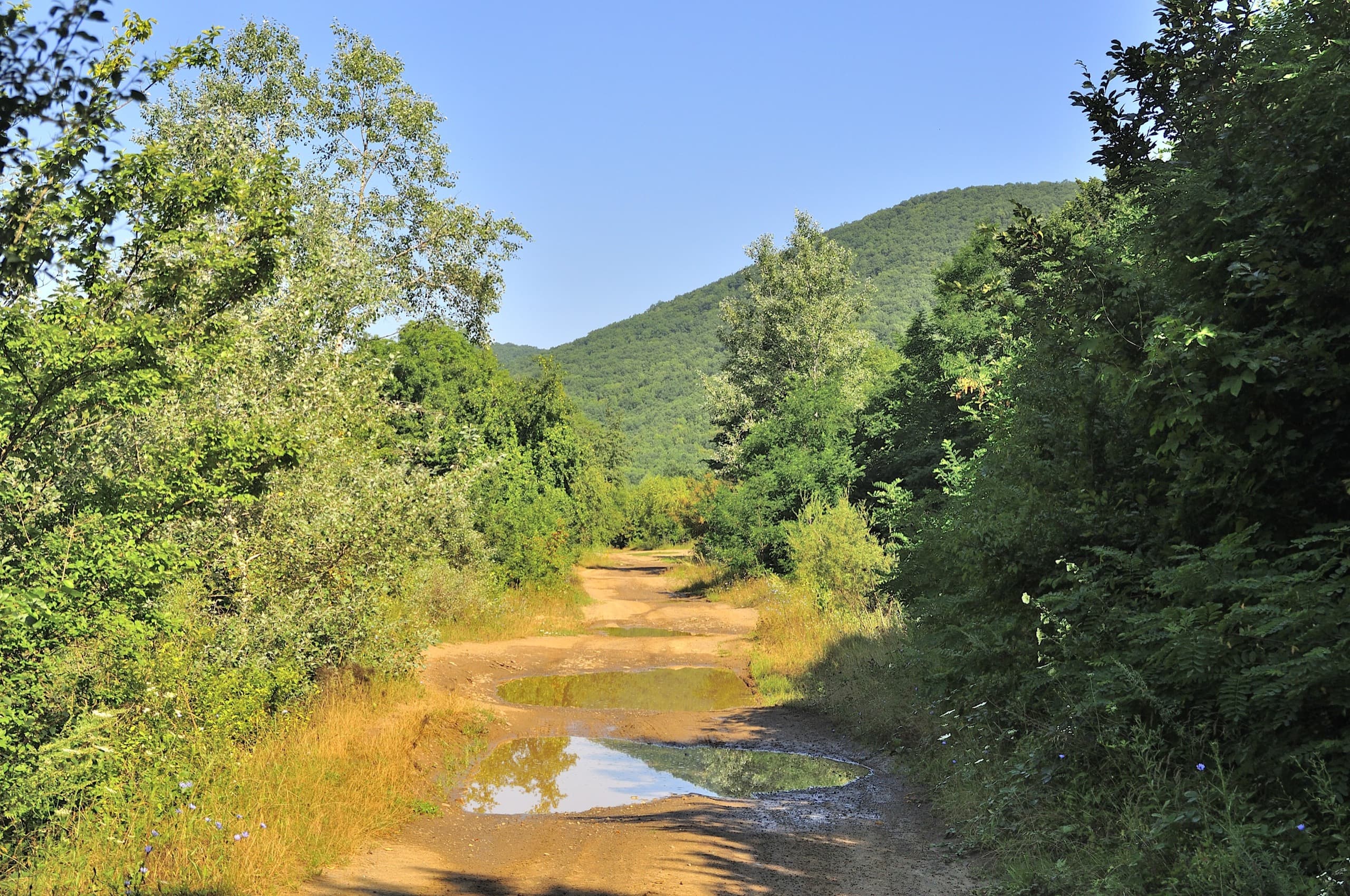 Лес, дорога, лес, дорога, лес дорога, «Нива» пролетела, подняла облако пыли, и снова — лес, дорога, лес, дорога... На полпути к Дубраве открылся симпатичный вид. Дорога забирает выше, склон обрывается, лес разрывается и получается милая обзорная площадка, с которой видно долину Убина, гору Шишан, высотой в 554 метра и Мачмалов хребет. Помнится, в апреле мы выбирались в это место поматрасить в первые тёплые весенние дни, когда лес только начал примерять зелёное платье. Тот вид был интереснее: сквозь голые кроны проглядывалось русло Убина, коричневые камни и земля играли со свежей зеленью и всё это заправляло сочное синее небо. А в июле тоже красиво, но не так — сверху тусклая синева, снизу зелень и дневной летний свет делает всё плоским.