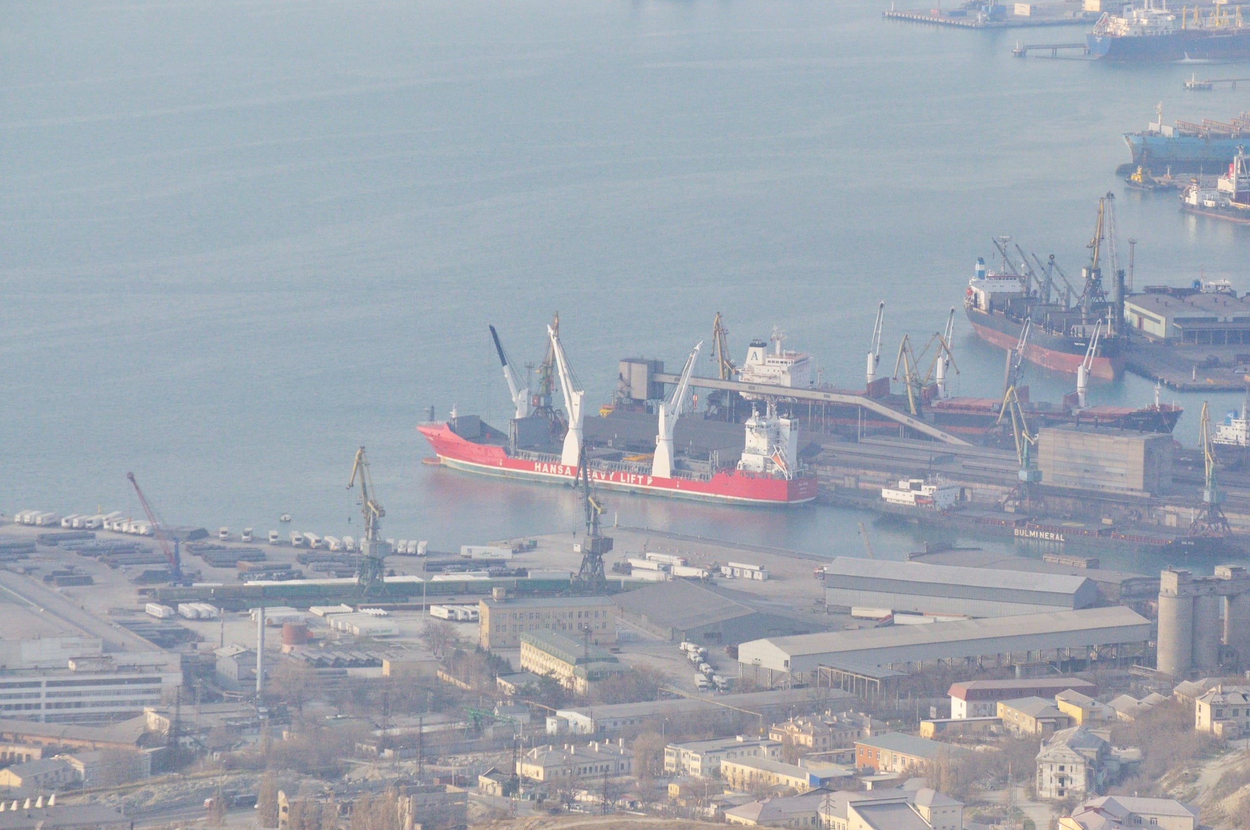 Взгляду открылась мощная индустриальная панорама: забитая кораблями бухта, портовые сооружения с их складами, ангарами, «удочками» портовых кранов, вылавливающих с подходящих сухогрузов богатый улов контейнеров и прочих грузов и, наконец, изрезанные карьерами склоны хребта.