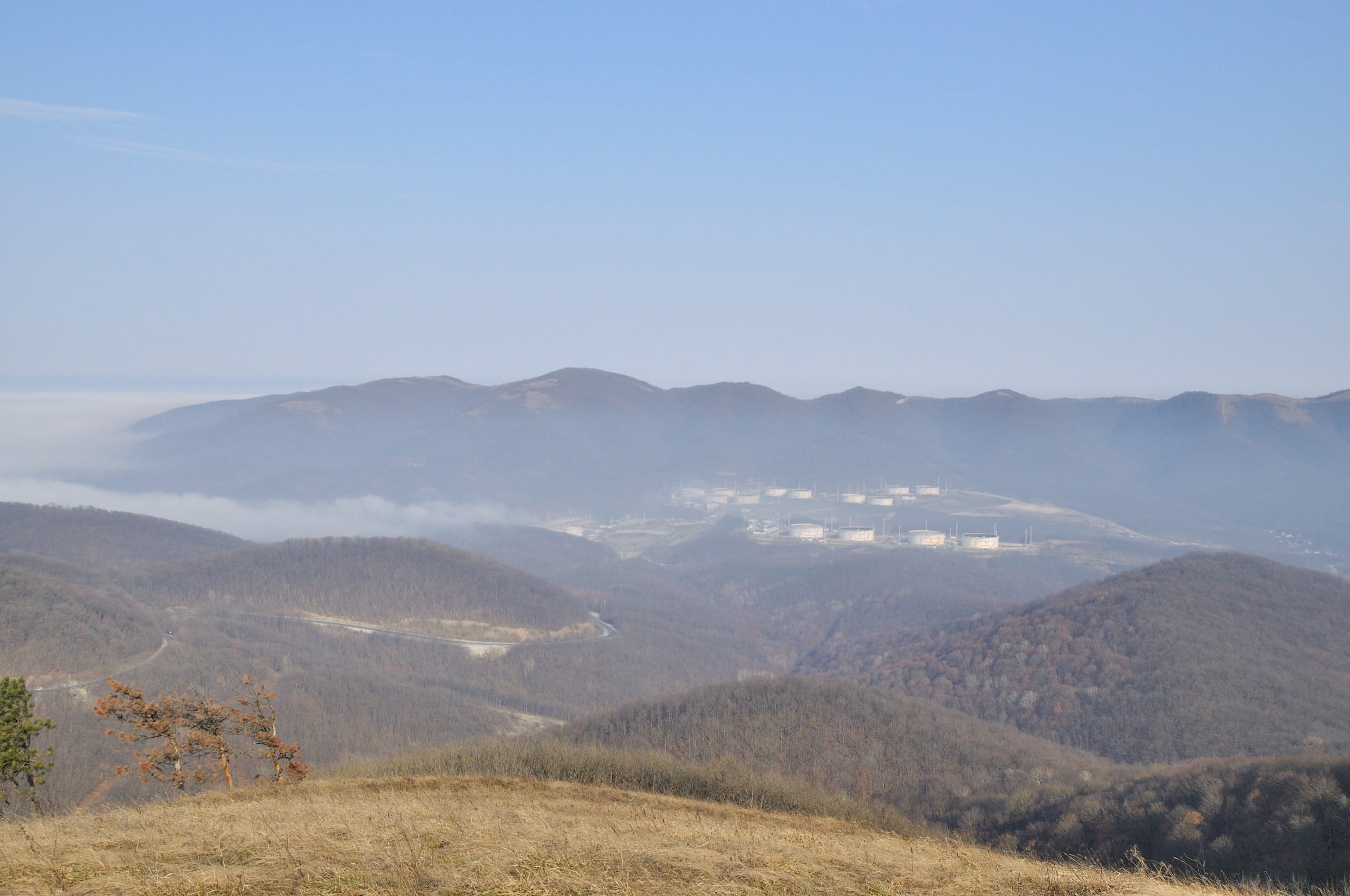 Вид с площадки у ресторана, конечно, крут, но нас заинтересовала лысая безымянная вершина, подпирающая перевал с востока, на неё ведёт тупиковая дорога. Решили сделать крюк и забраться — оно того стоило, если вы когда-нибудь будете здесь, не поленитесь потратить полчаса своего времени, зайдите на эту высоту — вид с Семи ветров нервно курит в сторонке. На 330 градусов разворачивается потрясащая панорама: от нефтебазы Грушевой и стоящих за ней гор Купиева, Шриль, Еременкова, через всё ещё залитую туманом (полдень, однако) долину Богаго, к Сахарной голове, Андреевскому перевалу и дальше к Новороссийску и Цемесской бухте.