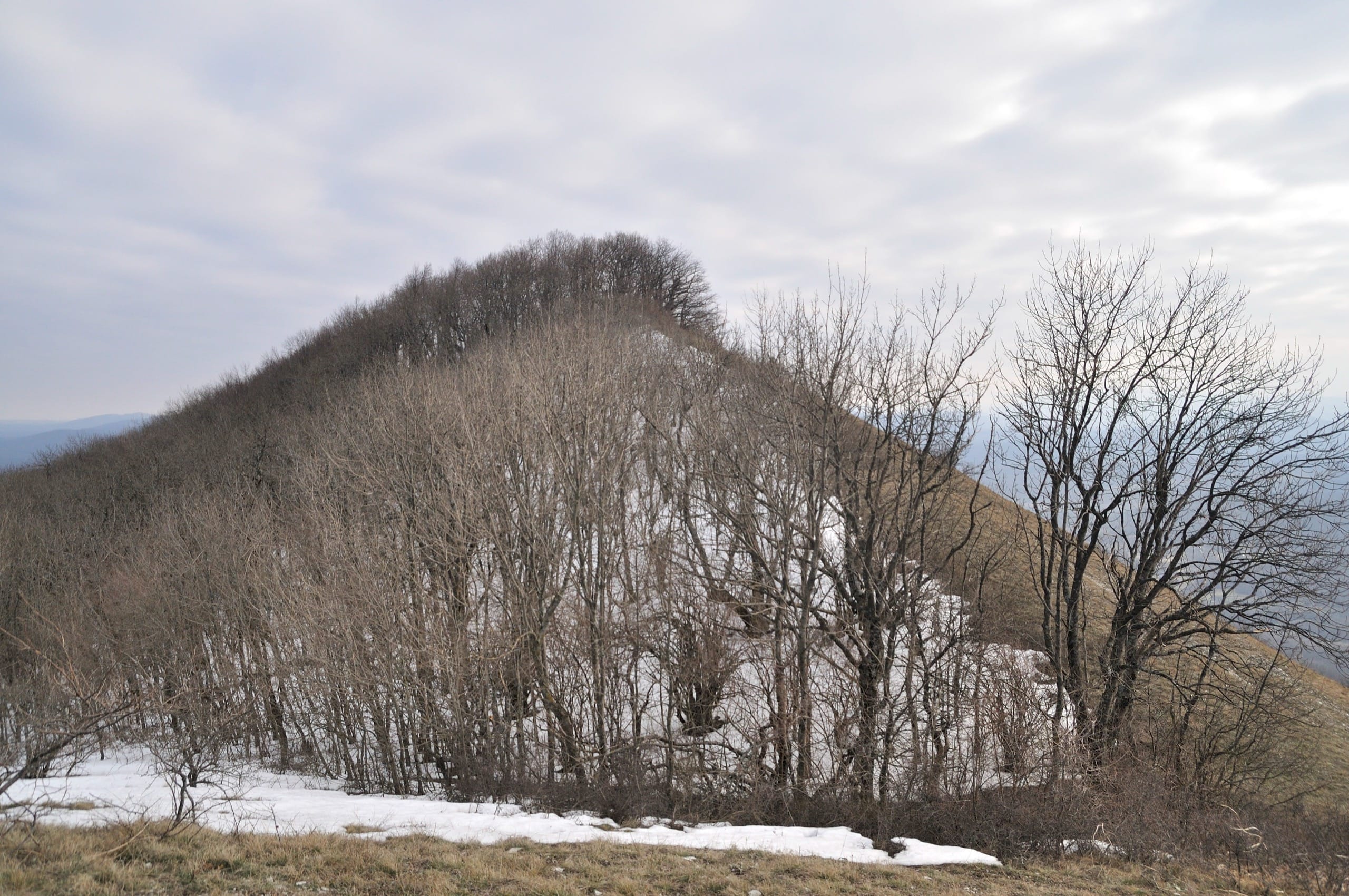 После чая с шоколадкой пошли дальше. Узкая, едва различимая тропинка повела вдоль гребня горы: по левую руку крутой склон, почти обрыв; по правую небольшой подъём, лес на гребне и северный склон на той стороне. Кстати, на южном склоне от снега не осталось и следа: голые камни, сухая трава и ничего белого.