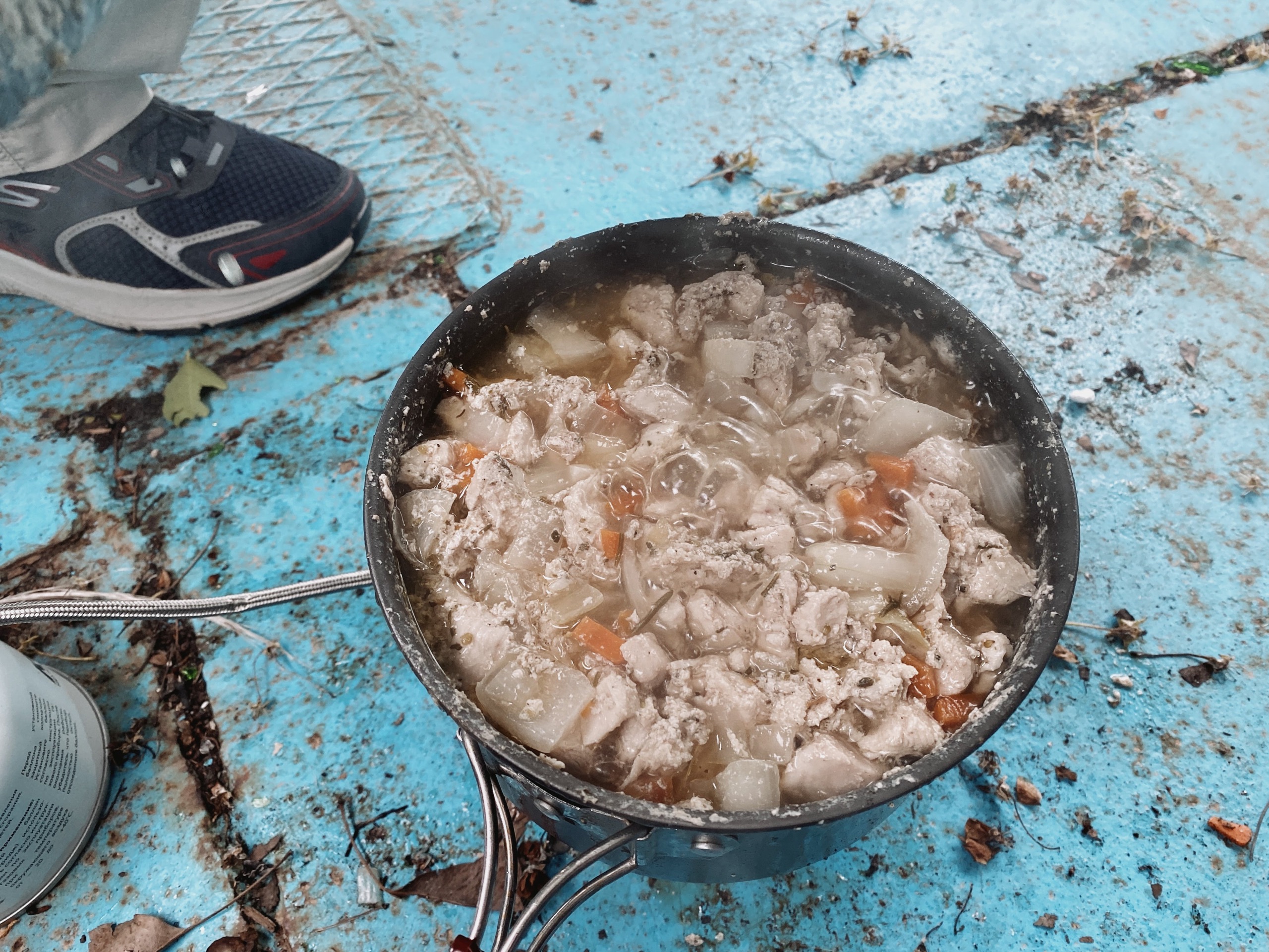 Чтобы ветер не задувал пламя горелки, тушить курицу пришлось на полу, согнувшись в три погибели.