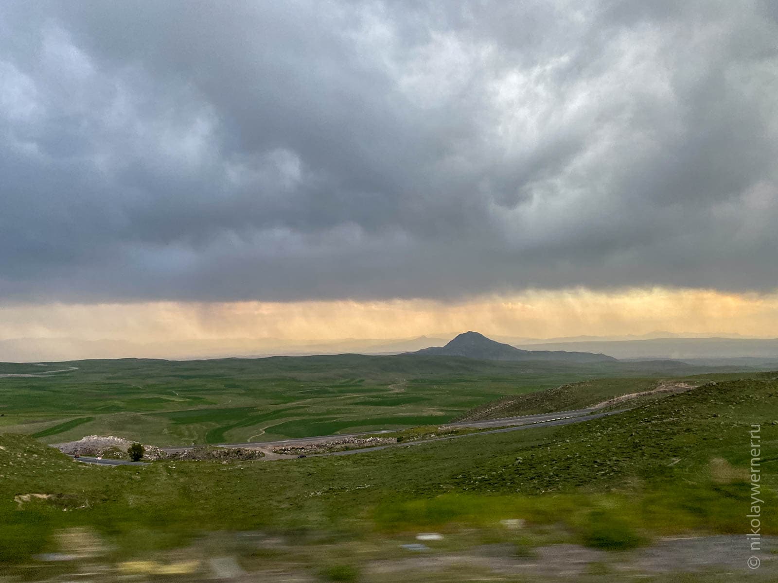В пути нас сопровождали рассечённые оврагами и балками холмистые равнины, плавно тускнеющие по мере приближения к Еревану. Во многих местах они усыпаны камнями, рассечены разной величины скалистыми обнажениями. Вдали от жилья камни в основном природного происхождения, ближе к человеку встречаются пятна строительного мусора.