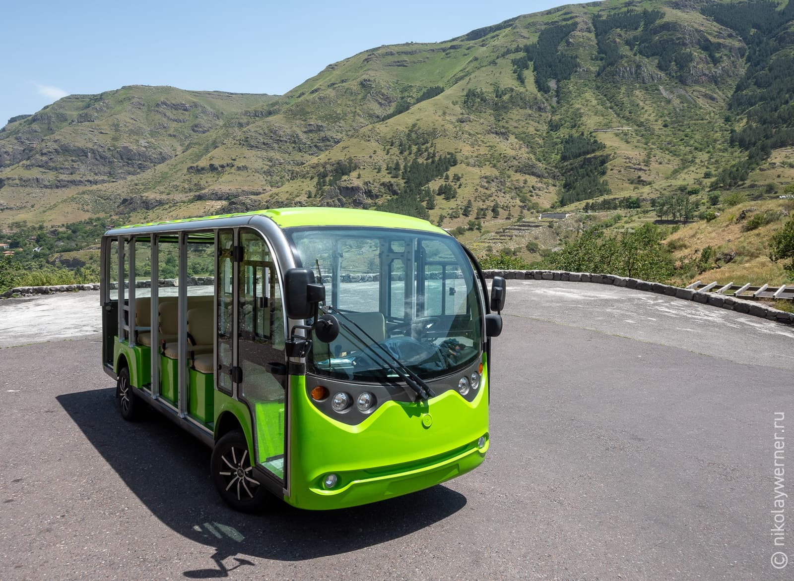 А теперь вернусь к тому, что увидел я в Вардзии. Во-первых, в дополнение ко входному билету мы взяли билеты на вот такой электробус, который возит туристов наверх. Идти в гору по лютой жаре не было никакого желания.