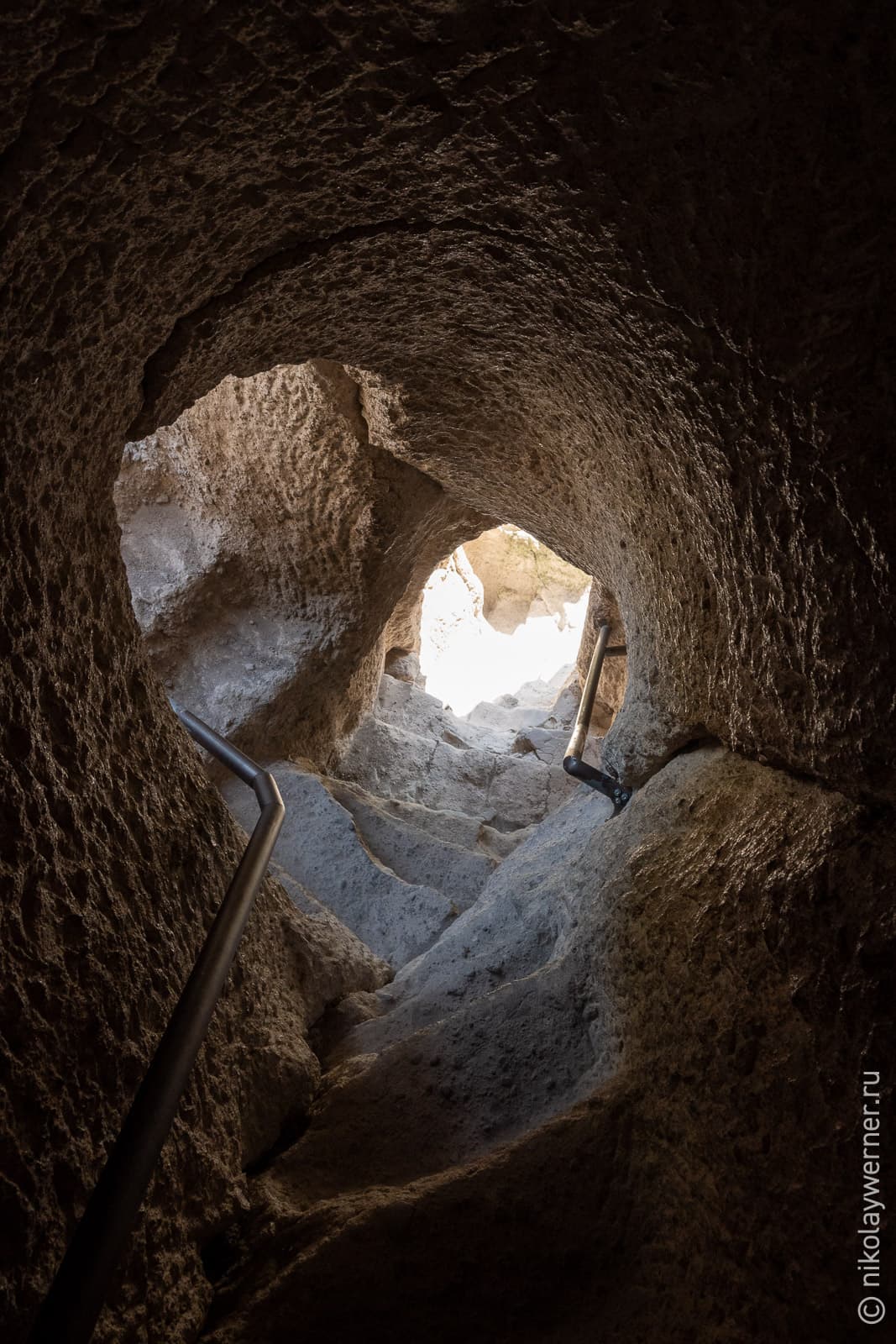 Когда-то давно в этих пещерах жили, трудились, молились люди. Без гида, не всегда можно понять для чего служили те или иные углубления и вырезы. Но здесь, мне кажется, ясно: длинный желоб, прорезающий стены и потолок скорее всего помогал пополнять запасы воды за счёт конденсата.
