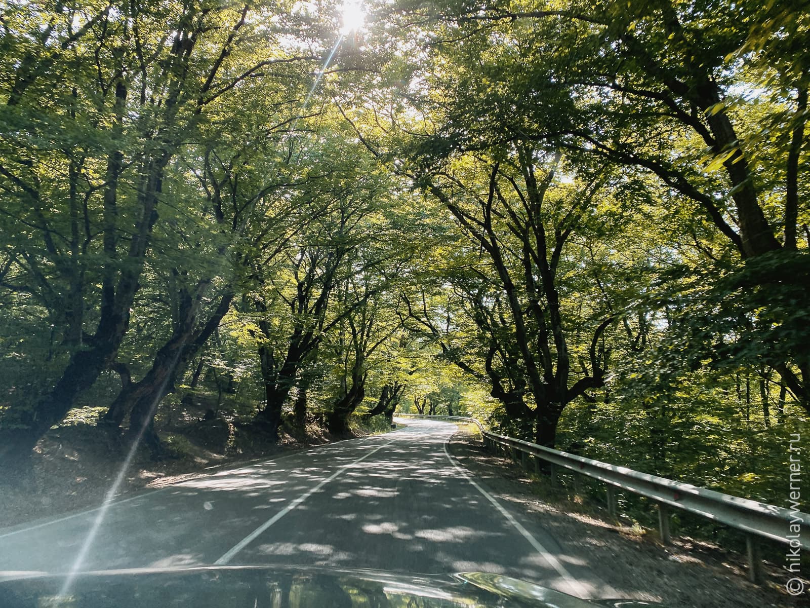 Сперва нужно по извилистому серпантину спуститься в Алазанскую долину, к подножию Кахетского хребта оттуда шоссе проведёт вдоль его подошвы на северо-восток, к Телави.