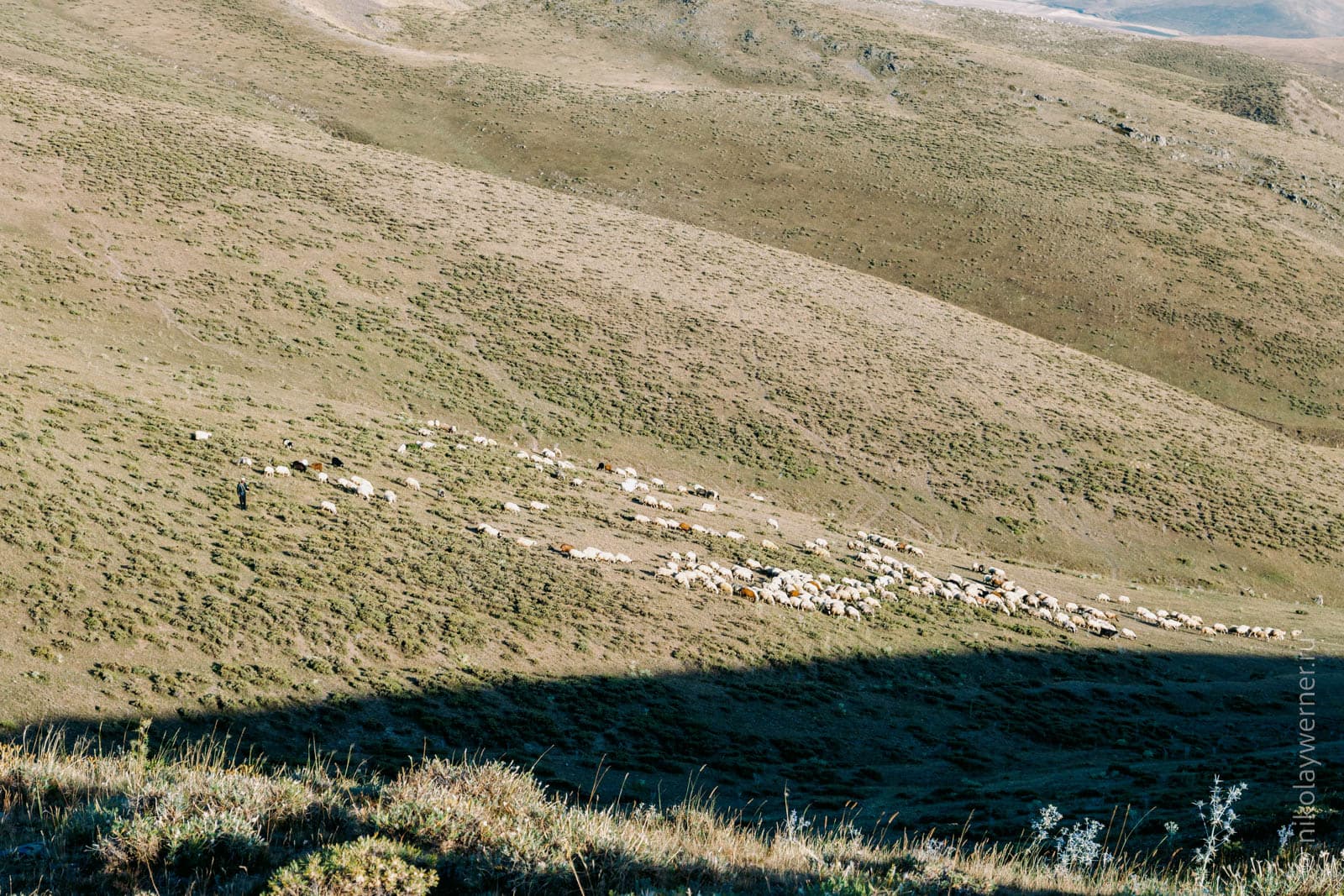 На склоне по маршруту встретили отару овец. Пастух, вот где физическая форма, в две минуты поднялся к нам из долины и мы немного поболтали. Мне особенно было интересно выяснить как обстоят дела со зверем в этих краях. Пастух сказал, что медведь очень редкий гость — его края далеко. А вот волки захаживают регулярно. Без оружия они овец в горы не водят.