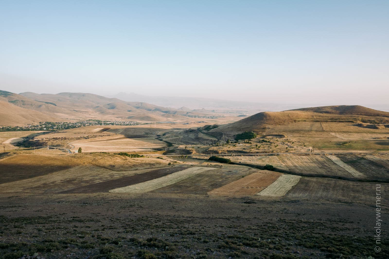 Настала пора спускаться вниз. Впереди видна дорога, которая справа прибегает из деревни Лернут, пересекает железную дорогу и раздваивается: налево в село Джаджураван, направо в село Ширак. А впереди левее на снимке деревня Джаджур, родина известного армянского художника Минаса Аветисяна.
