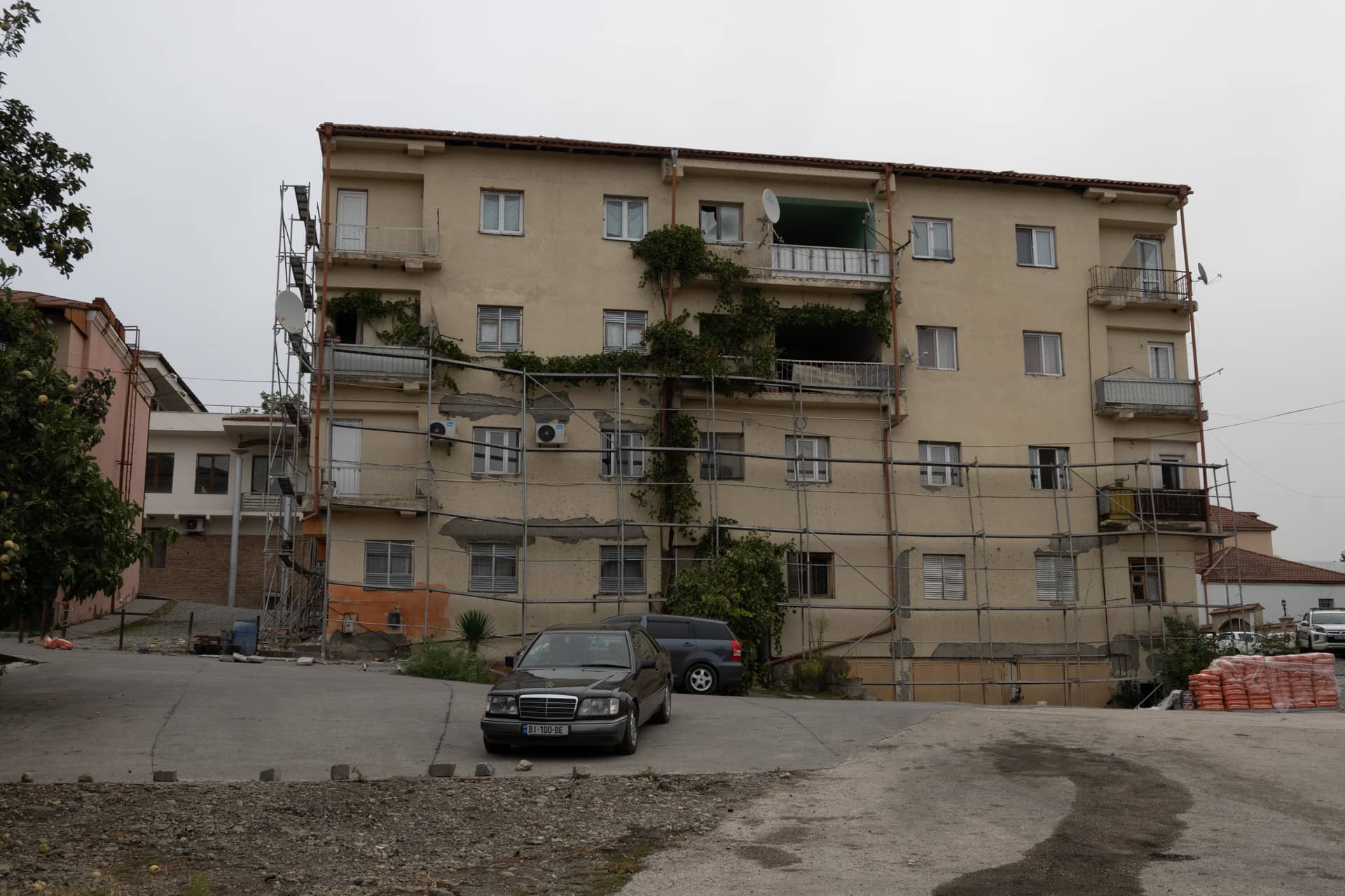 Красивый многоквартирный дом, вид сзади. Неопрятный, но судя по строительным лесам это дело поправляли.