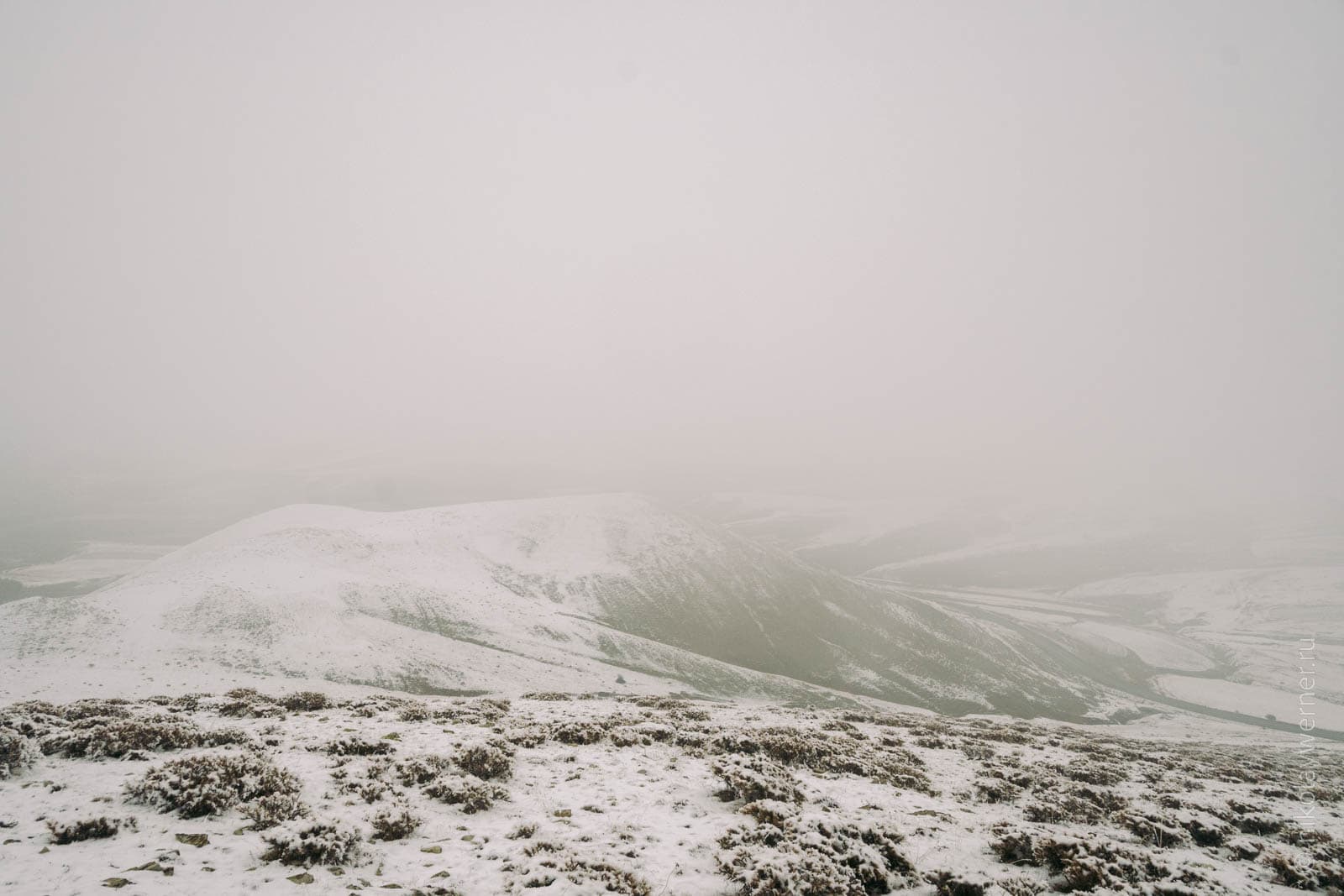 С первой горы открылись хорошие виды на монохром окрестных склонов. К этому моменту облака начали давить и успели «съёсть» некоторые вершины.