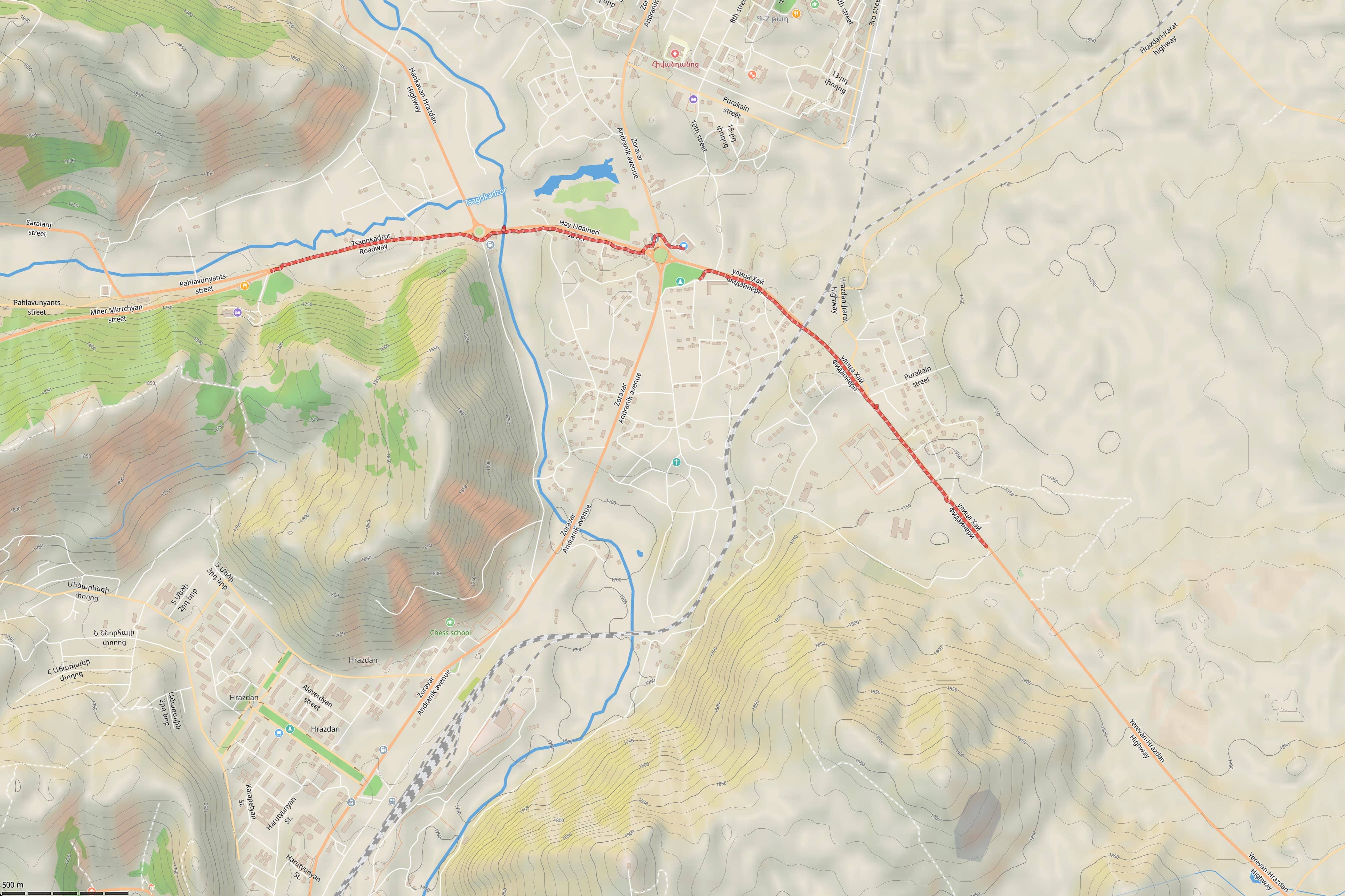Она кончается за перешейком, где начинается длинный проспект Зоравара Андраника. Идти пешком по нему всё так же неудобно: четырёхполосная автомагистраль, у которой поначалу, не то что тротуара, на обочину намёка нет!