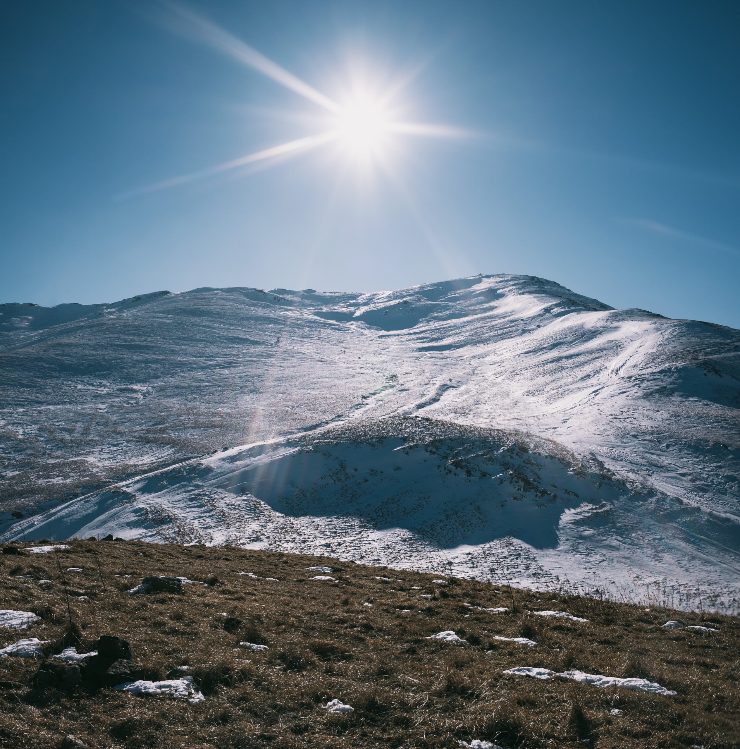 До неё оставалось чуть больше километра пути с набором высоты в сотню метров. Идти нужно было по преимущественно белой широкой площади вершинного гребня. И хоть бурая рябь высохшей травы подсказывала, что в основном снег не глубок, я решил всё-таки одеть гамаши и не прогадал.