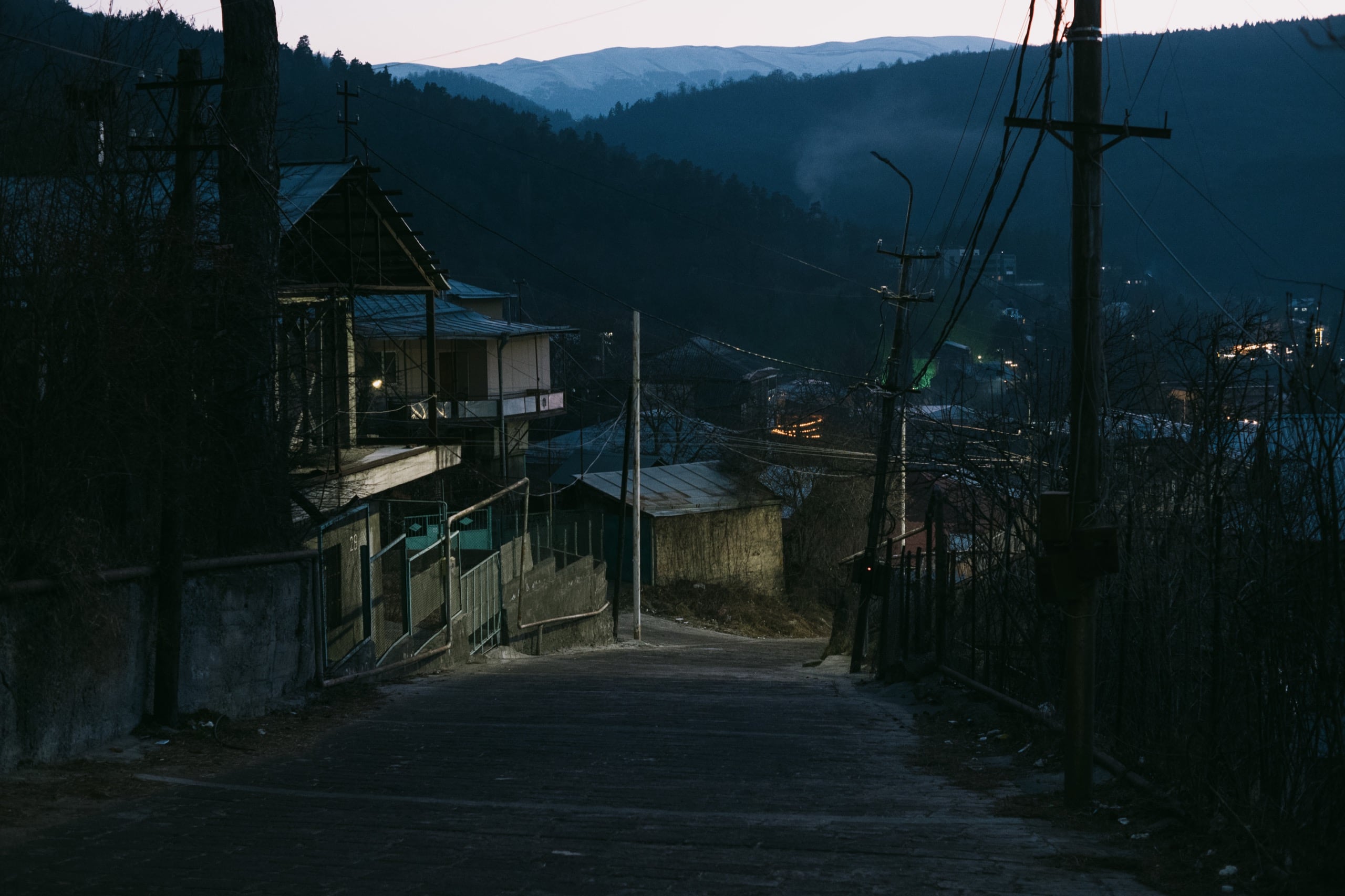 В город зашли за минуту до заката — в 17:35. К этому моменту нас окружил сумеречный полумрак и только маленький розовый зайчик на макушке горы Кхуир подсказывал, что светило за горизонт ещё не закатилось.